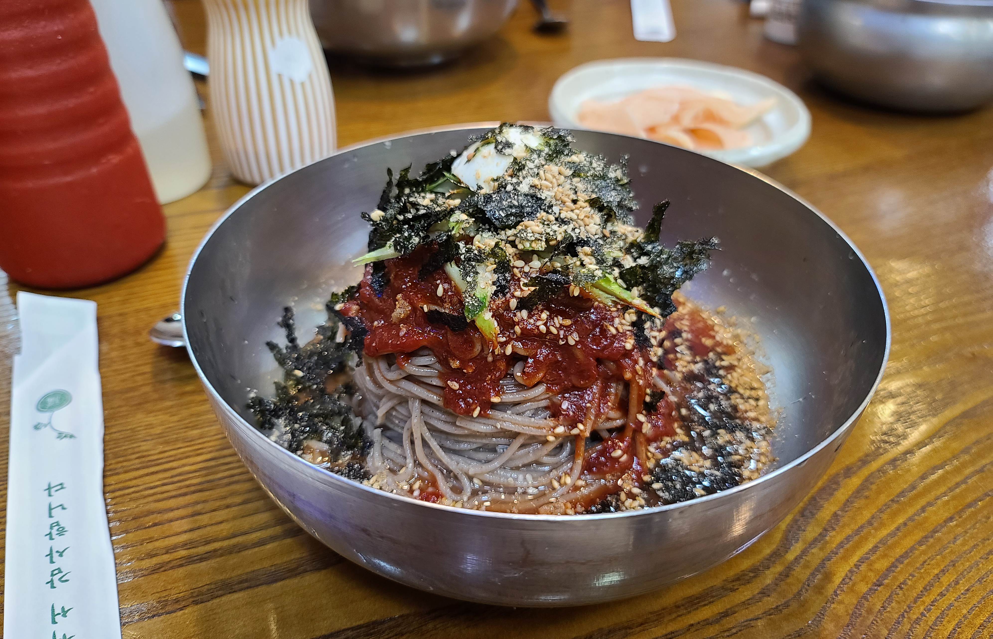 주문하니 금세 막국수가 준비되어 나왔고, 막국수와 함께 먹을 무채도 나왔습니다. 아삭하게 잘 담겨 나온 무채는 막국수와 잘 어울렸고, 따로 먹어도 맛있더라고요. 부족한 반찬은 셀프바를 이용해 더 가져올 수도 있었습니다.