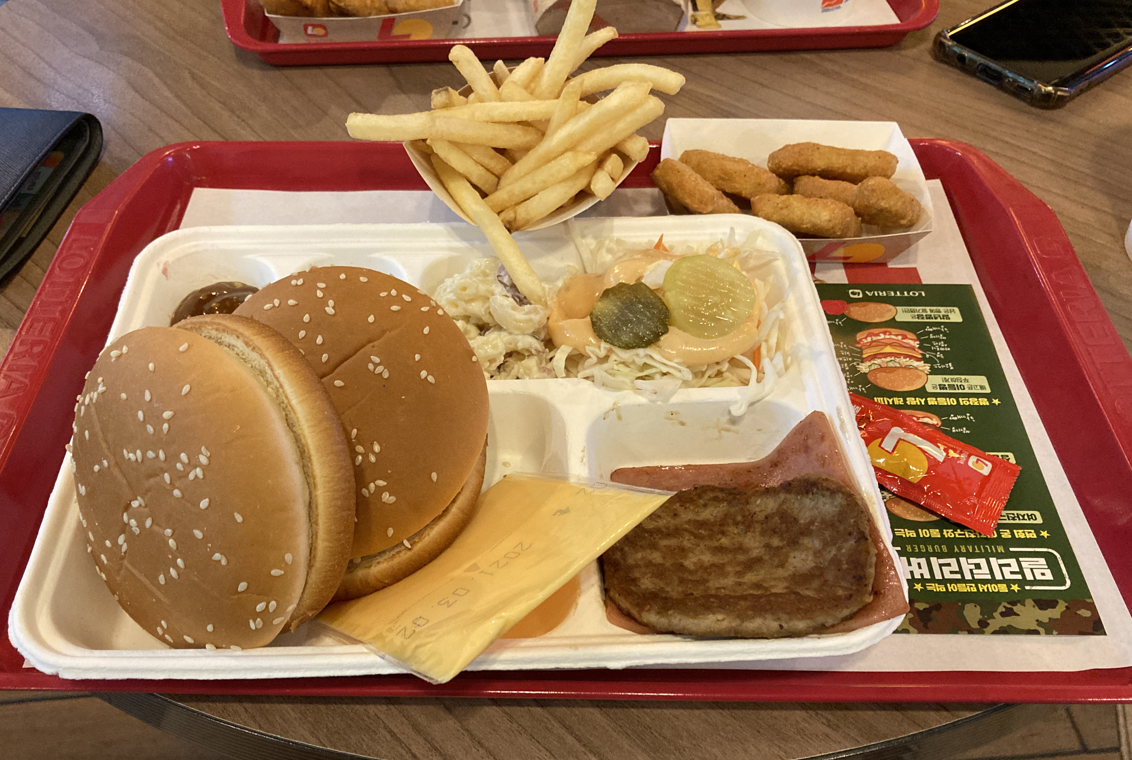 저는 밀리터리버거 세트에 대해 과장 없이 솔직하게 이야기해보려 합니다. 결론부터 말씀드리자면 8,100원짜리 편의점 햄버거였습니다. 편의점 햄버거가 더 맛있었을 수도... 롯데리아 밀리터리 버거는 식판 형태의 용기에 버거 번 2세트, 치즈, 샐러드, 불고기소스, 딸기잼, 감자튀김, 너겟이 함께 나오는 메뉴였습니다.