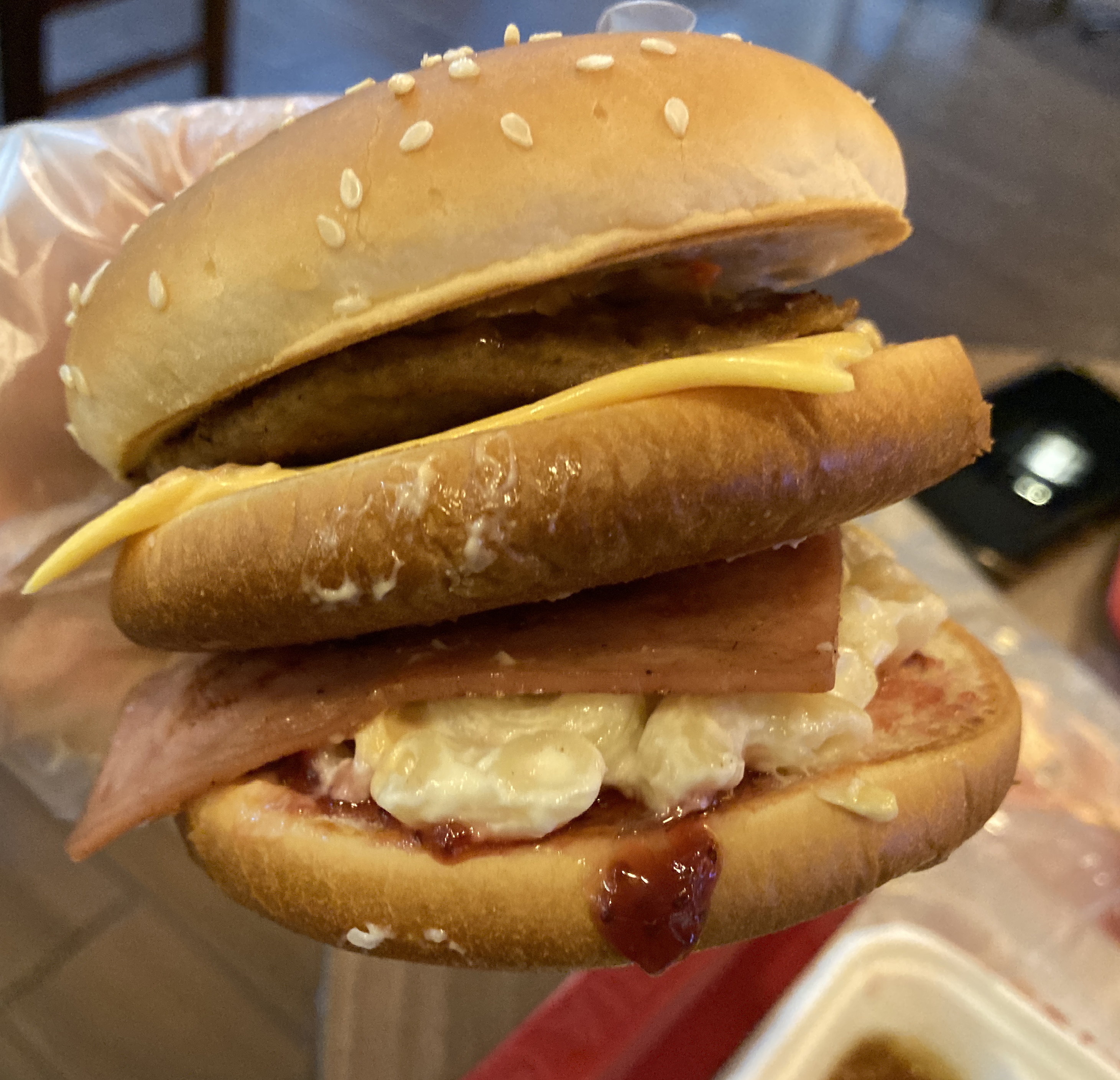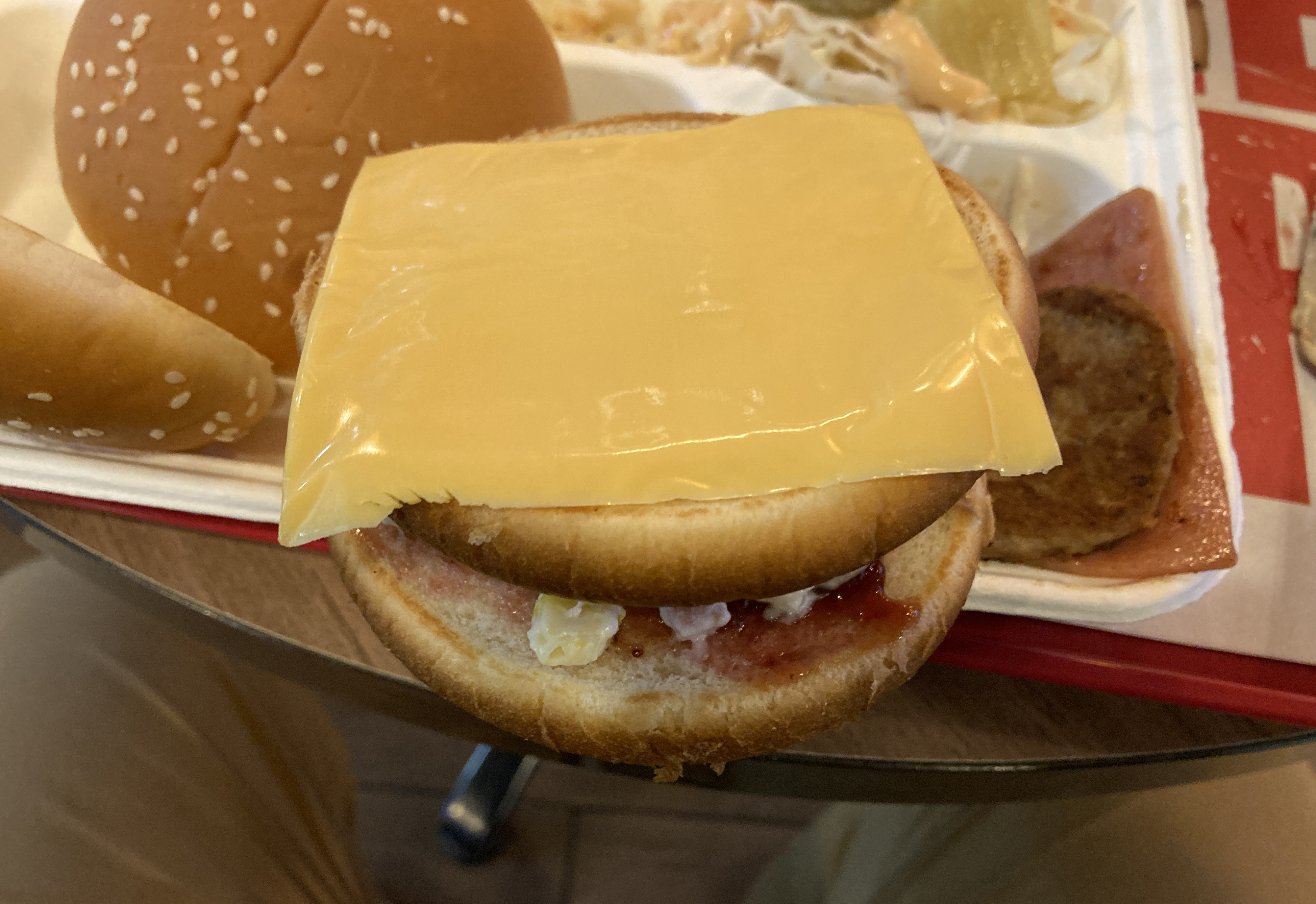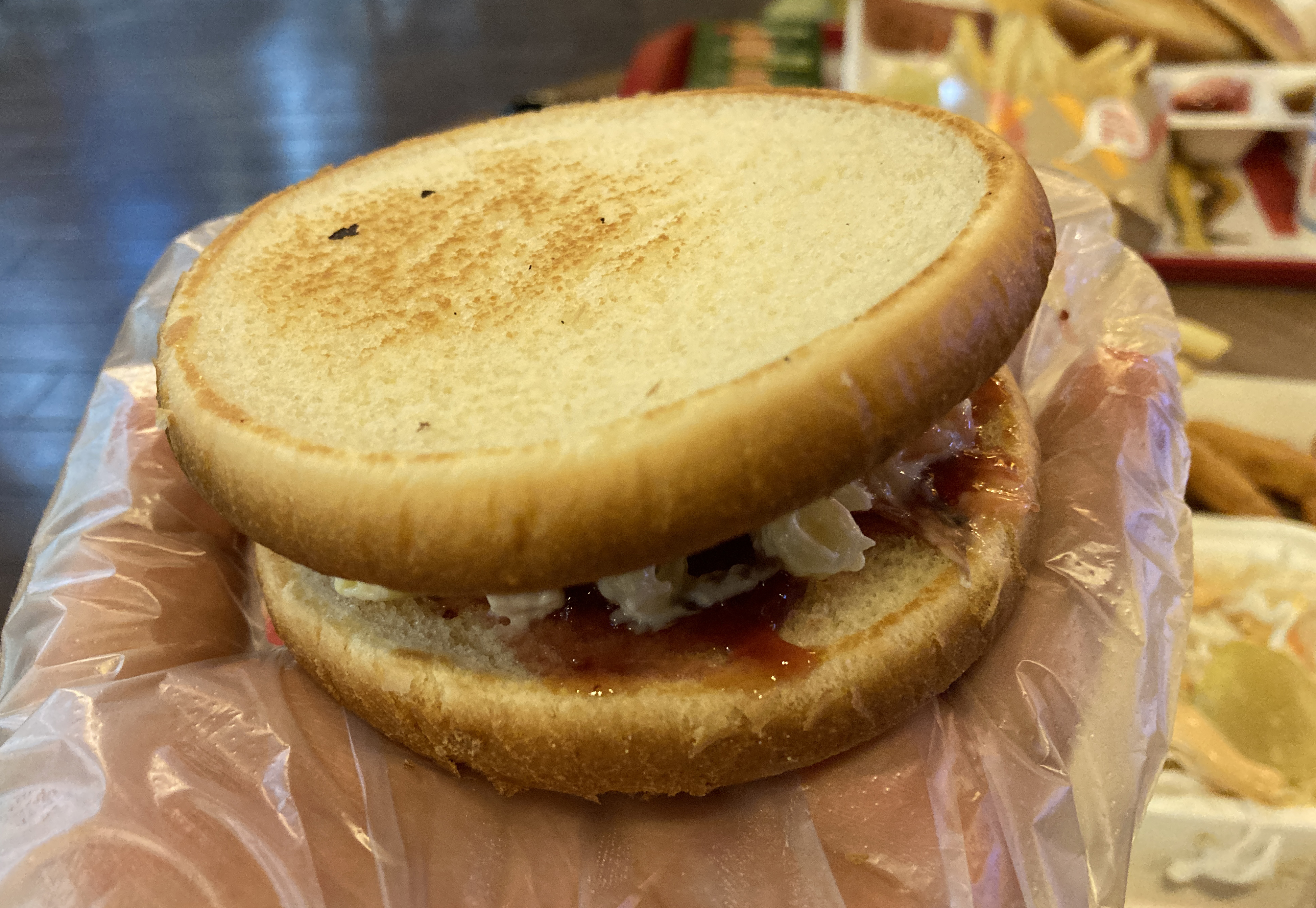 롯데리아에서 제공한 이등병 레시피대로 딸기잼도 넣고, 마카로니 샐러드에, 햄, 미트 패티 등을 넣어서 만들었는데, 모양은 그럴싸하게 나오더라고요. 아무래도 8,100원을 지불하였으니, 맛이 일단 중요하겠죠.