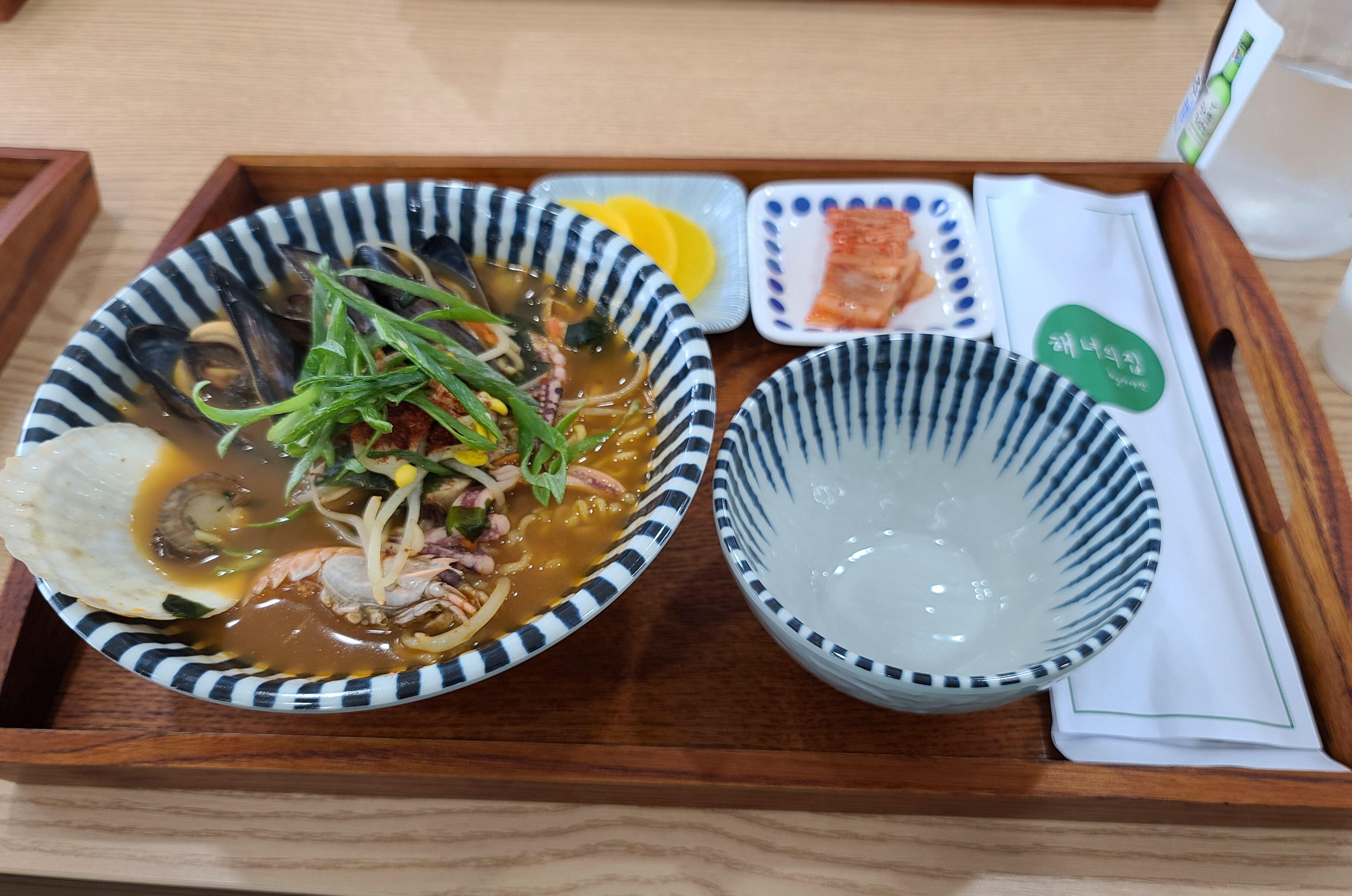 아야진 해녀의집 해물라면은 위와 같이 나왔습니다. 각종 해산물이 들어있는 해물라면과 김치, 단무지. 수저와 젓가락은 보기 좋게 따로 포장되어 제공되었고 음식도 나름 맛있어 보였습니다.
