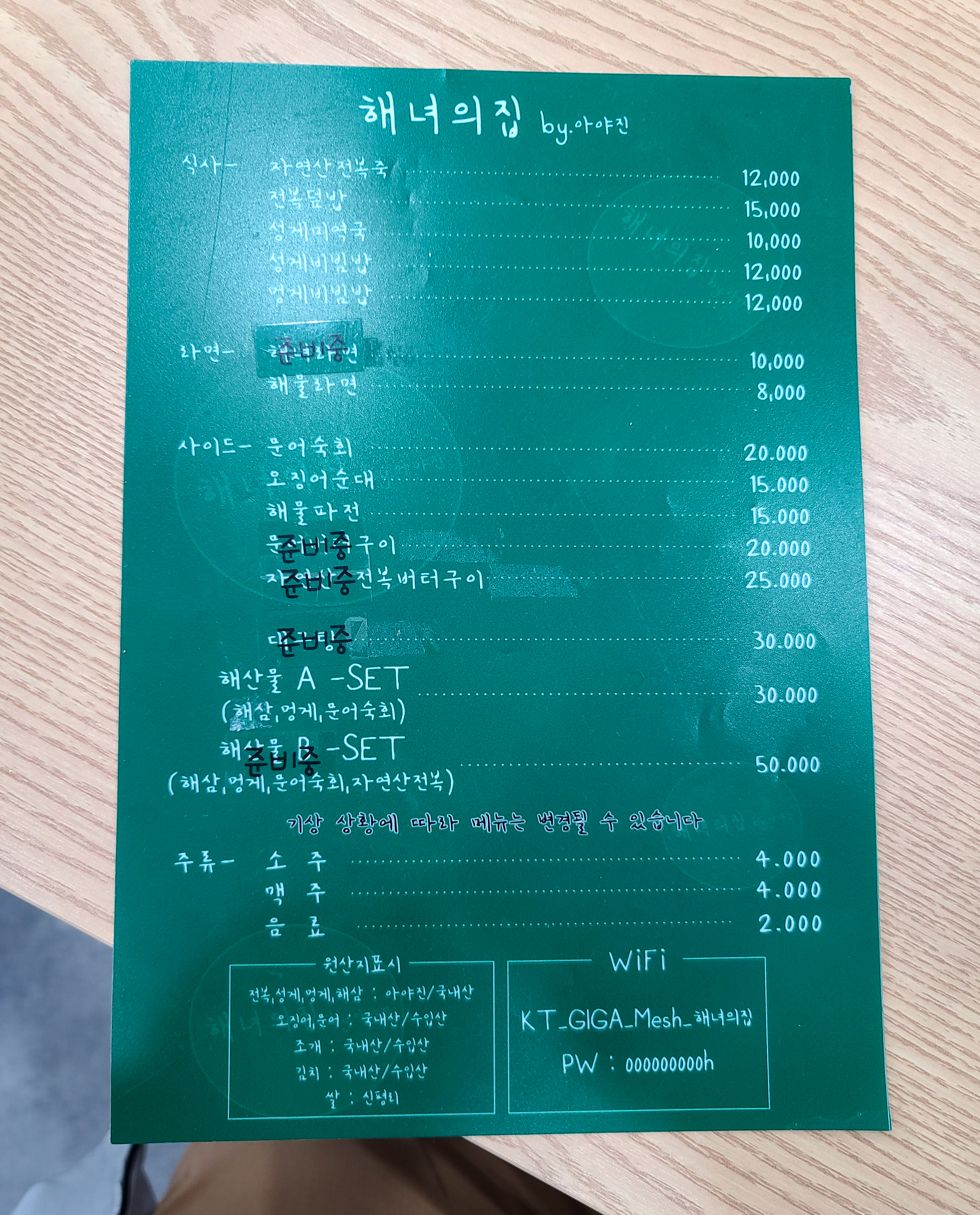 강원도 고성의 <해녀의집> by.아야진 가게는 최근에 생긴 가게여서 그런지 가게에 대한 정보가 거의 없었습니다. 사실 처음 가는 가게는 맛이 있을지 없을지 복불복이라 불안했지만, 일단 이 시간에 문 연 가게가 <해녀의집> 밖에 없었기에 일단 가장 보편적인 메뉴로 식사해보기로 하였죠. 가게의 메뉴는 자연산전복죽, 전복덮밥, 성게미역국, 성게비빔밥, 멍게비빔밥, 해물라면, 문어숙회, 오징어순대, 해물파전, 해산물세트 등이 있었습니다. 저희는 해물라면 4개를 주문하였습니다.