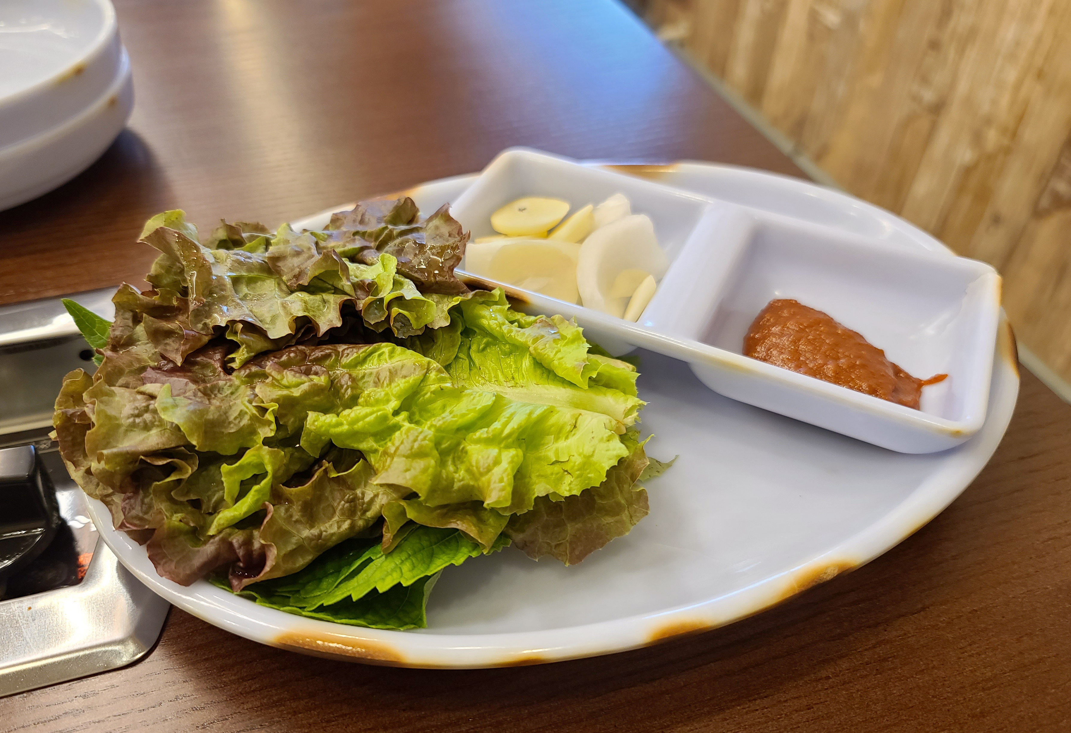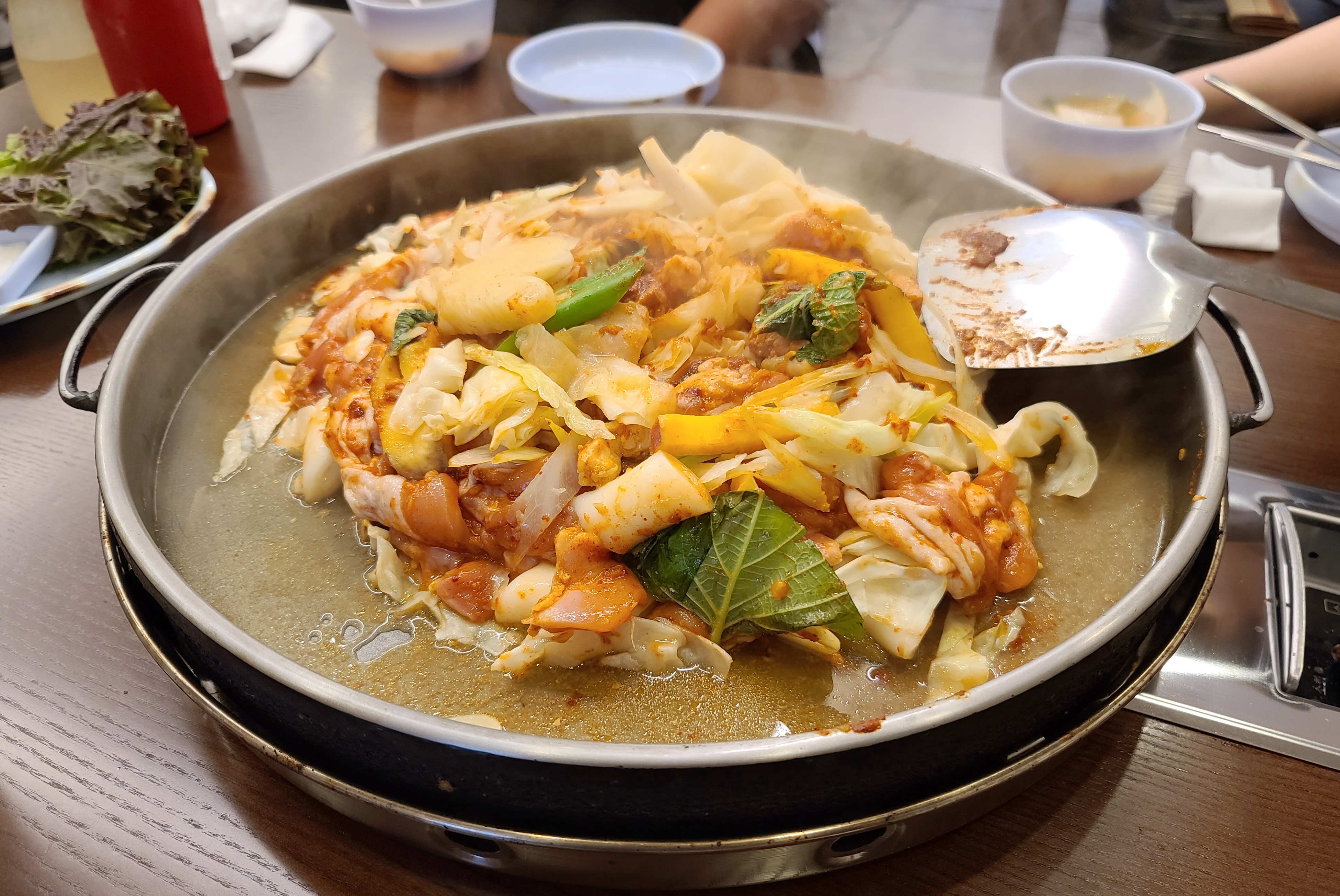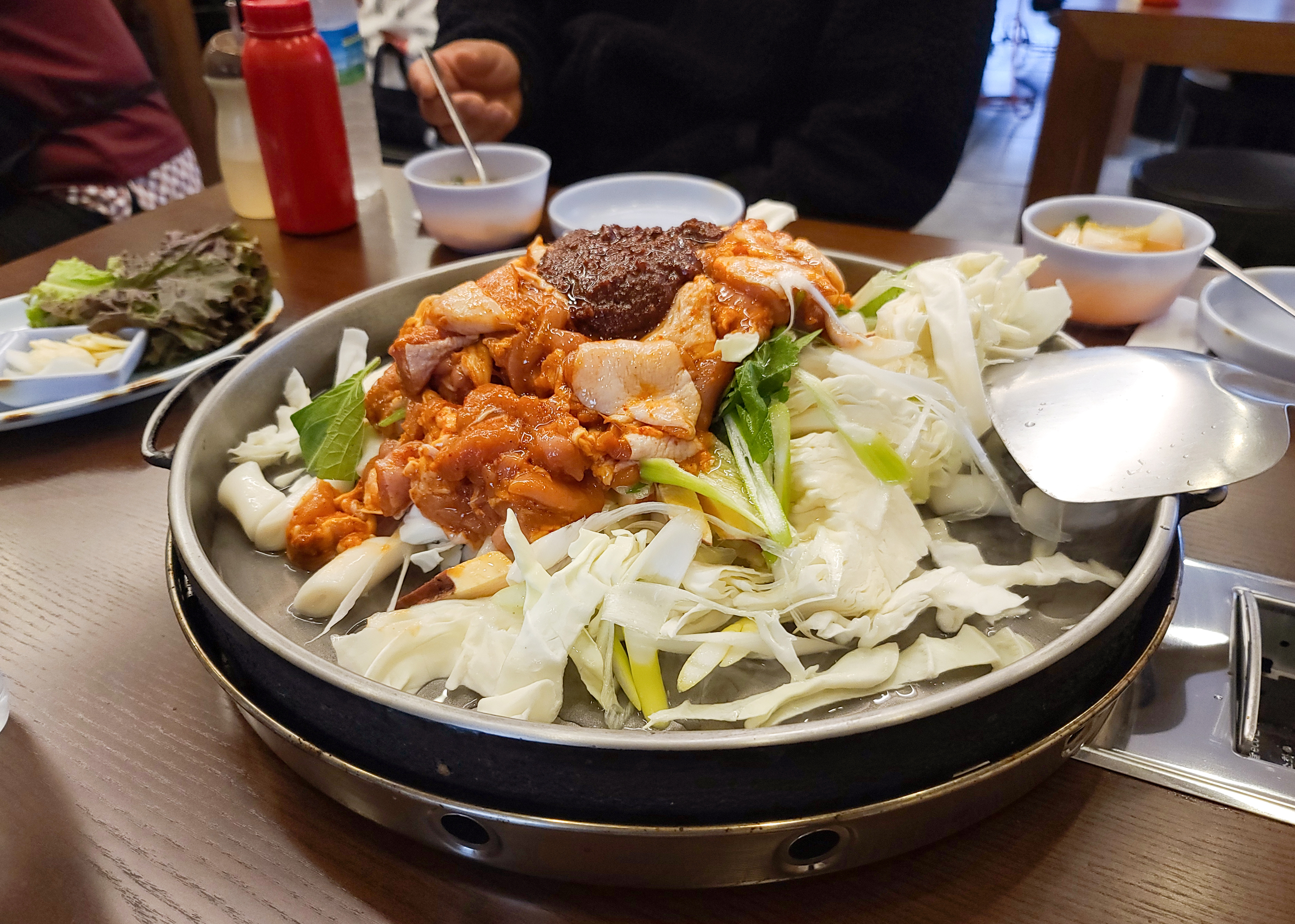 곧이어 메인 메뉴인 닭갈비와 물김치, 쌈채소 등이 나왔고, 춘천 우성닭갈비는 양념을 나중에 추가하는 반면 춘천 통나무집 닭갈비는 모든 재료를 한꺼번에 볶아주되 물을 조금 부어서 양념을 졸이면서 먹는 듯했습니다.