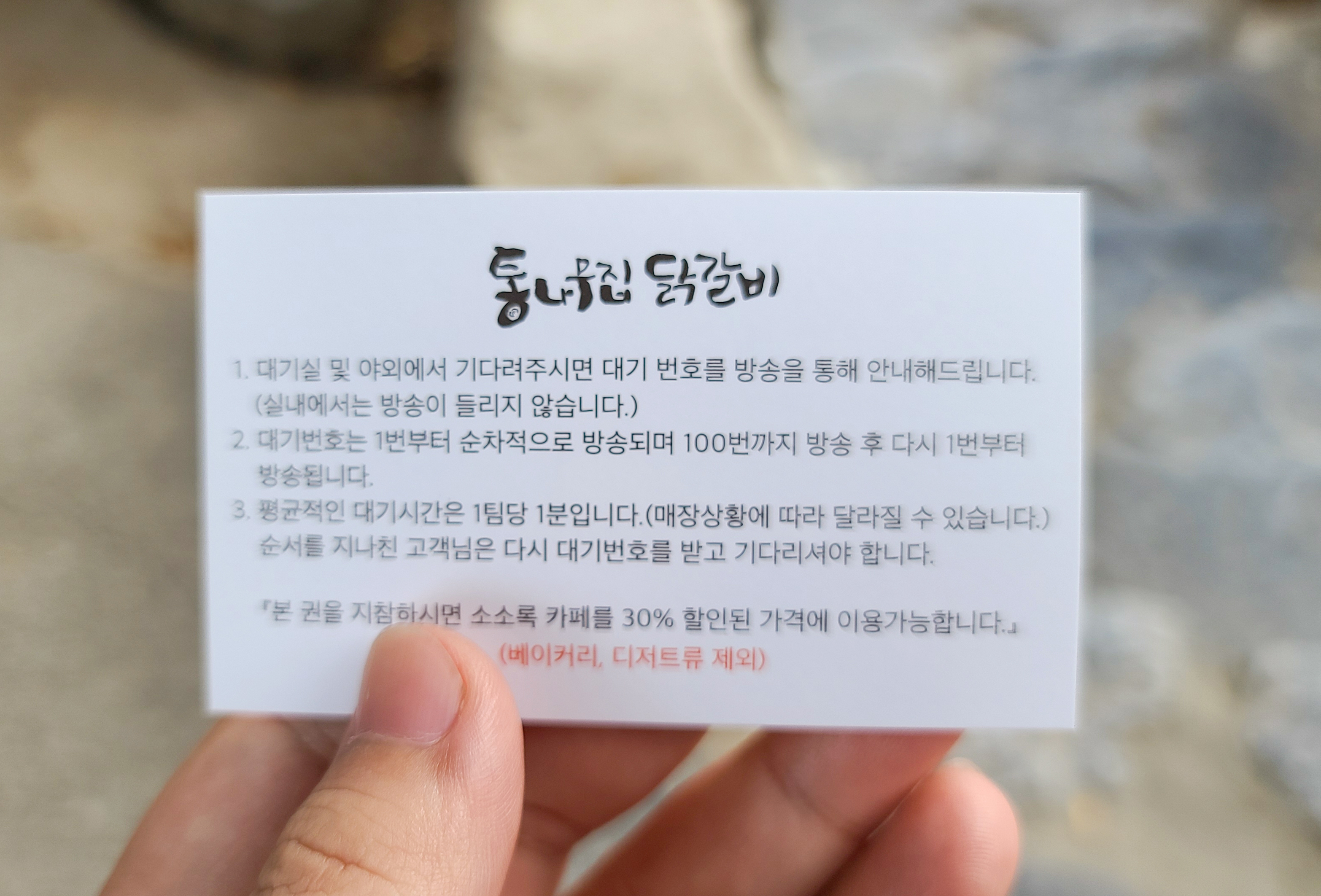 손님이 많은 가게여서 그런지 대기표를 받아서 입장할 수 있었습니다. 손님이 많았음에도 가게의 규모가 커서 그런지 금세 대기번호가 줄어들었습니다. 춘천 통나무집 닭갈비의 메뉴는 닭갈비, 닭내장, 쟁반막국수, 양푼물막국수, 막국수, 감자부침, 빙어튀김 등이 있었습니다.