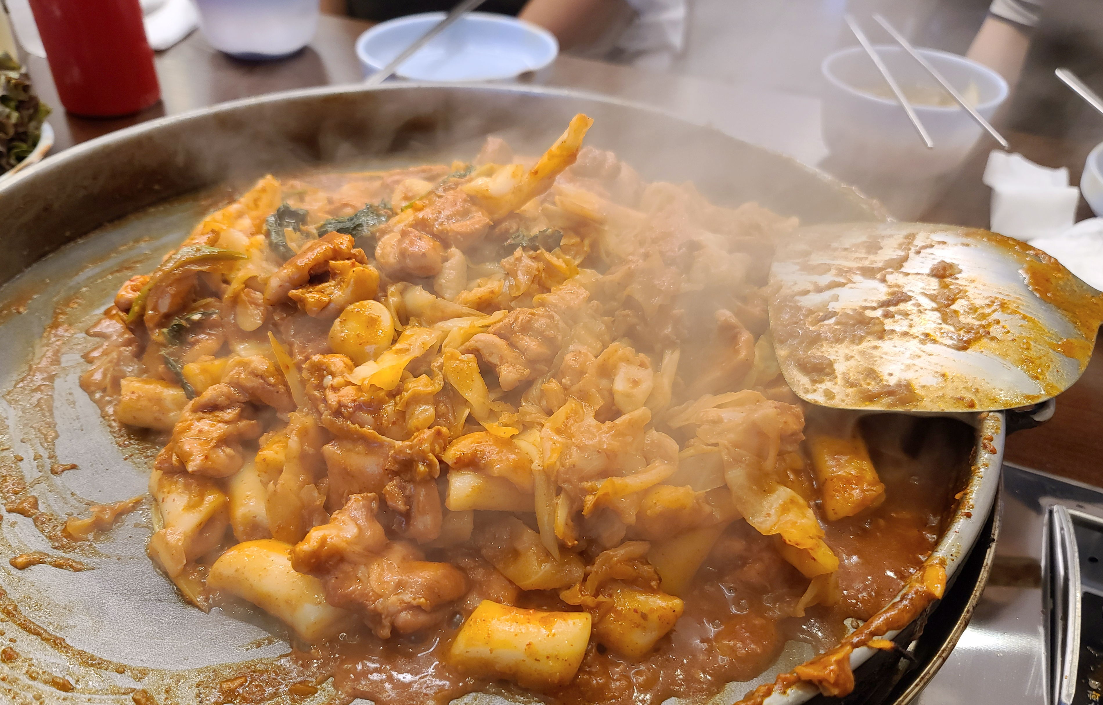 춘천 통나무집 닭갈비는 다른 가게와 마찬가지로 직원이 직접 볶아주었으며, 닭이 다 익을 때까지 시간이 조금 소요되었습니다. 처음에는 양념이 묽어 보였는데, 졸여져서 그런지 생각보다 간이 살코기 안 까지 깊게 배어들어 양념이 진하고 맛있었습니다.
