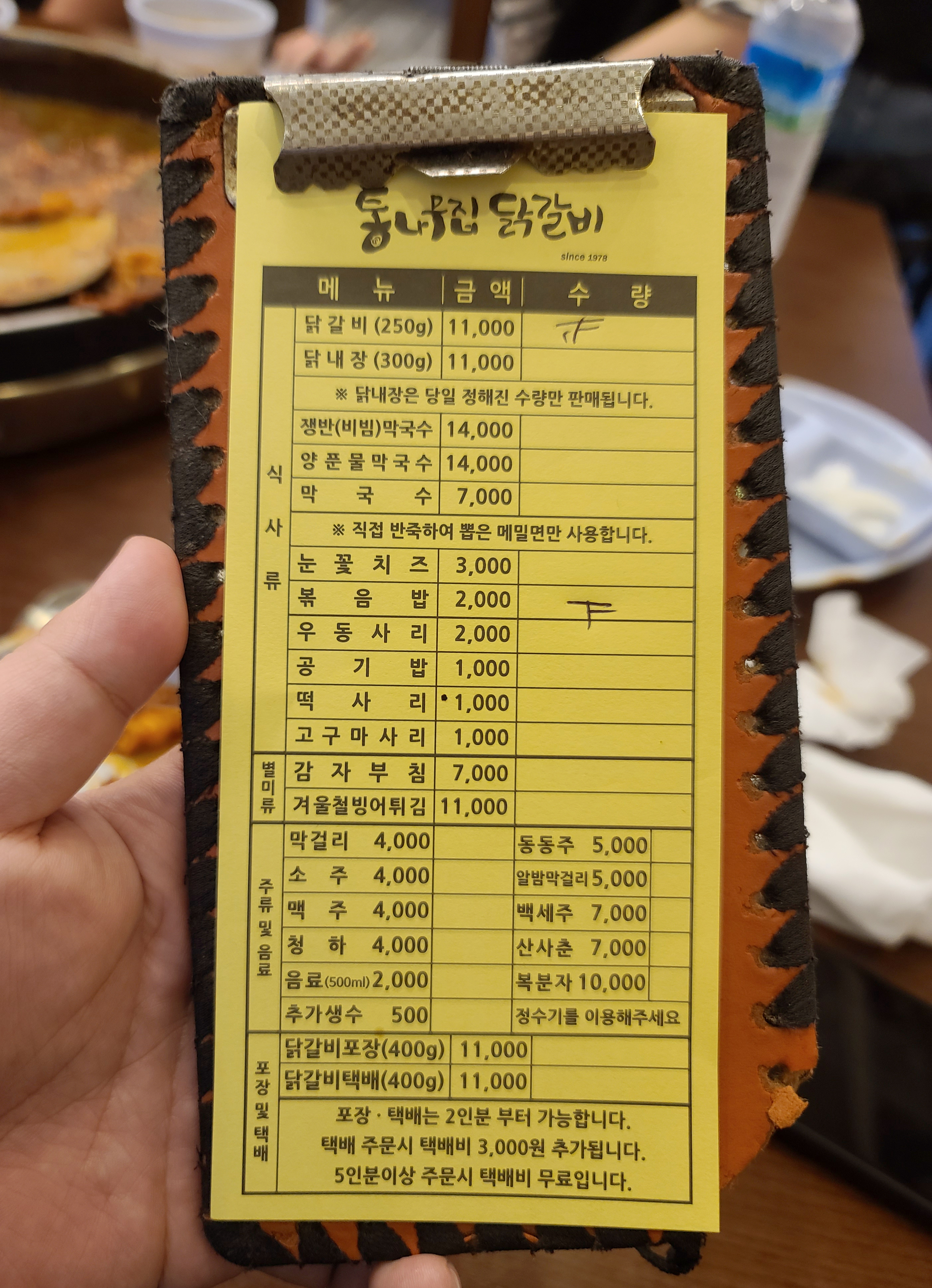 저희는 닭갈비 4인분이랑 볶음밥 3인분을 주문하였습니다. 닭갈비에 눈꽃 치즈나, 우동사리 등을 추가할 수 있었지만, 저는 개인적으로 사리들을 추가할수록 닭갈비 맛이 떨어지는 것 같더라고요. 그래서 기본 닭갈비만 주문했습니다.
