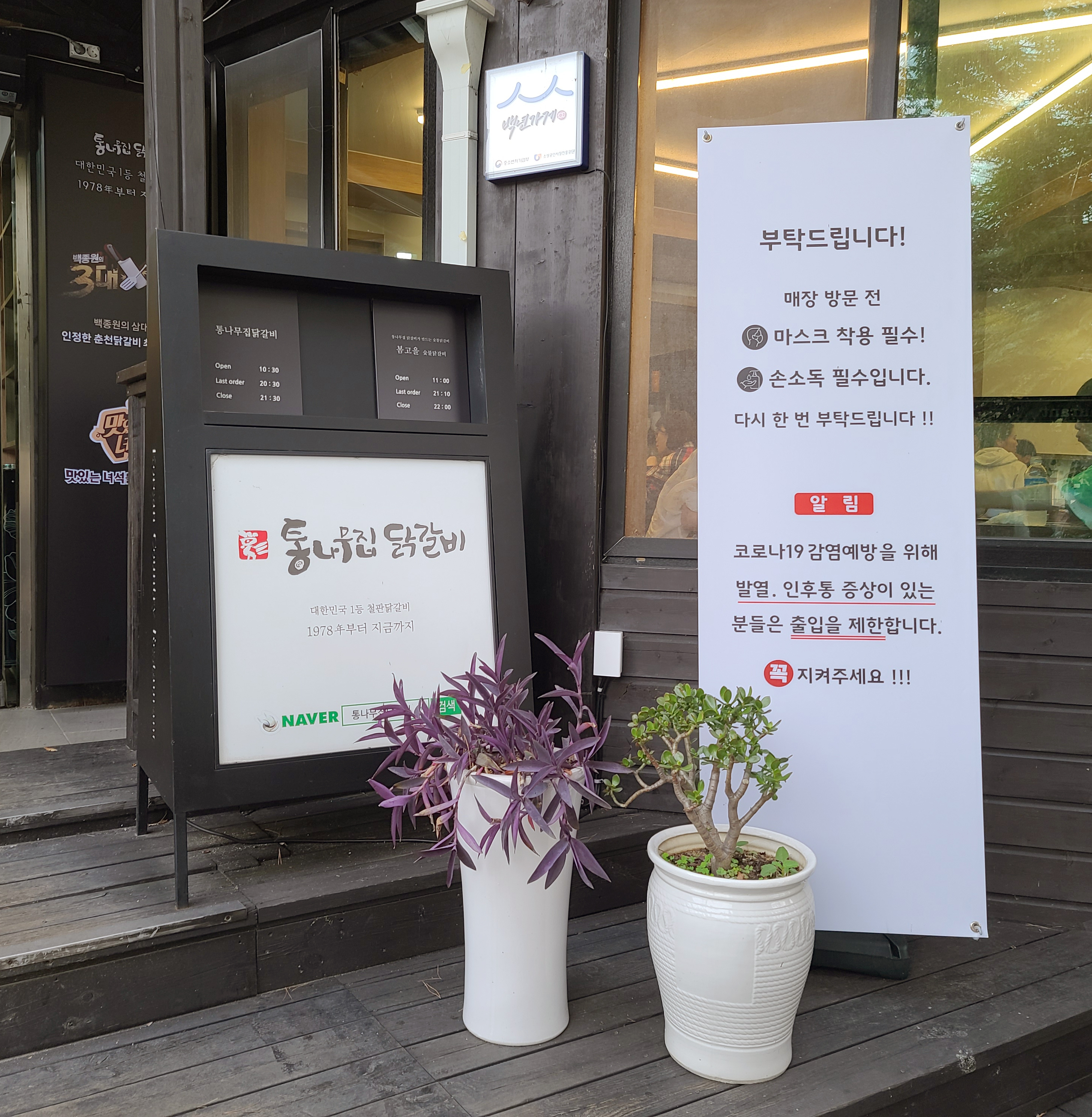 춘천 통나무집 닭갈비는 춘천시 신북읍 천천리에 위치해 있으며, 본점과 분점이 근거리에 있어서 본점에 손님이 많을 경우 분점에서도 같은 메뉴로 식사할 수 있었습니다. 코로나 19의 영향으로 매장 이용 전 체온검사와 방문자 QR코드 인증이 있었으며,