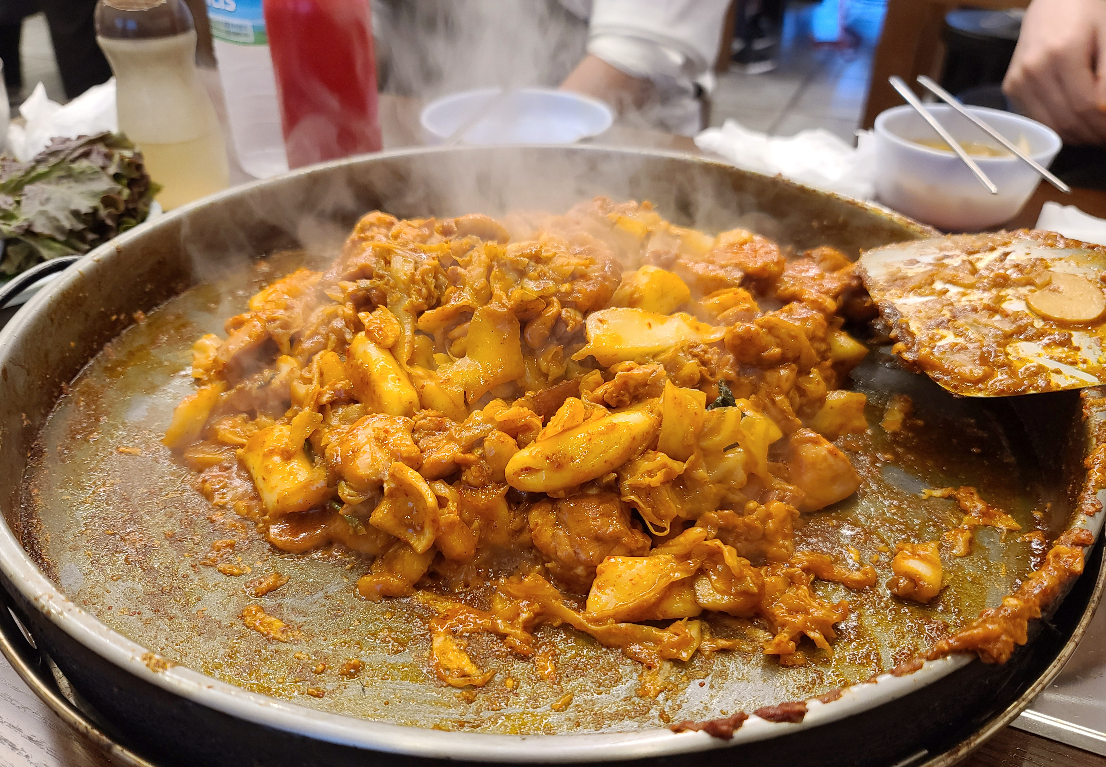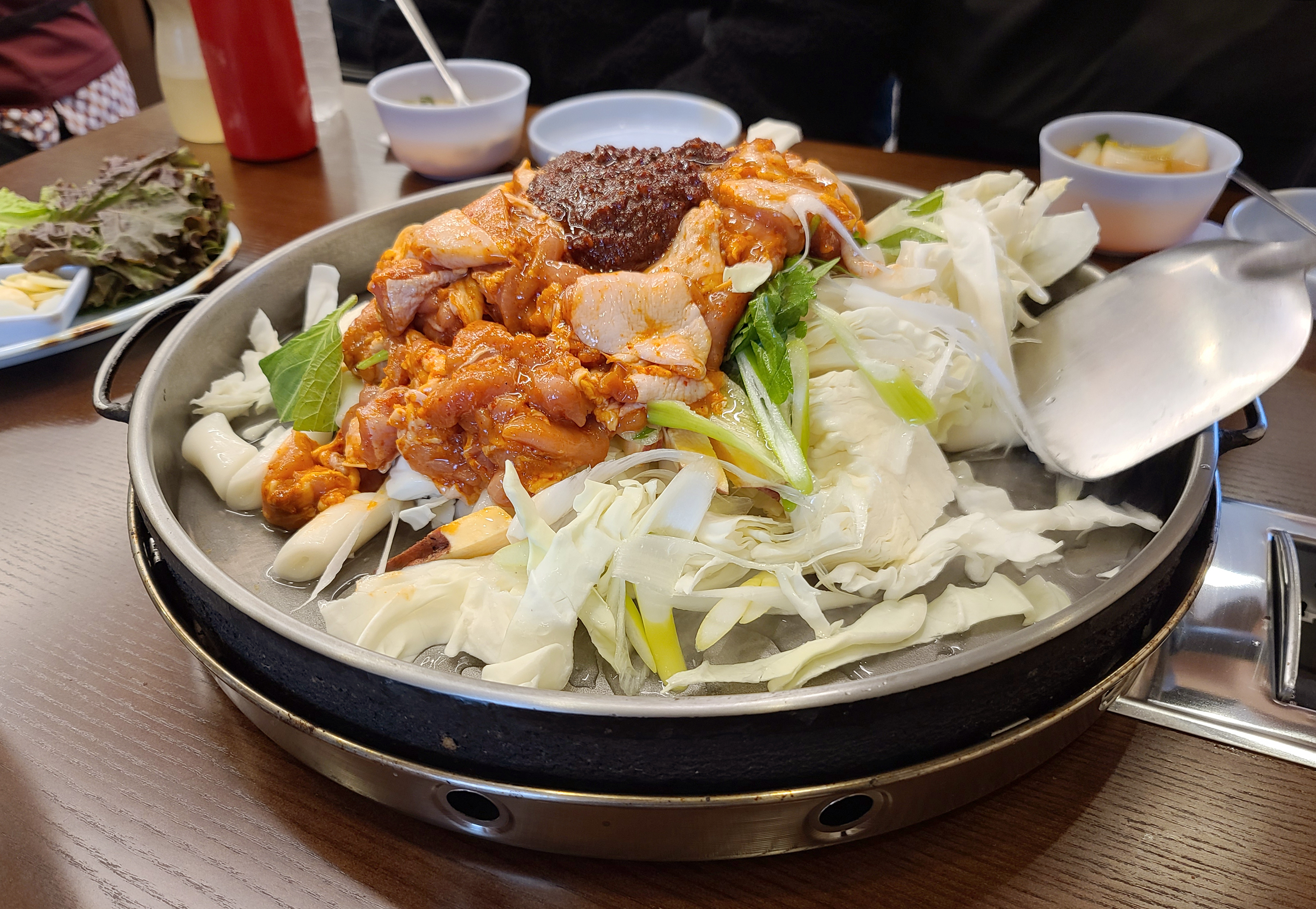 곧이어 메인 메뉴인 닭갈비와 물김치, 쌈채소 등이 나왔고, 춘천 우성닭갈비는 양념을 나중에 추가하는 반면 춘천 통나무집 닭갈비는 모든 재료를 한꺼번에 볶아주되 물을 조금 부어서 양념을 졸이면서 먹는 듯했습니다.