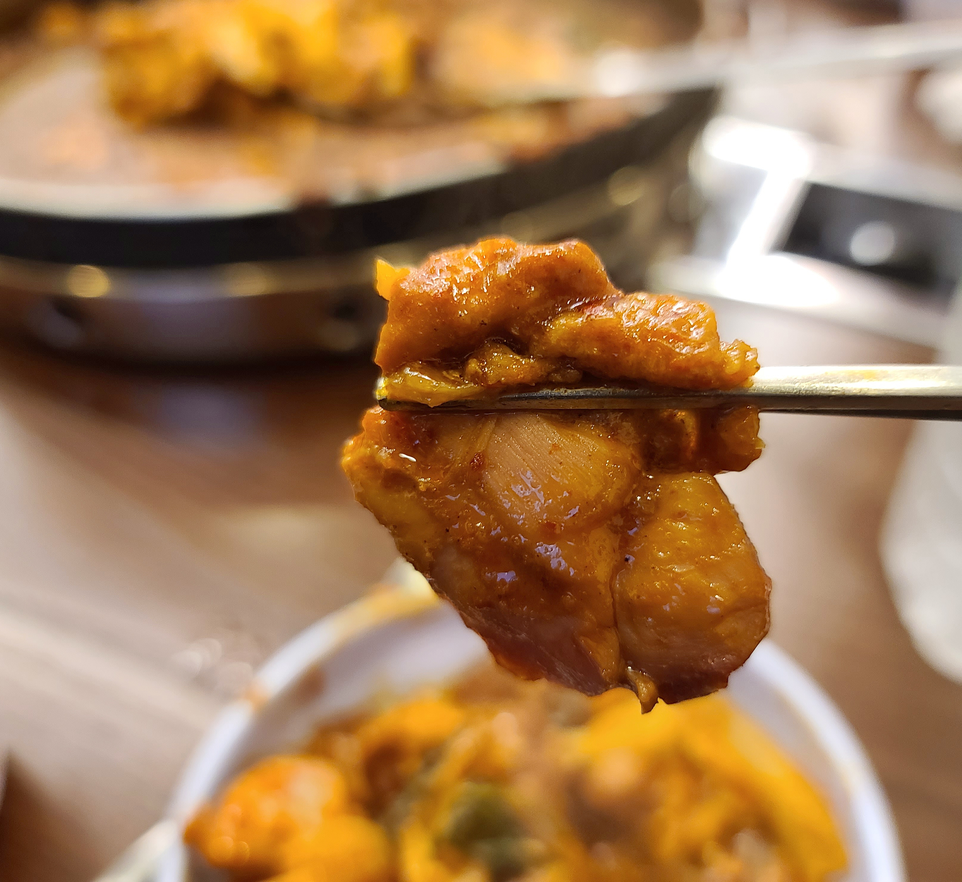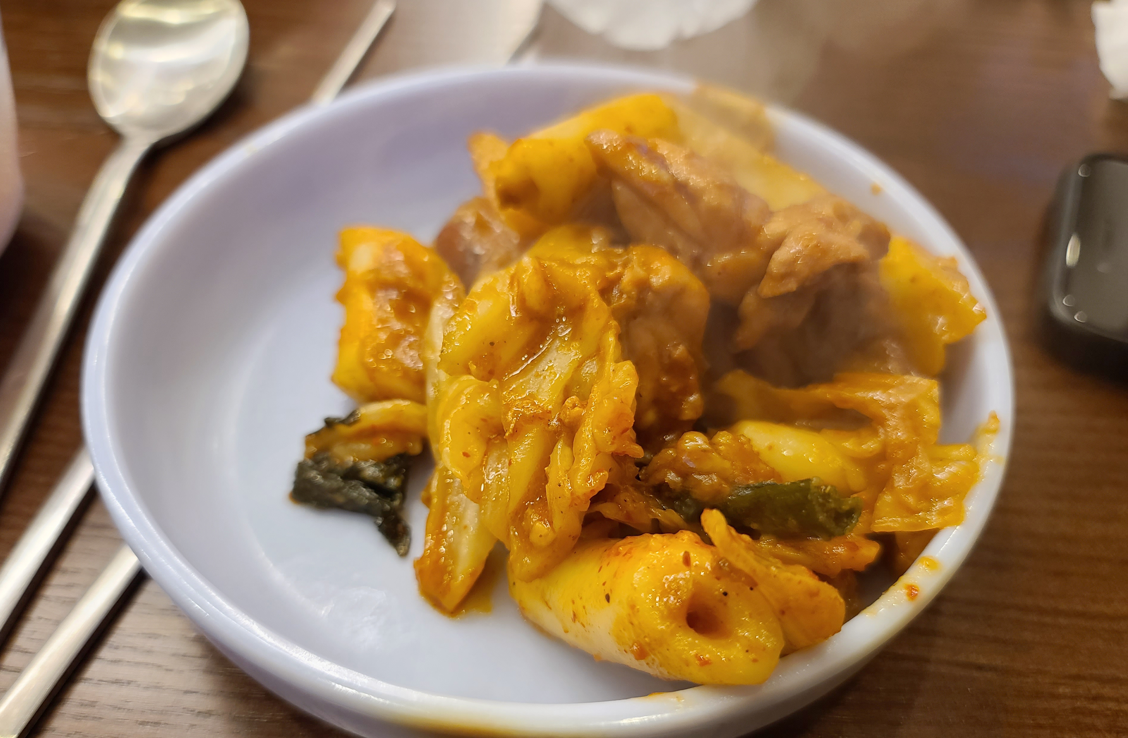 춘천 통나무집 닭갈비는 다른 가게와 마찬가지로 직원이 직접 볶아주었으며, 닭이 다 익을 때까지 시간이 조금 소요되었습니다. 처음에는 양념이 묽어 보였는데, 졸여져서 그런지 생각보다 간이 살코기 안 까지 깊게 배어들어 양념이 진하고 맛있었습니다.