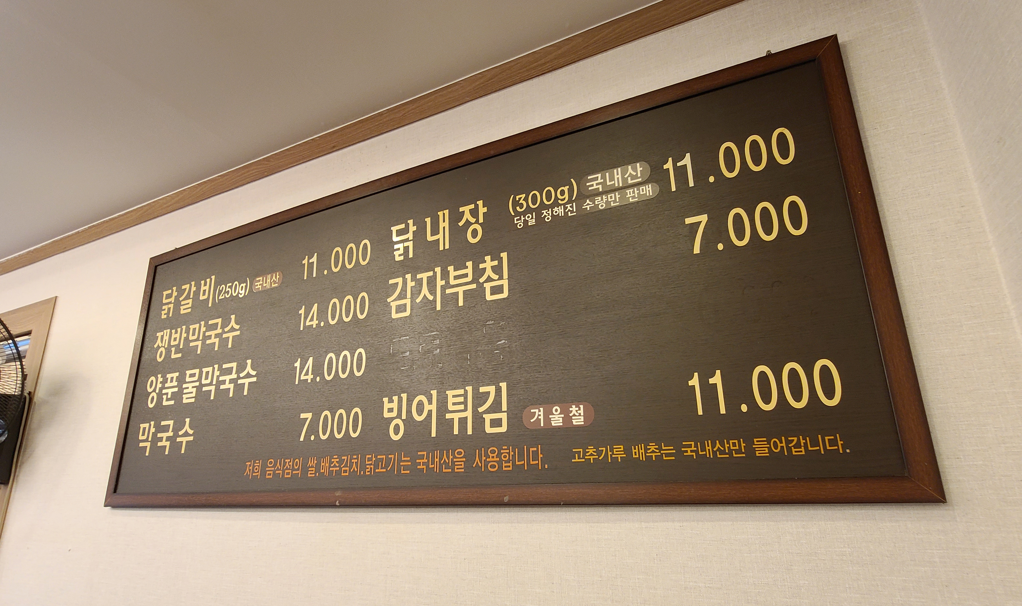 손님이 많은 가게여서 그런지 대기표를 받아서 입장할 수 있었습니다. 손님이 많았음에도 가게의 규모가 커서 그런지 금세 대기번호가 줄어들었습니다. 춘천 통나무집 닭갈비의 메뉴는 닭갈비, 닭내장, 쟁반막국수, 양푼물막국수, 막국수, 감자부침, 빙어튀김 등이 있었습니다.