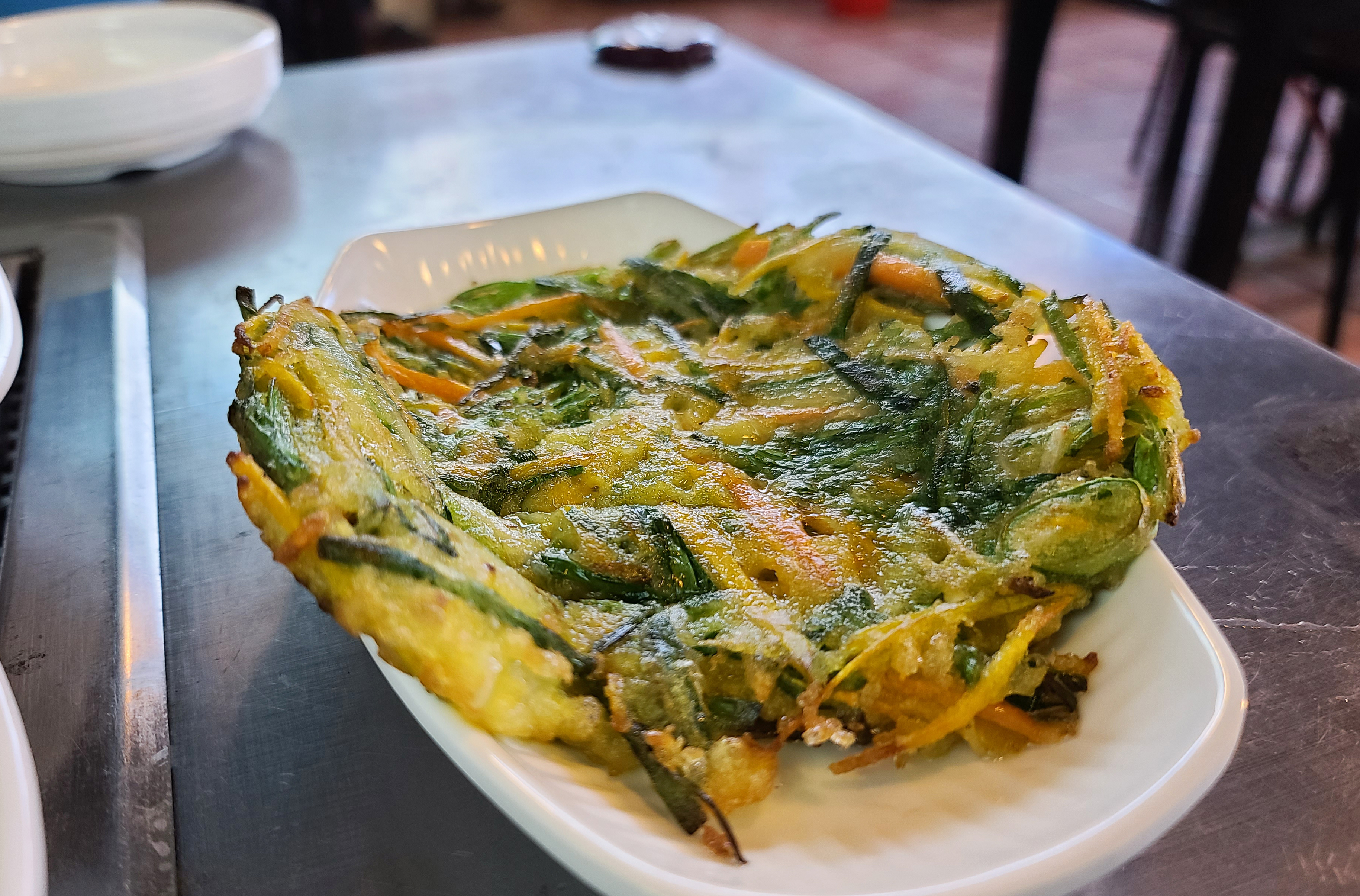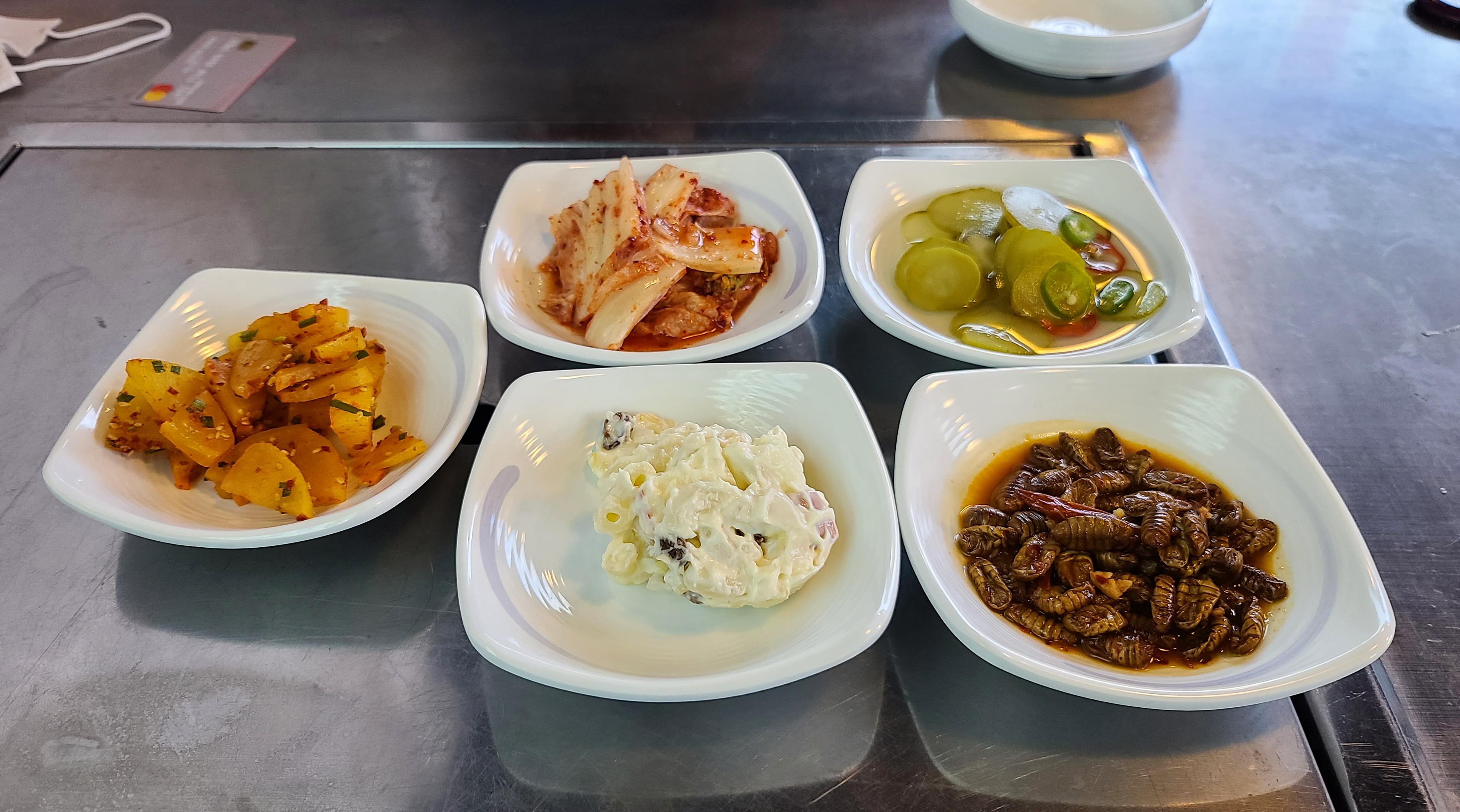 메뉴가 나오기 전 반찬들이 준비되었습니다. 반찬은 오이지, 단무지무침, 배추김치, 샐러드, 번데기, 부침개가 나왔는데 저는 부침개와 단무지무침이 맛있더라고요.