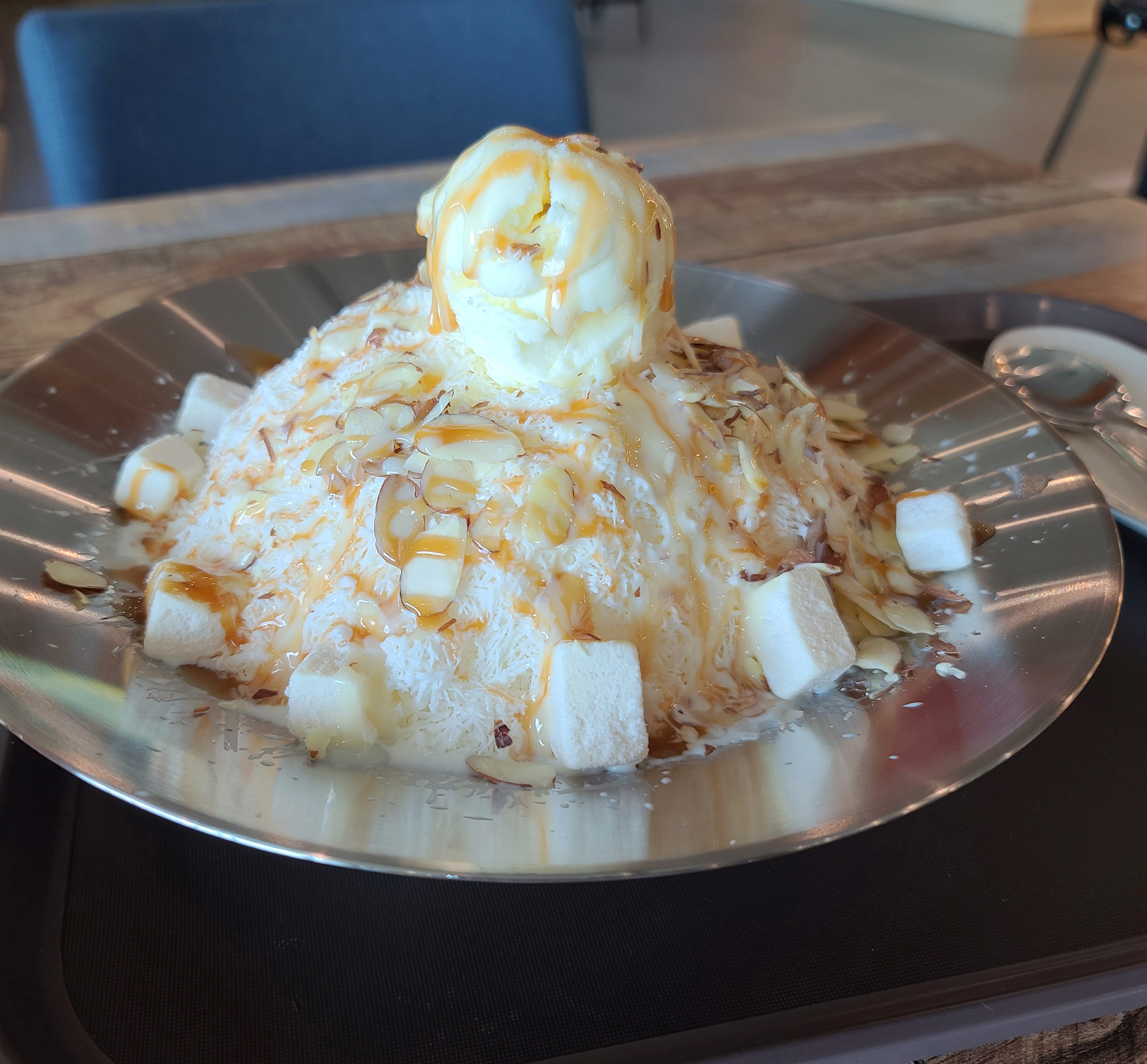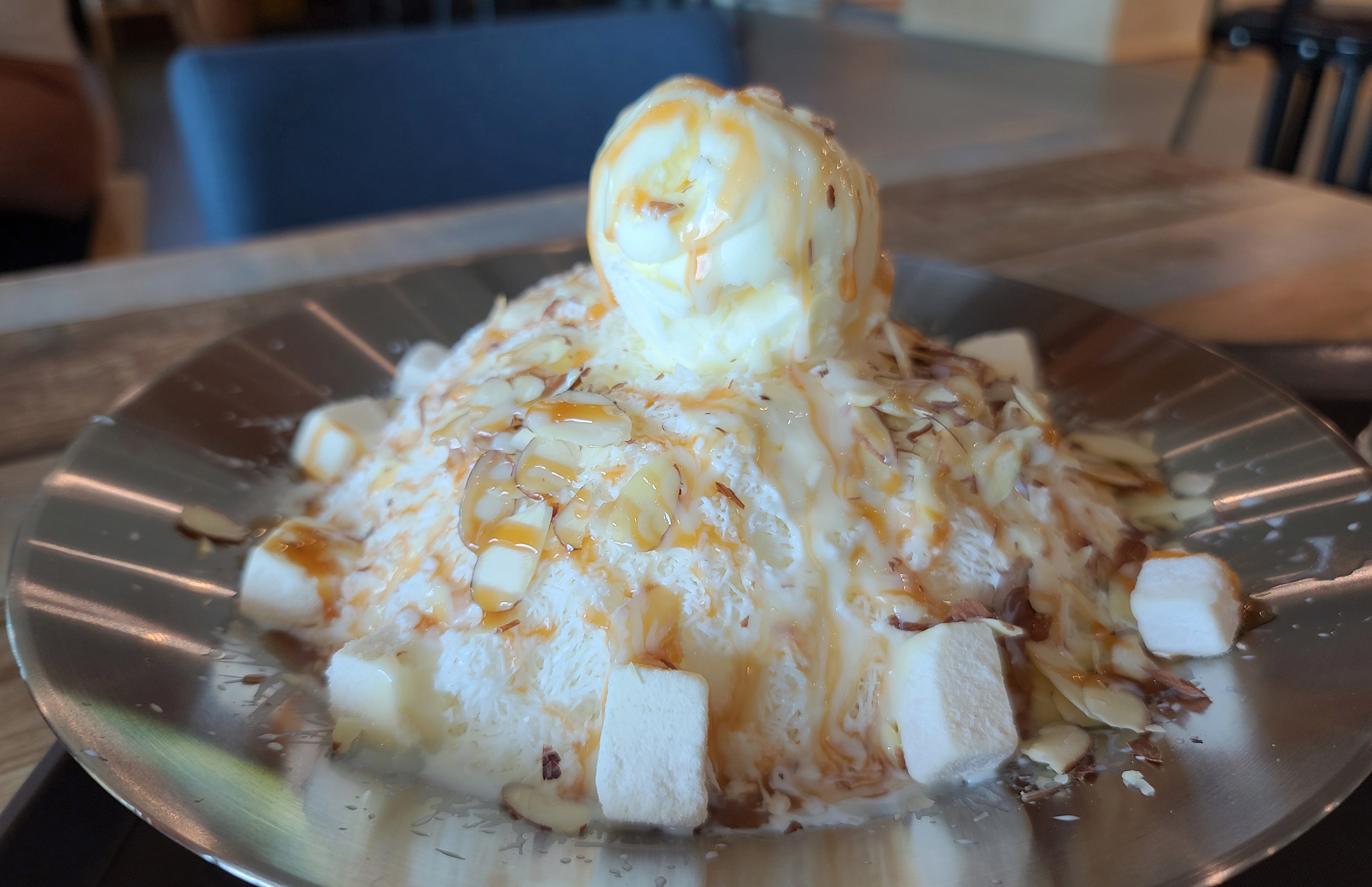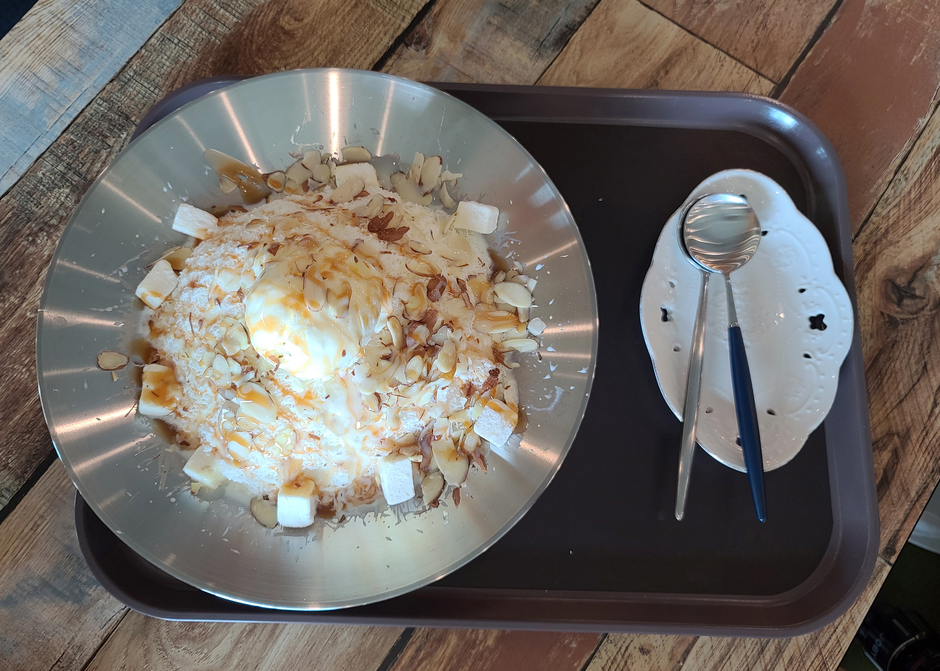 '생애 최고의 맛!' 이라는 한가라지의 리얼 치즈 빙수가 나왔습니다. 리얼 치즈 빙수는 곱게 갈은 우유빙수와 치즈 큐브 그리고 아몬드칩, 아이스크림, 치즈시럽(?)이 함께 뿌려져 나왔습니다.