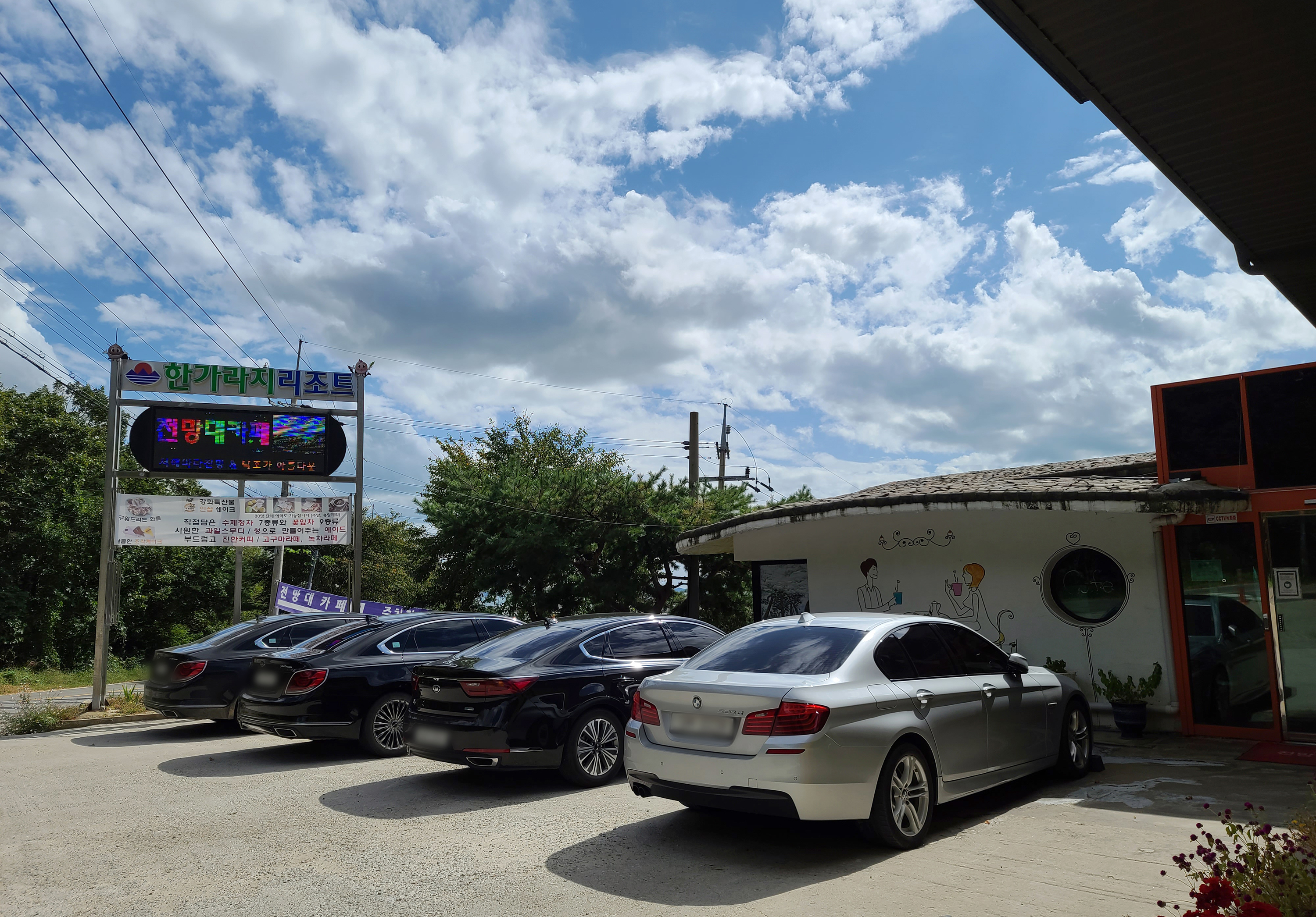 한가라지 카페의 리얼치즈빙수를 맛본 뒤, 테라스에 나가서 주변을 좀 둘러보고 있는데, 가게 사장님이 오셔서 아래로 주차장이 있는데 내려가면 더 멋지다고 안내하시더라고요. 그래서 그분의 소개에 따라 차를 가지고 한가라지 카페 아래쪽으로 난 길을 따라 주차장을 찾아갔습니다.