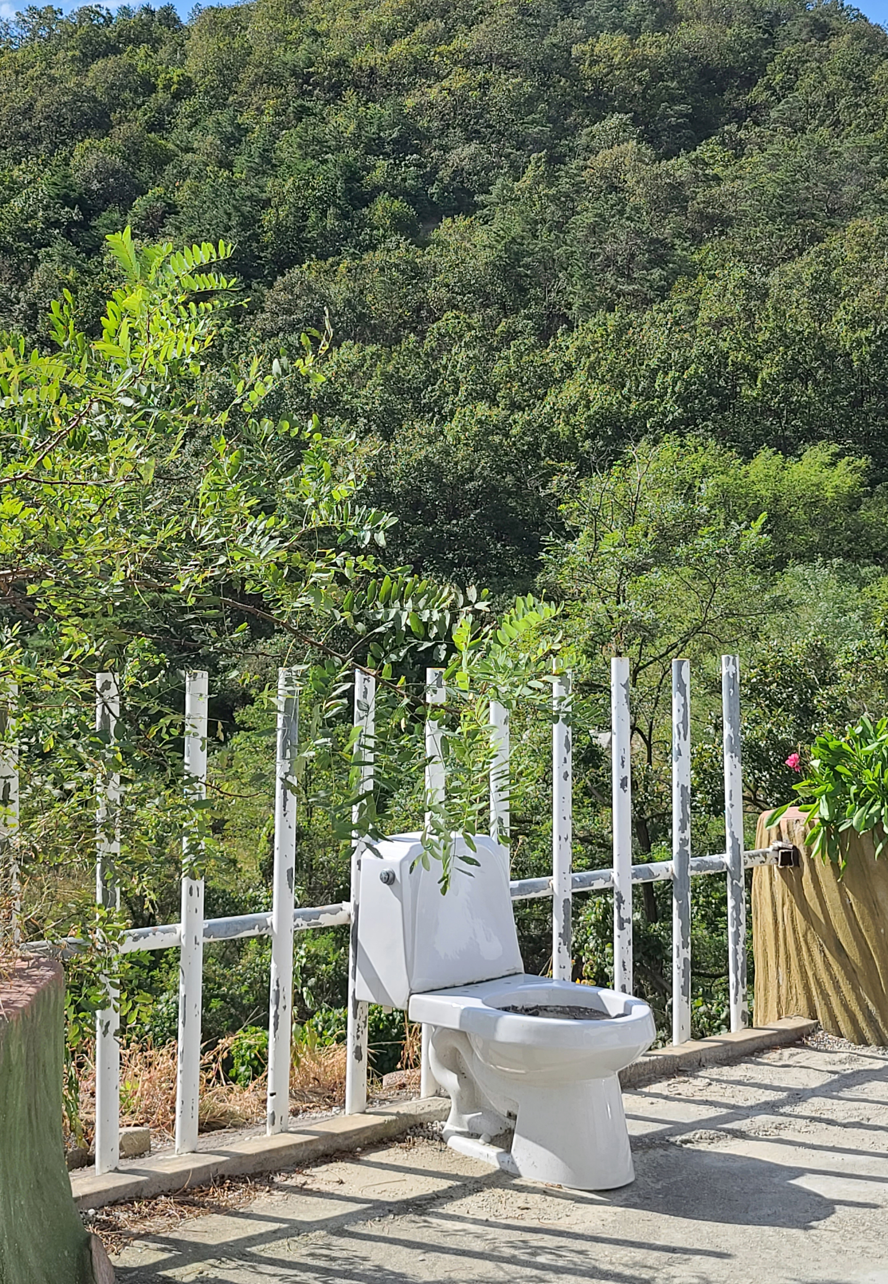주차장을 따라 내려가니, 한가라지 카페보다 더 분위기 좋아 보이는 소나무 숲 카페가 보였으며, 야외 곳곳에 변기가 놓여있길래 뭐지 하고 보니까 재떨이로 사용 중이더라고요.(ㅋㅋ)