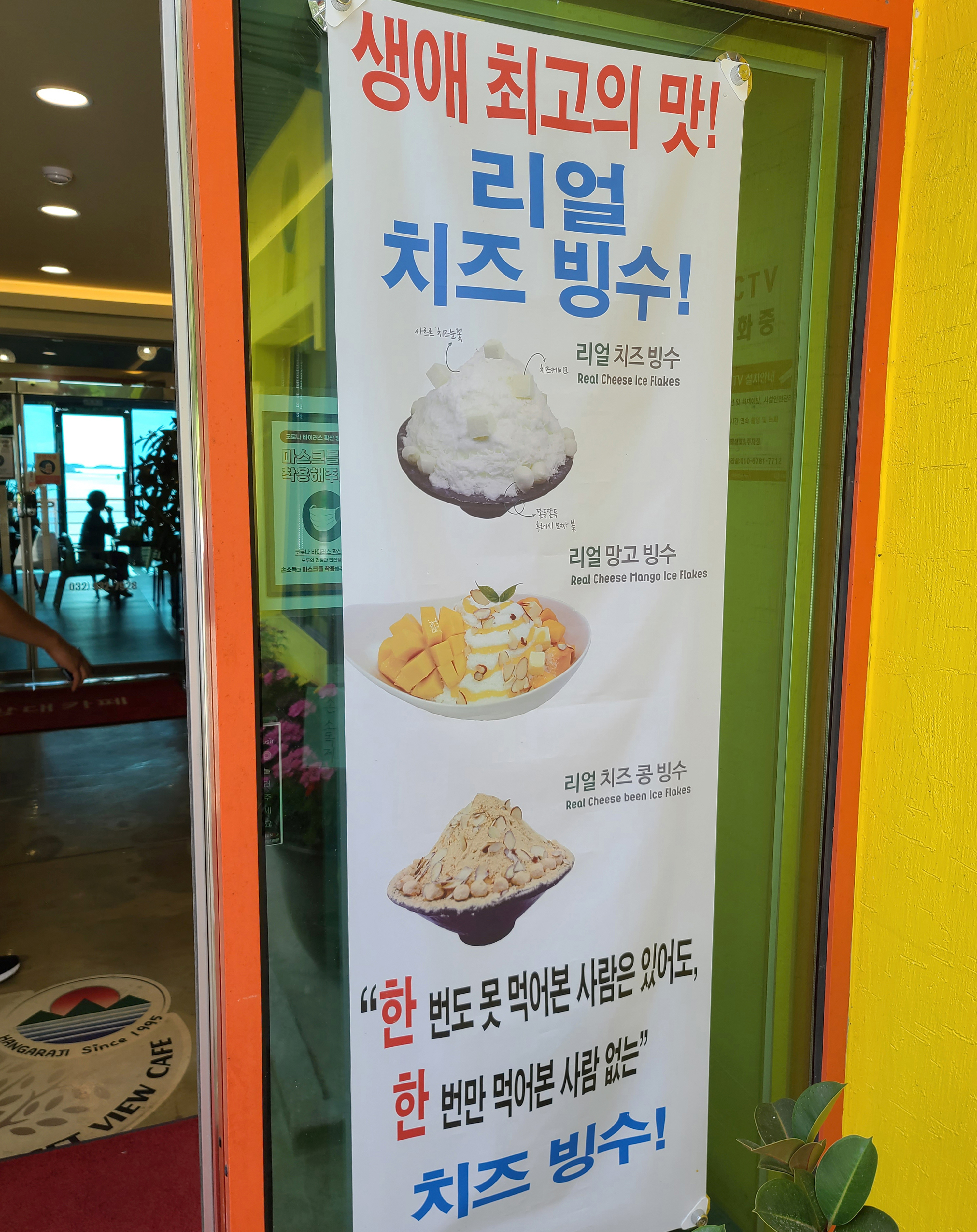 석모도 한가라지 카페는 'T맵 추천'에 의해 우연히 방문하게 된 가게입니다. 코스모스 길에서 사진을 너무 열정적으로 찍었던지 당이 떨어져서(?), 팥빙수라도 하나 먹고 가기로 하였죠. 가게에는 다양한 메뉴를 판매하고 있었는데, '생애 최고의 맛 리얼치즈 빙수!' 라는 말에 대체 생애 최고의 맛은 어떤 맛일지 궁금하여 리얼 치즈빙수로 주문하였습니다. (리얼치즈빙수의 금액은 15,000원으로 조금 비싼 편이었습니다.)