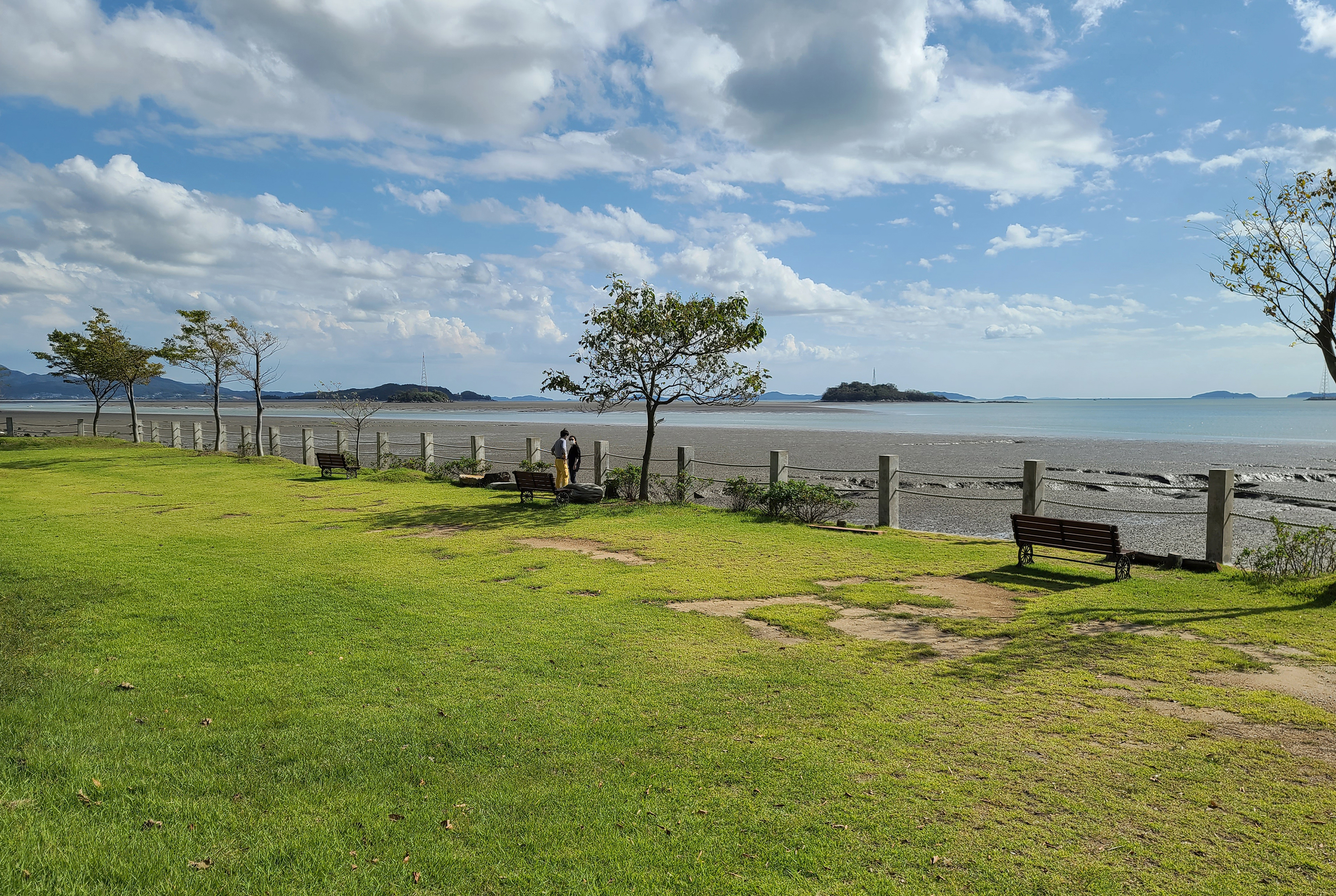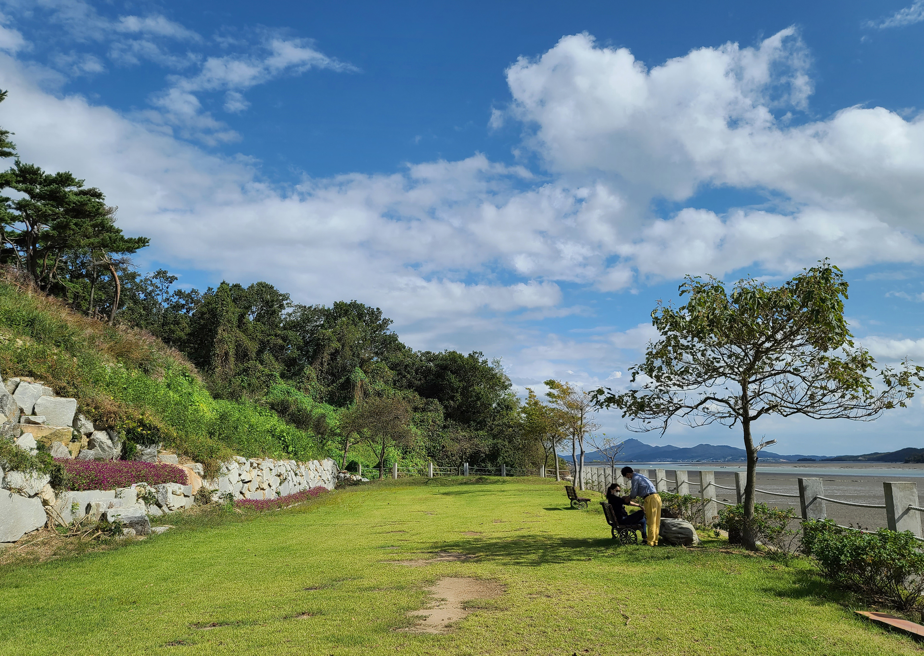 한가라지 카페를 이용하며 느낀 건데, 사실 카페보다 내려와서 있는 이 풍경이 더 마음에 들더라고요. 한적한 공간에 여유롭게 바다를 바라볼 수 있는 곳이었고, 그나마 덜 꾸며서 촌스럽지 않은 공간이었다는 점입니다. 이 날 날씨도 좋았고, 코스모스 길에서 원 없이 사진도 찍어서 그런지 카페 까지도 만족스럽게 이용한 것 같습니다.