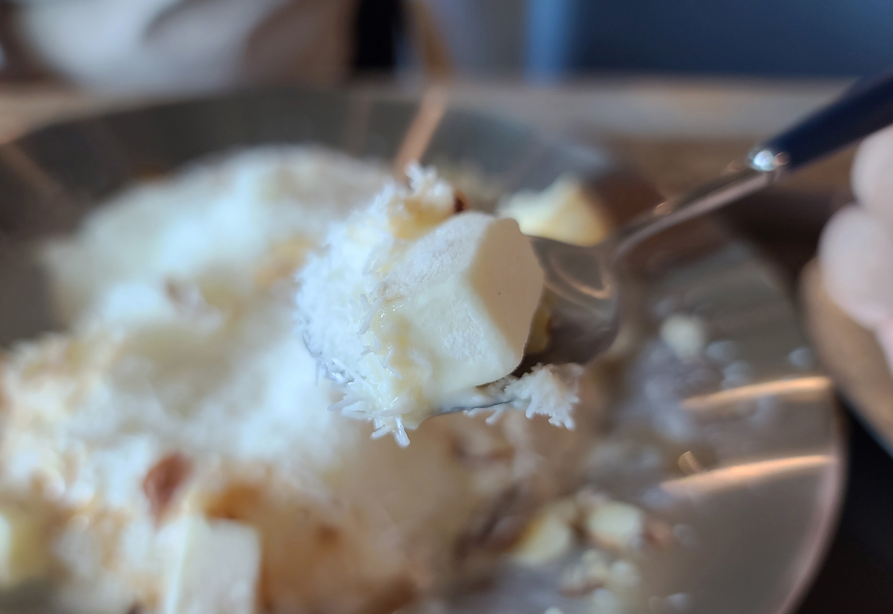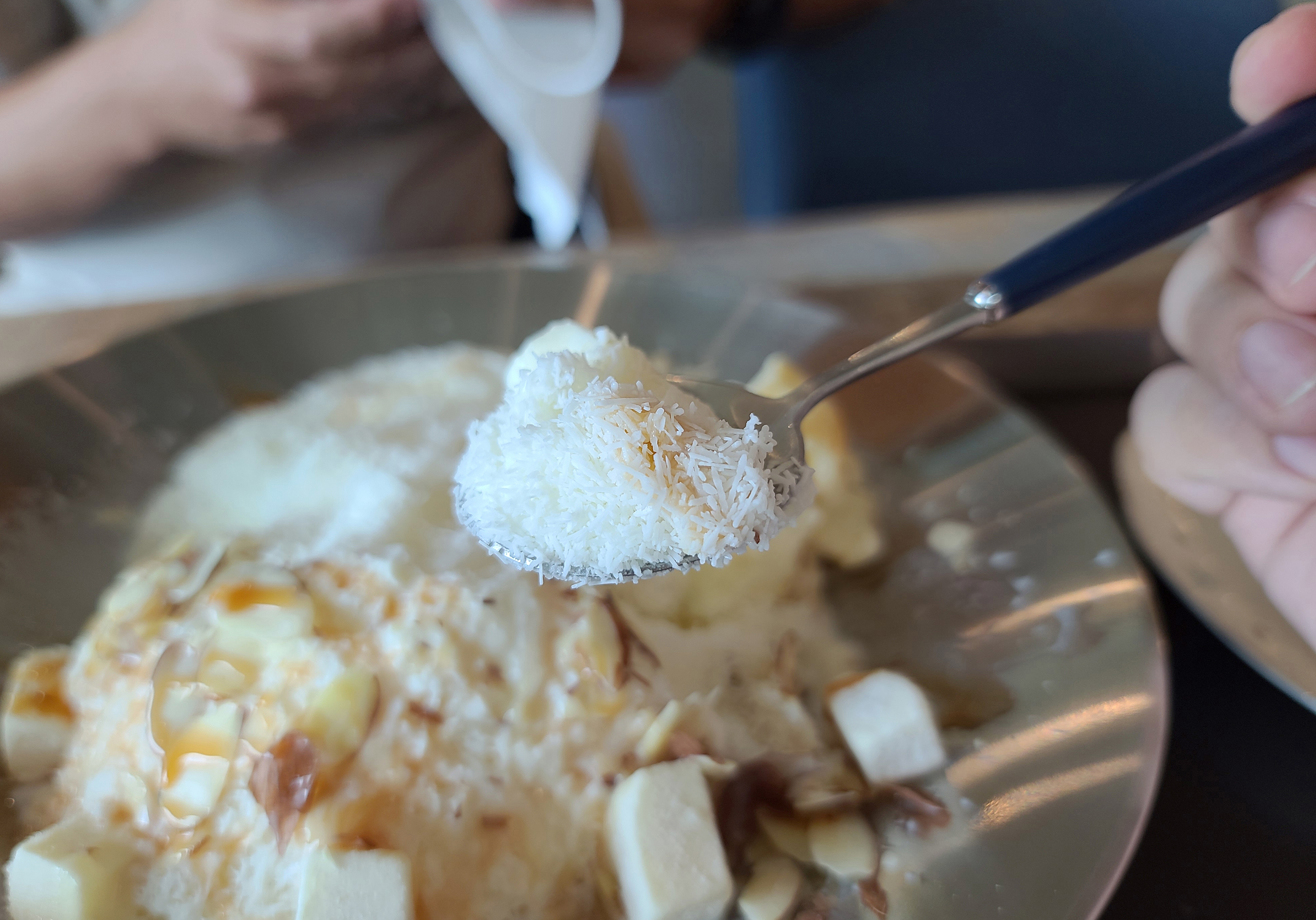 리얼 치즈빙수는 곱게 갈려 나온 우유빙수가 식감이 좋았습니다. 식감이 독특한데 부드러우면서도 입에 넣으면 바로 녹는 맛이었고, 치즈도 적당량 들어있어 맛은 괜찮았습니다. 금액이 15,000원이라서, 재료가 부실하면 아쉬웠을 텐데 재료도 나름 아낌없이 넣어주는 것 같더라고요.