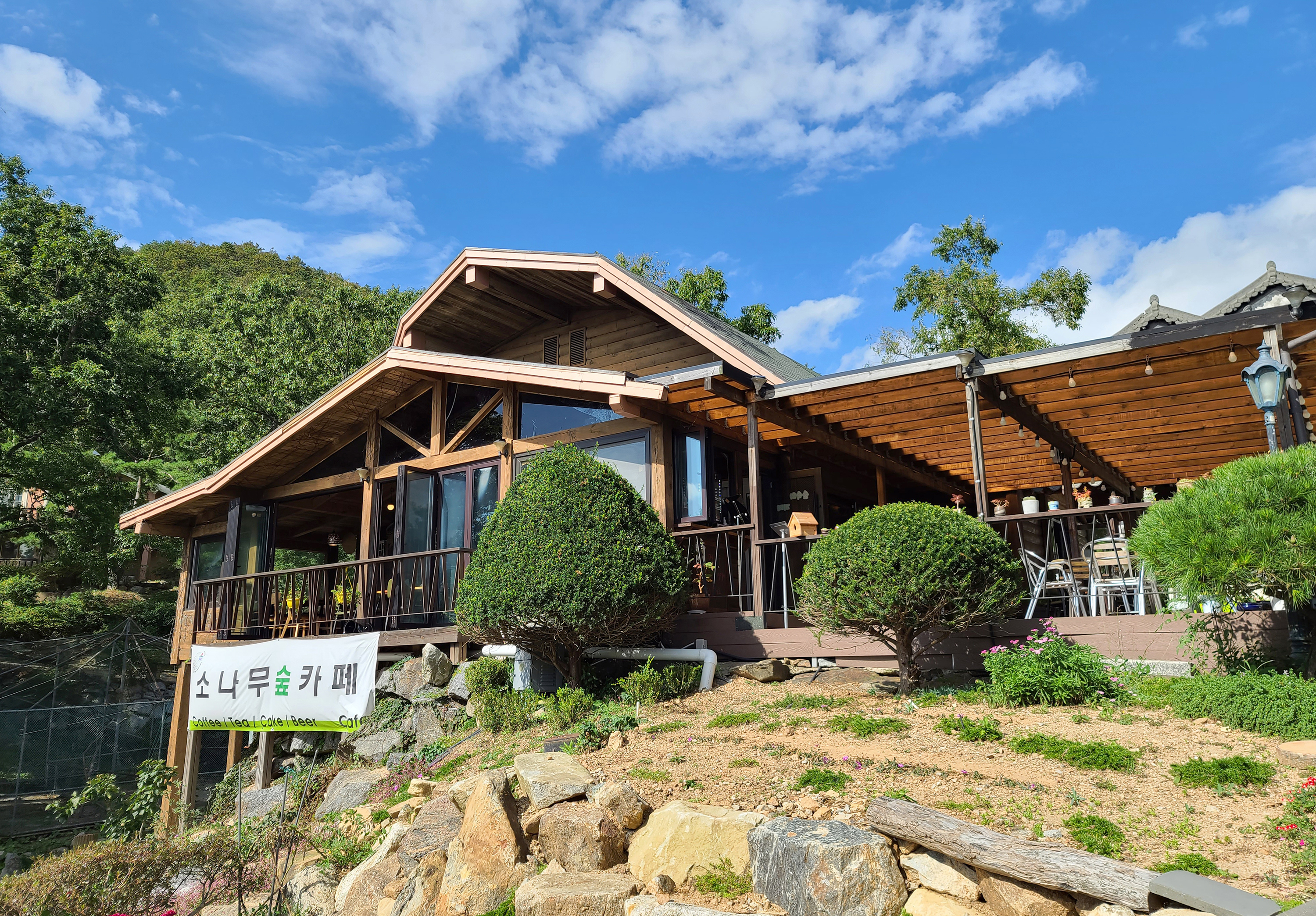 주차장을 따라 내려가니, 한가라지 카페보다 더 분위기 좋아 보이는 소나무 숲 카페가 보였으며, 야외 곳곳에 변기가 놓여있길래 뭐지 하고 보니까 재떨이로 사용 중이더라고요.(ㅋㅋ)