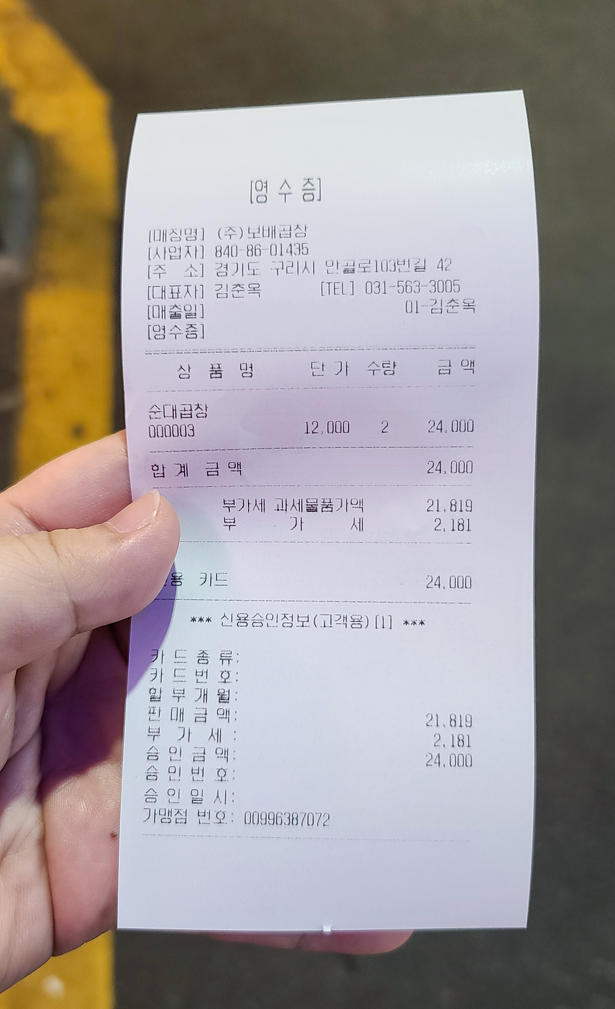 보배곱창에서 먹은 총금액은 24,000원이 나왔고, 가격도 괜찮은 편이라 나중에 기회가 된다면 다른 지인과도 함께 방문하면 좋을 것 같더라고요. 구리에서 워낙 유명한 가게이니, 한 번 기회가 있으실 때 이용해보셔도 좋을 것 같습니다.