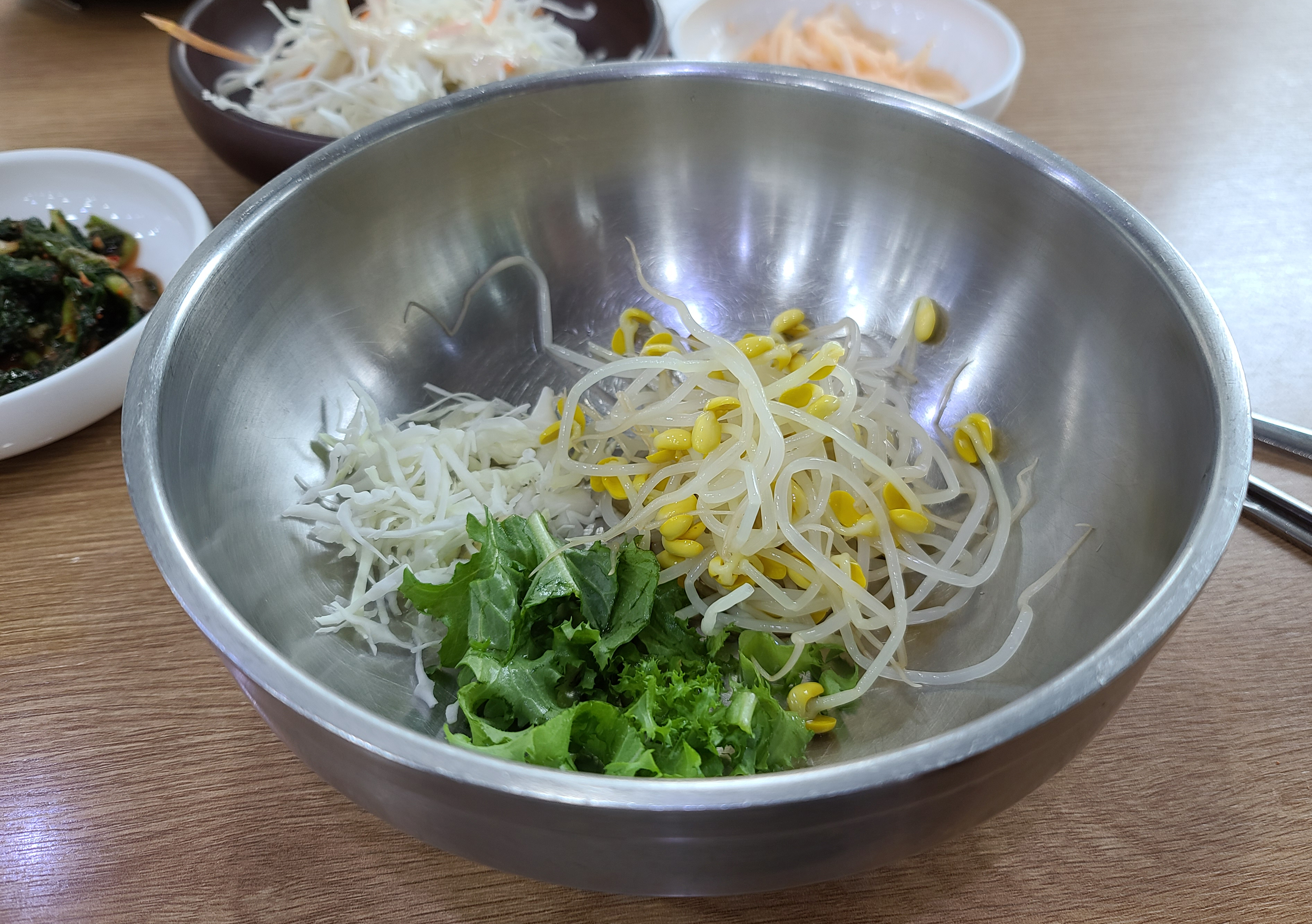 낙지덮밥은 위와 같이 양배추 샐러드, 무채, 열무김치, 어묵볶음이 밑반찬으로 나왔고, 밥을 비벼먹을 수 있도록 따로 그릇이 제공되었습니다. 별도로 일품낙지한마리 가게는 메뉴를 주문하니, 수제비를 서비스로 제공해주었습니다.