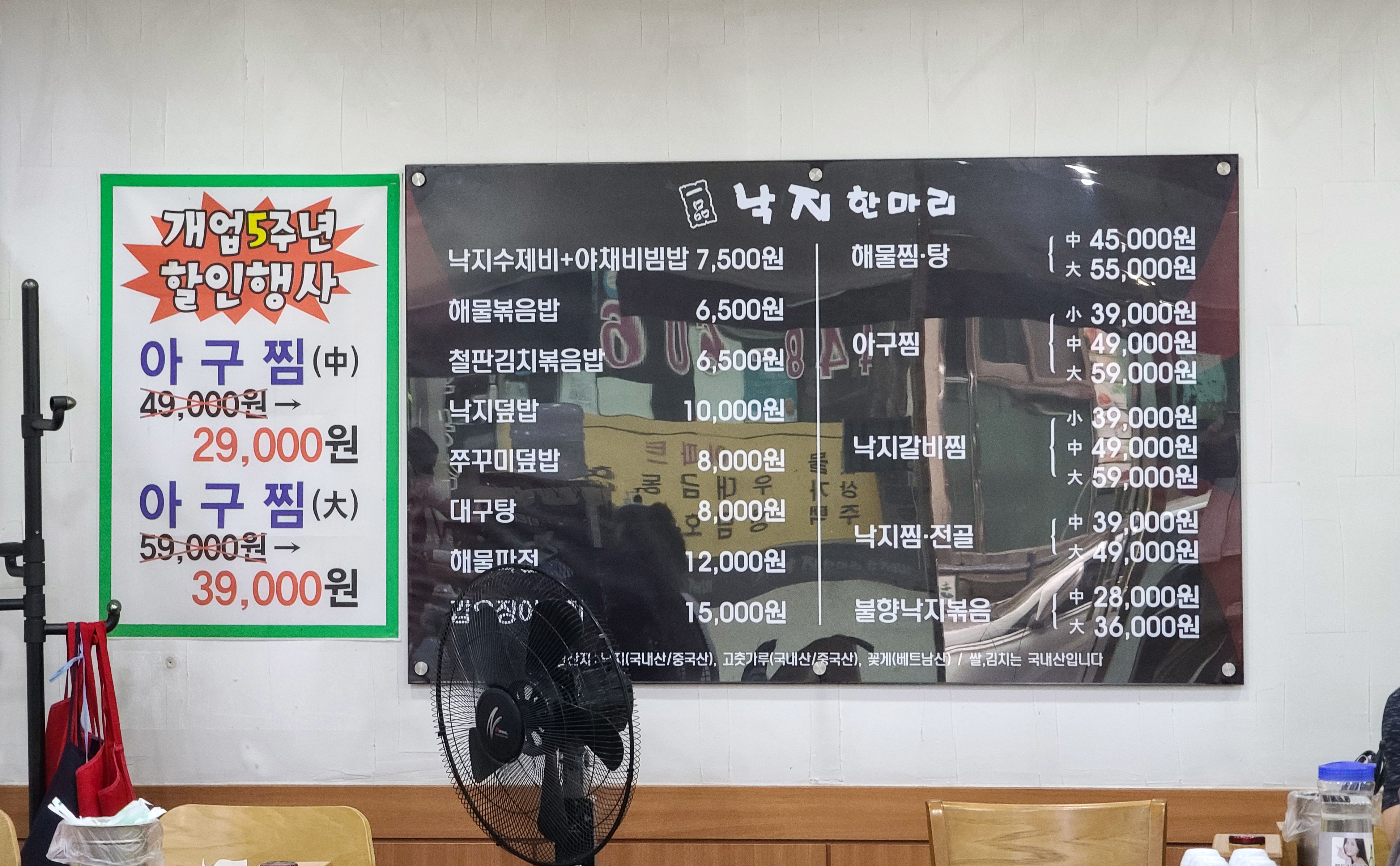 가게의 메뉴는 위와 같았습니다. 낙지수제비+야채비빔밥, 해물볶음밥, 철판김치볶음밥, 낙지덮밥, 쭈꾸미덮밥, 대구탕, 해물파전, 갑오징어숙회, 해물찜・탕, 아구찜, 낙지갈비찜, 낙지찜・전골, 불향낙지볶음이 있었습니다. 저희는 낙지덮밥 2인분을 주문하였습니다.