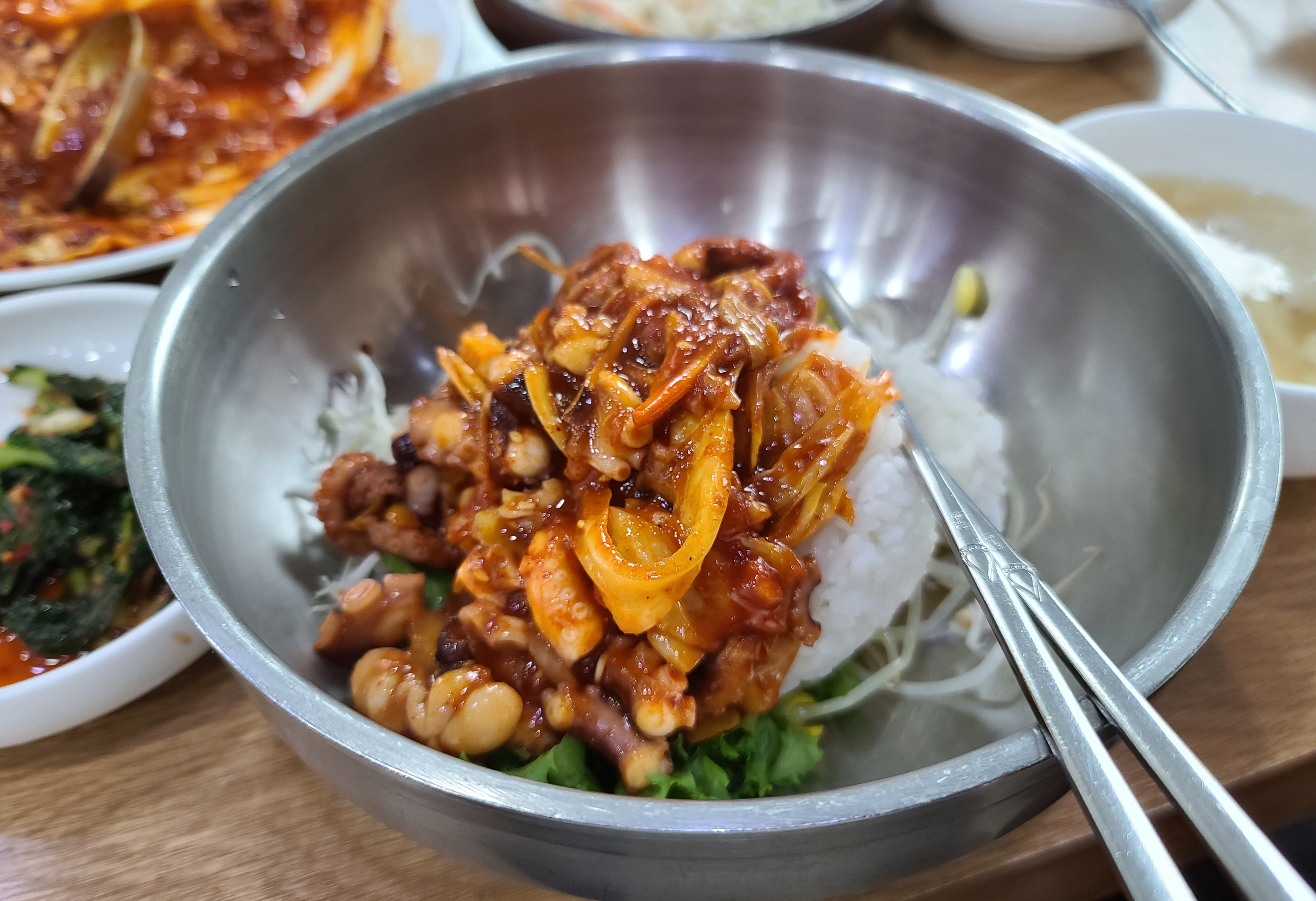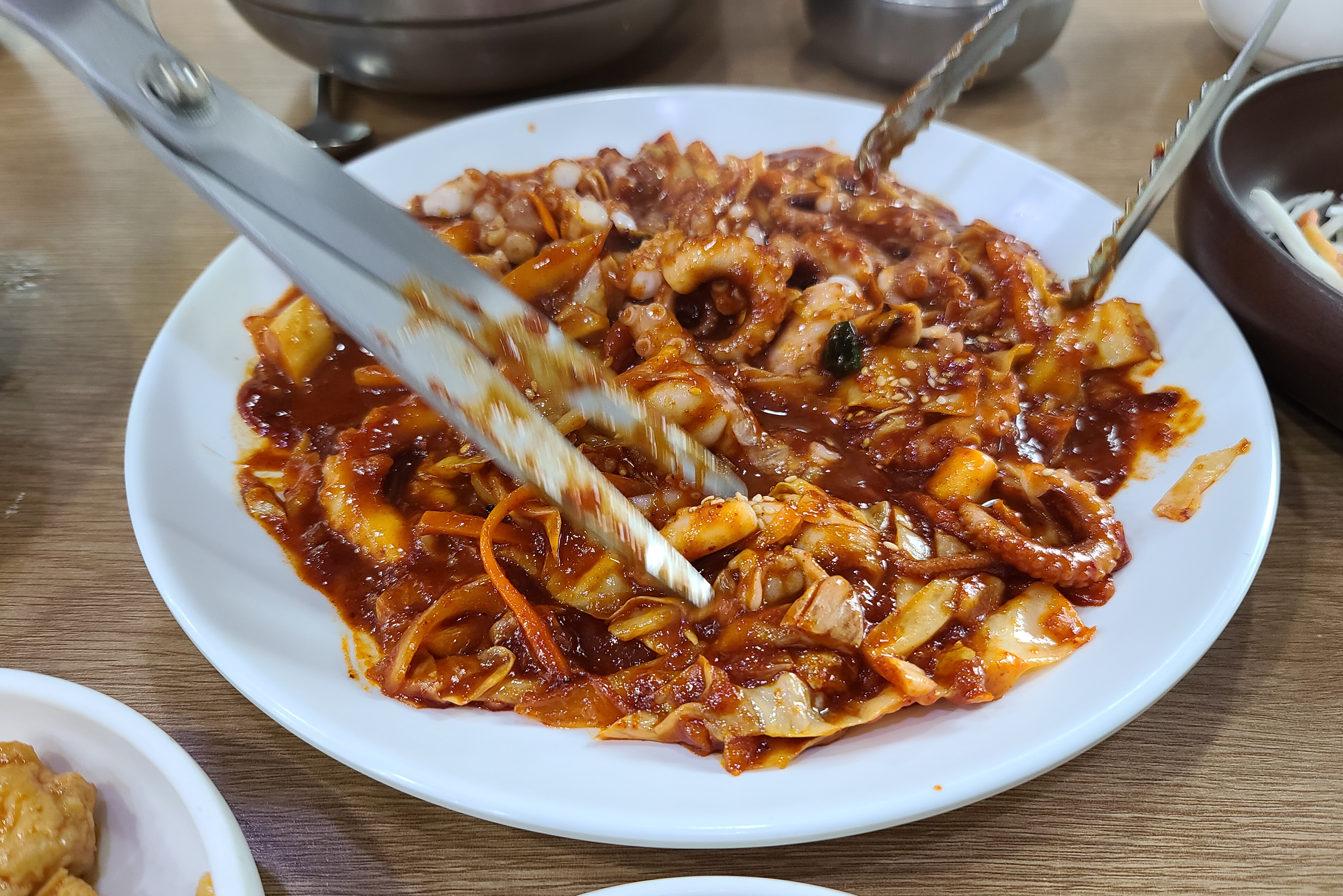 일품 낙지 한 마리의 낙지덮밥은 위와 같이 낙지볶음을 밥과 채소위에 얹어서 슥슥 비벼먹으면 되었습니다. 낙지볶음은 매콤하니 먹을만했는데, 생각보다 크게 맛있다는 생각은 안 들더라고요. 가까운 곳에 워낙 유명한 낙지볶음 맛집이 있어서 상대적으로, 덜 맛있게 느껴졌던 가게입니다.