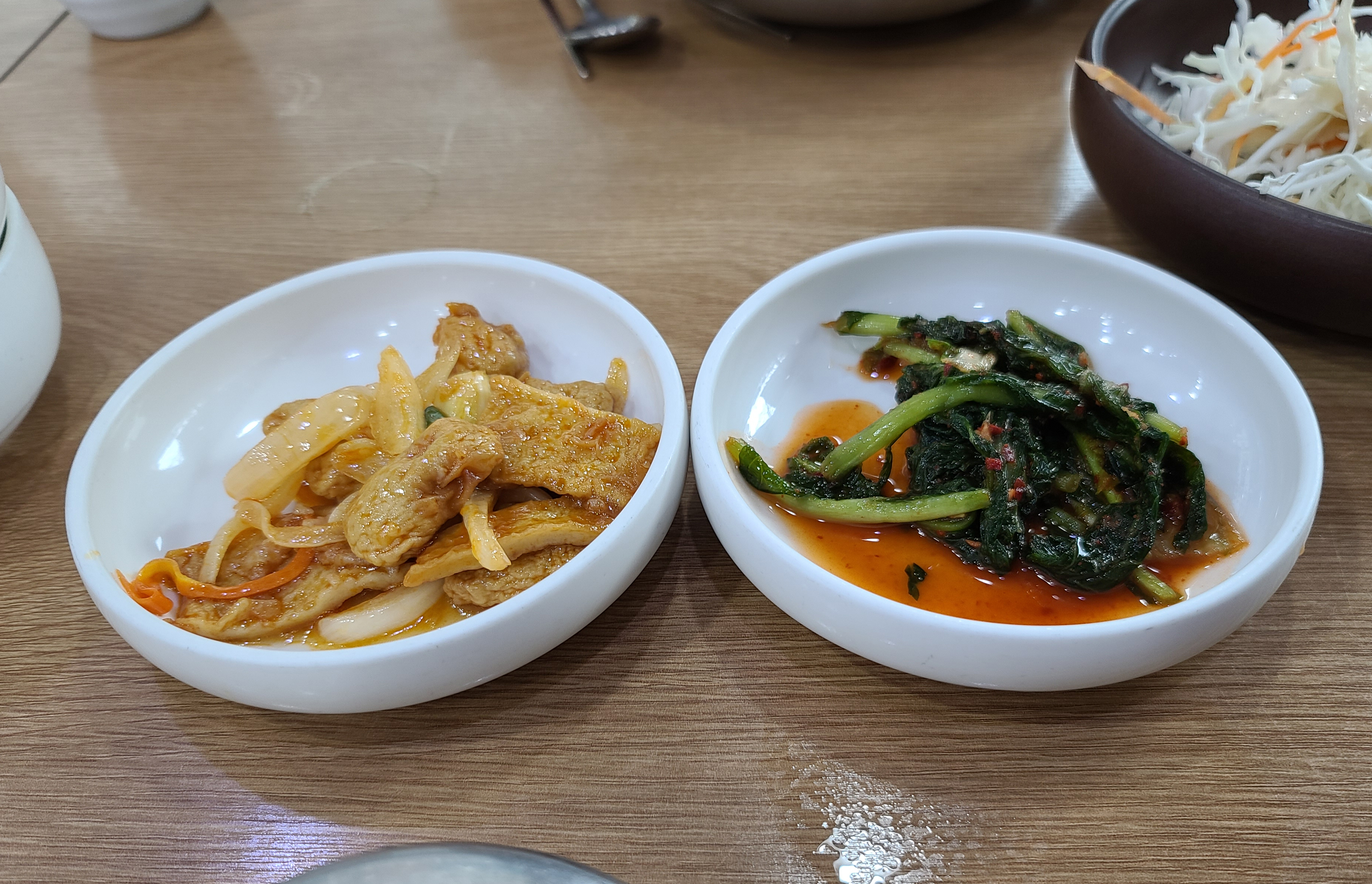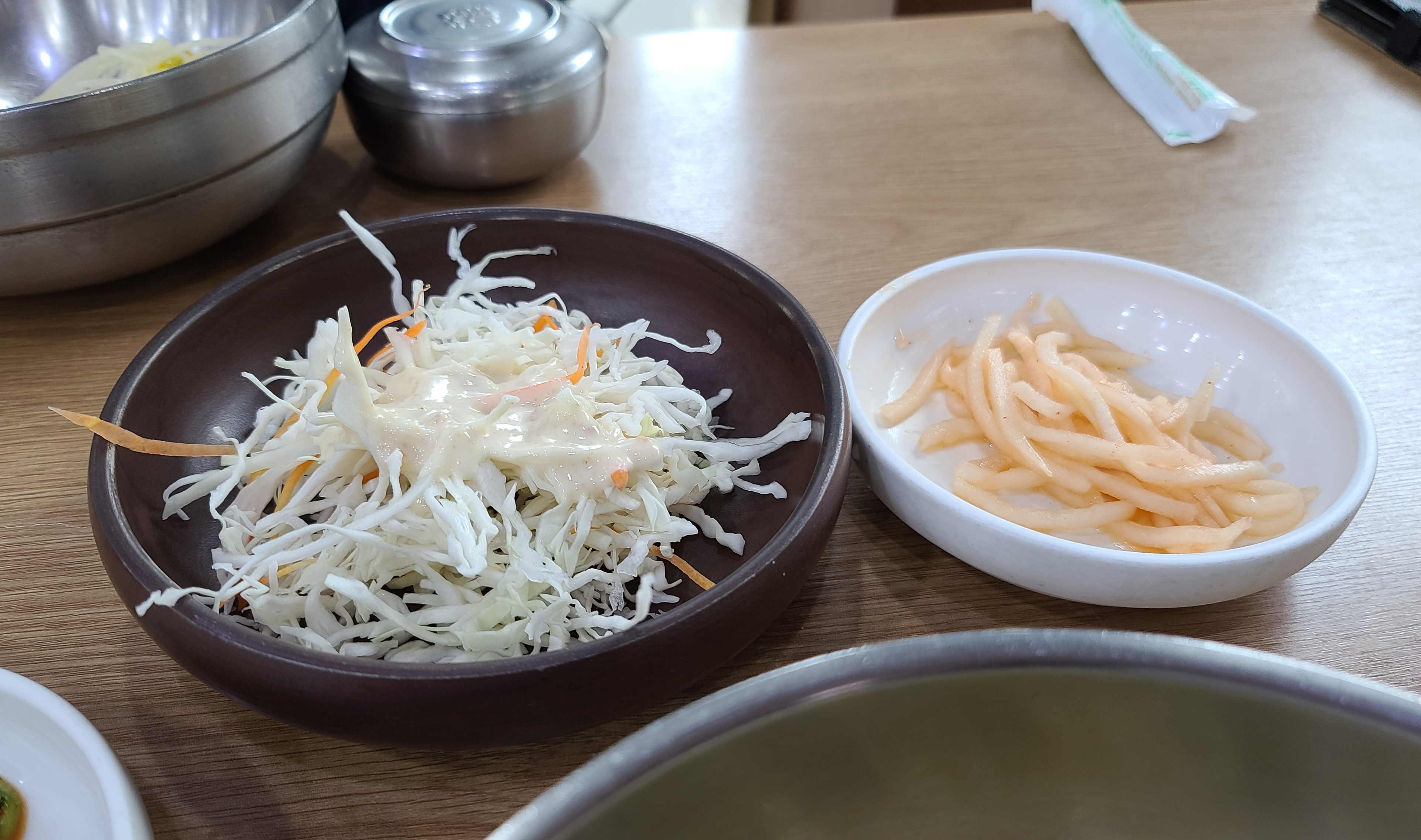 낙지덮밥은 위와 같이 양배추 샐러드, 무채, 열무김치, 어묵볶음이 밑반찬으로 나왔고, 밥을 비벼먹을 수 있도록 따로 그릇이 제공되었습니다. 별도로 일품낙지한마리 가게는 메뉴를 주문하니, 수제비를 서비스로 제공해주었습니다.