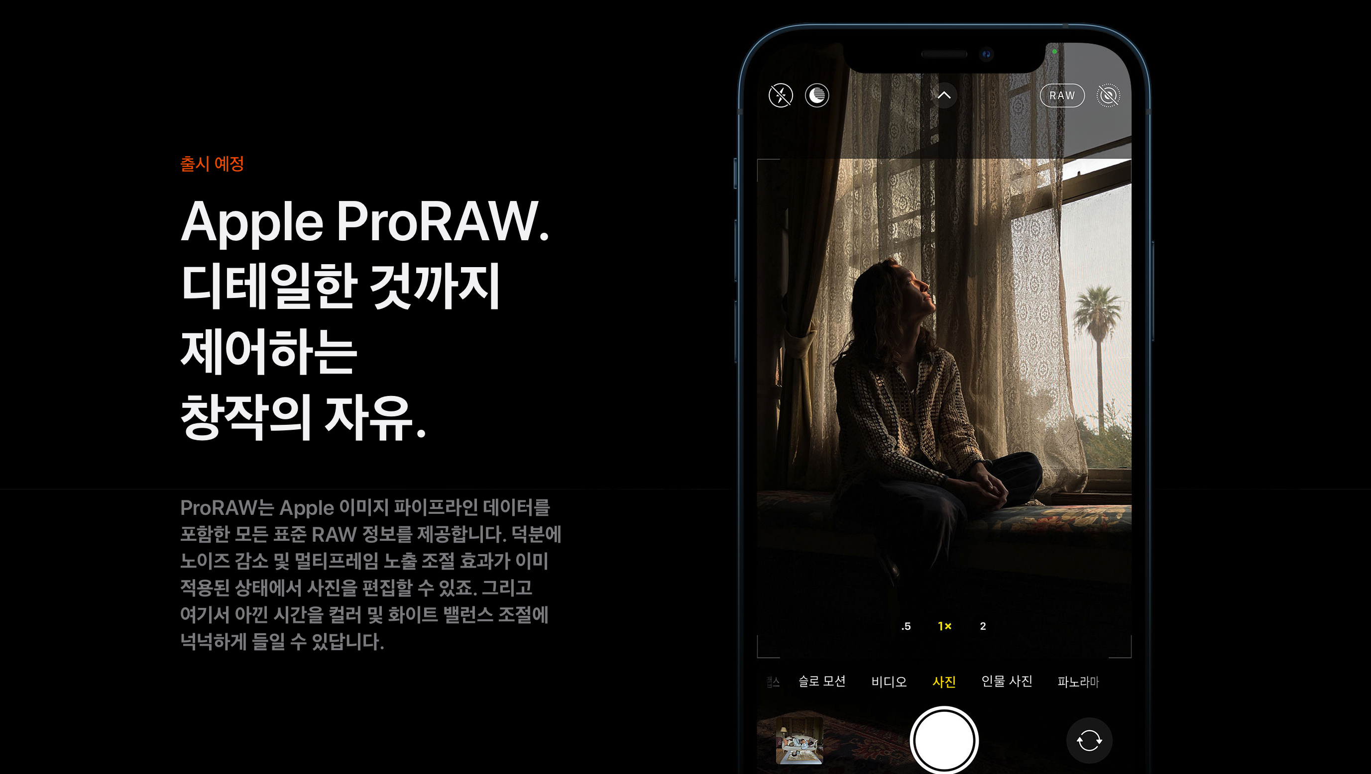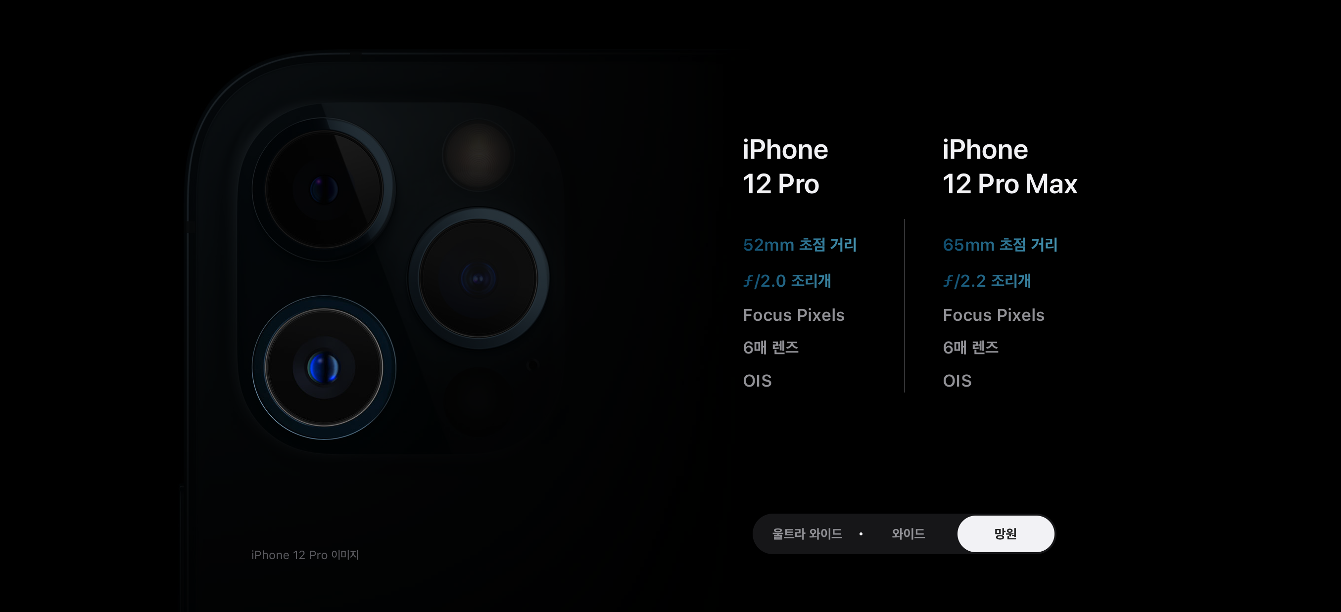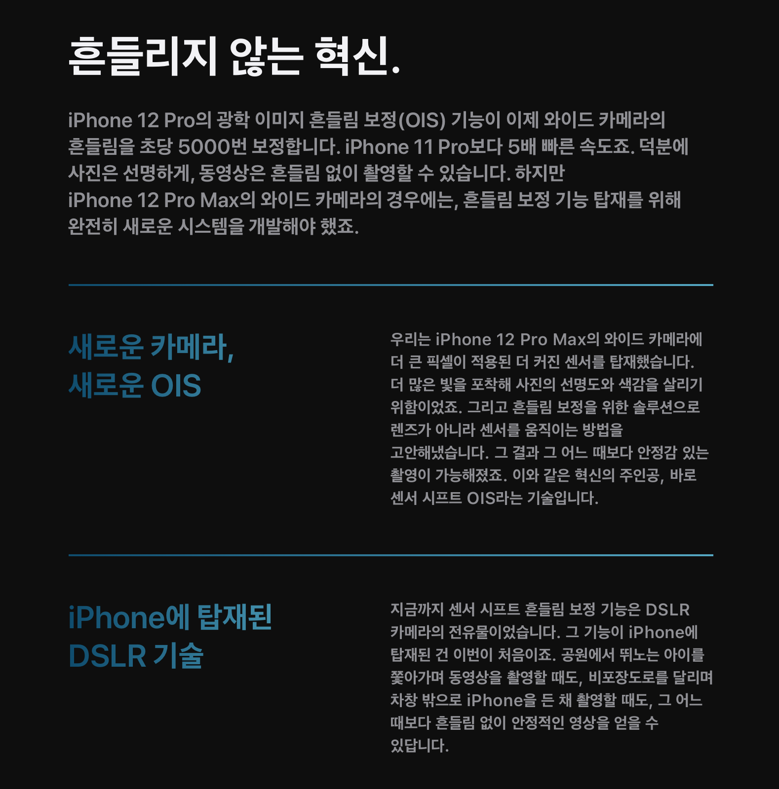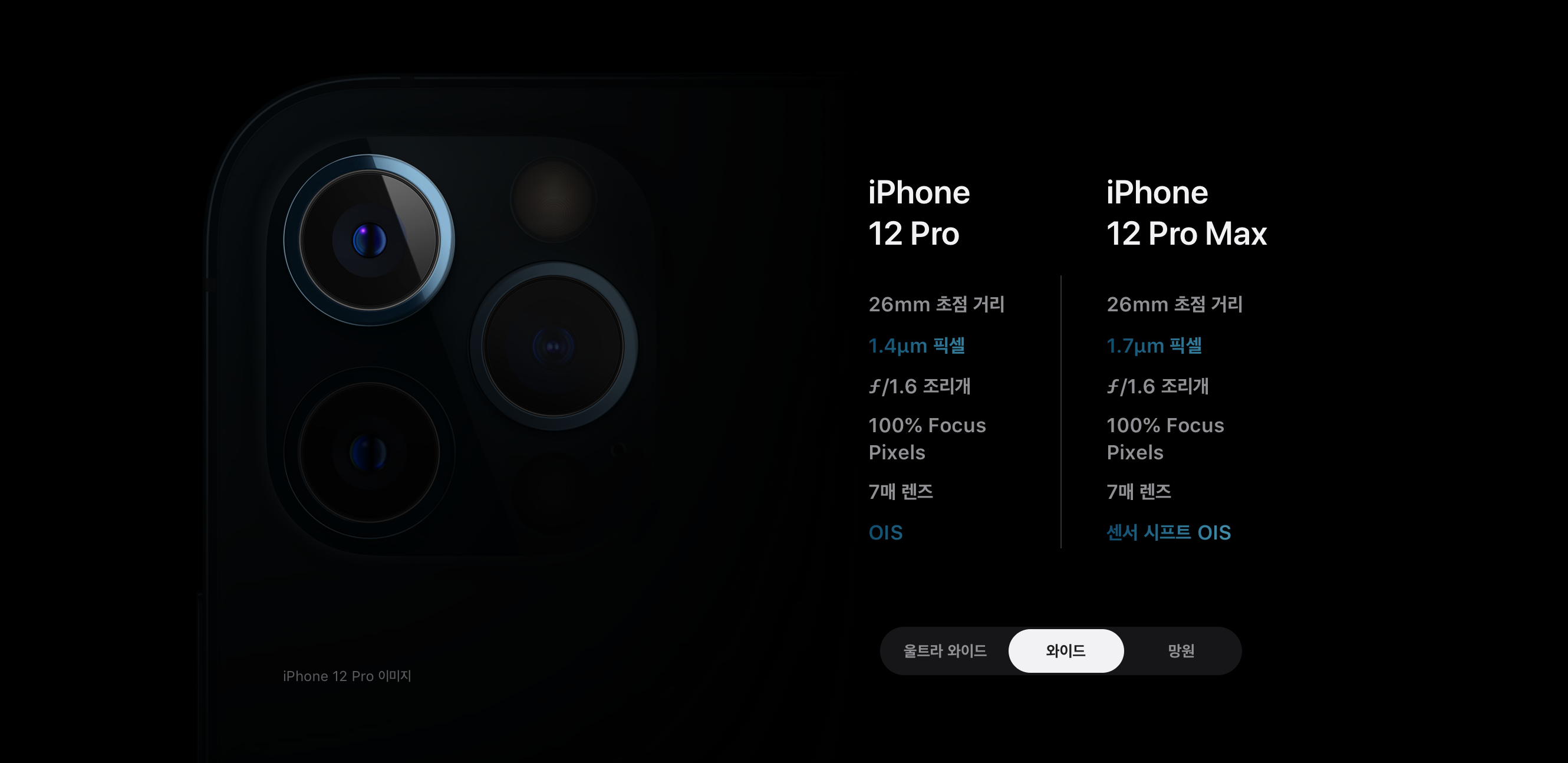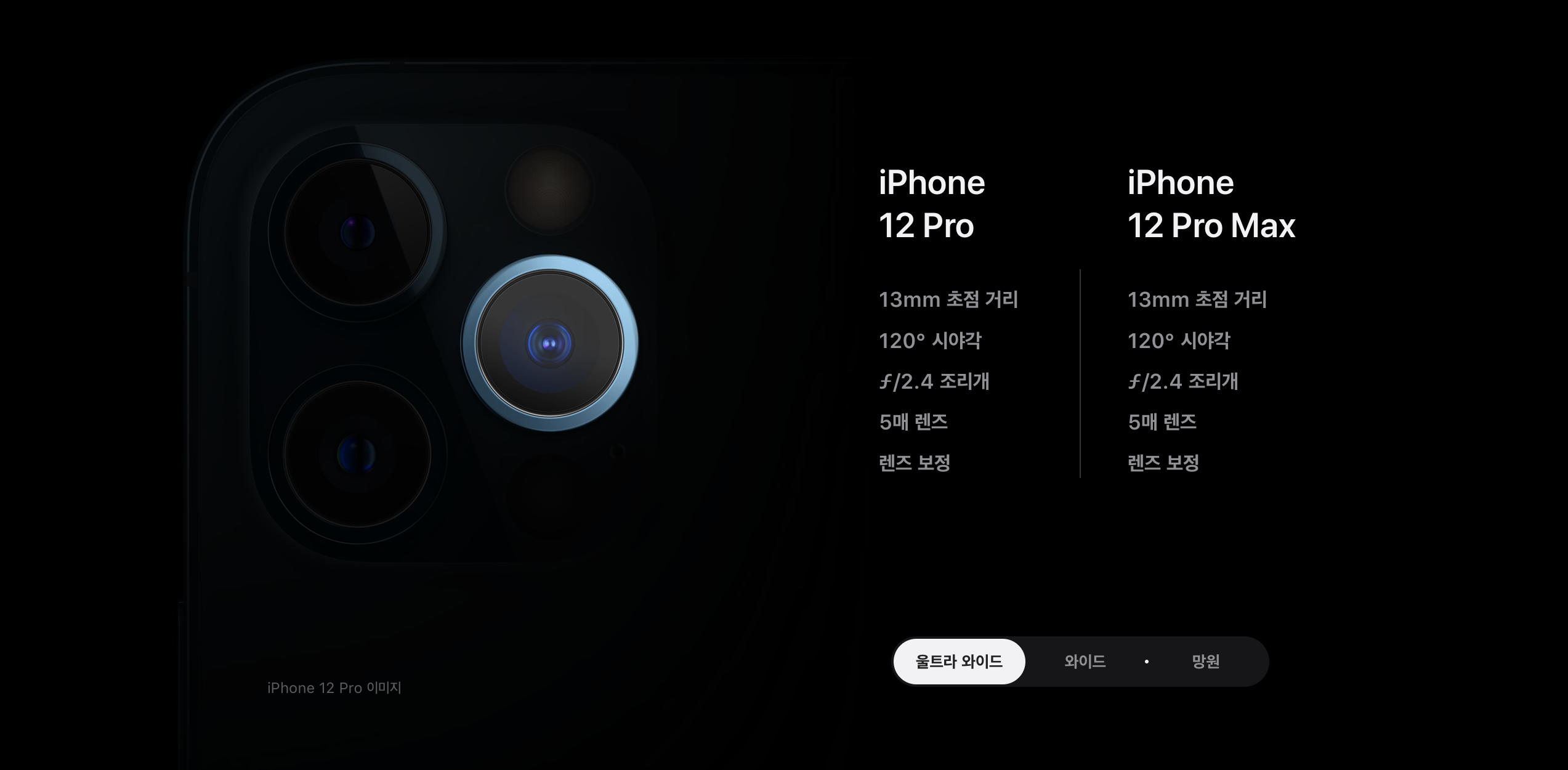 아이폰 12 프로와 12 시리즈의 가장 큰 차이는 카메라의 성능 차이라 볼 수 있는데요, 더 나아진 초광각, 광각, 망원 모드의 카메라를 비롯해 LiDAR 센서(동일)와 센서 시프트 보정(Max에 한함)기능으로 주간이나 야간 모두 더 나은 품질의 사진을 촬영할 수 있게 되었습니다. 사진 전문가들에게 반가운 RAW 이미지 촬영도 가능해졌습니다. (아이폰 12 Pro의 경우 Dolby Vision 촬영 시 4K 최대 60 프레임 지원)