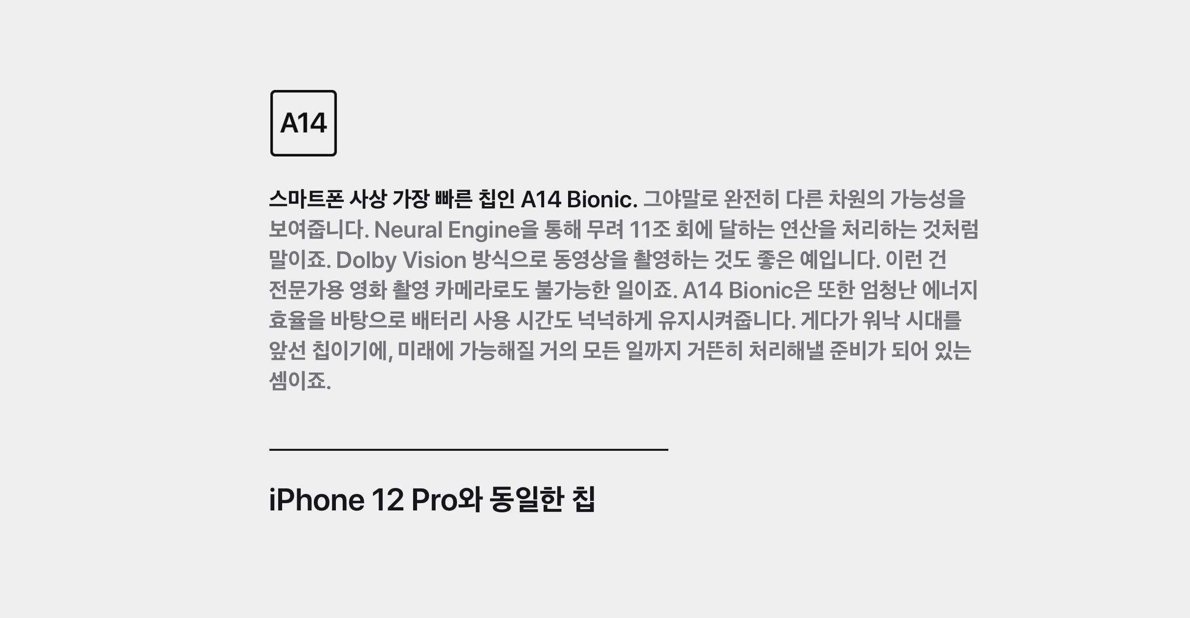 항상 뛰어난 성능을 보여주고 있는, 애플의 새로운 A14 Bionic 칩은 더 빠른 속도와 고급 연산 처리과정을 통해 사진이나 동영상을 촬영하는 과정, 게임, 배터리의 효율까지도 높여주고 있다고 합니다. (아이폰 12 Pro와 동일한 칩이라 합니다.)