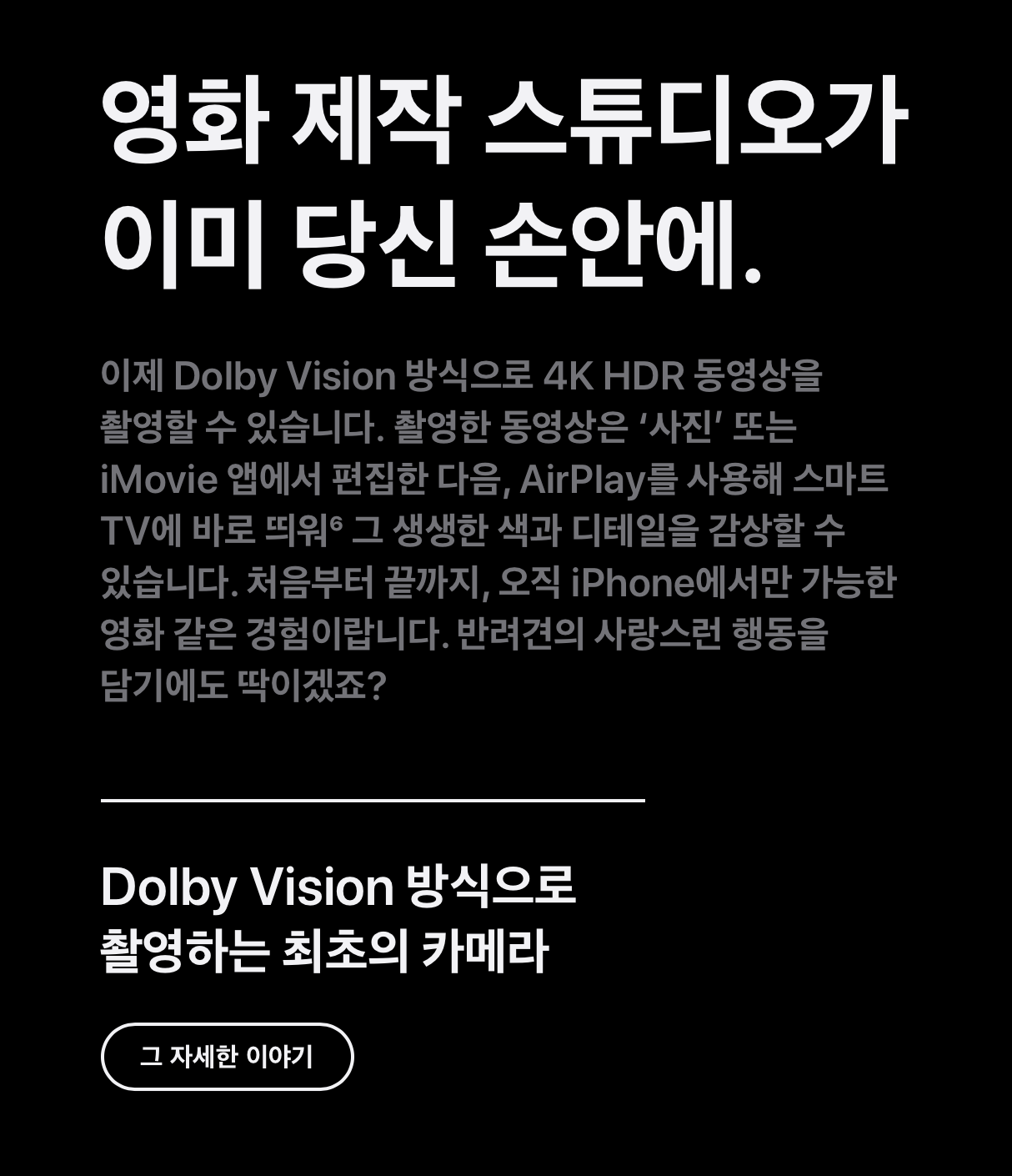 이번 아이폰 12는 새로운 기능이 추가되었는데, Dolby Vision 방식으로 4K HDR 촬영을 지원하고 있어, 기존의 8비트 촬영 성능을 10비트 까지 색을 받아들여 7억 가지의 색을 아이폰으로 포착할 수 있게 되었습니다. 심지어 이 Dolby Vision 영상을 아이폰에서 편집할 수도 있고, 공유도 가능합니다. (iPhone 12 는 초당 30 프레임, iPhone 12 Pro 는 초당 60 프레임 지원)