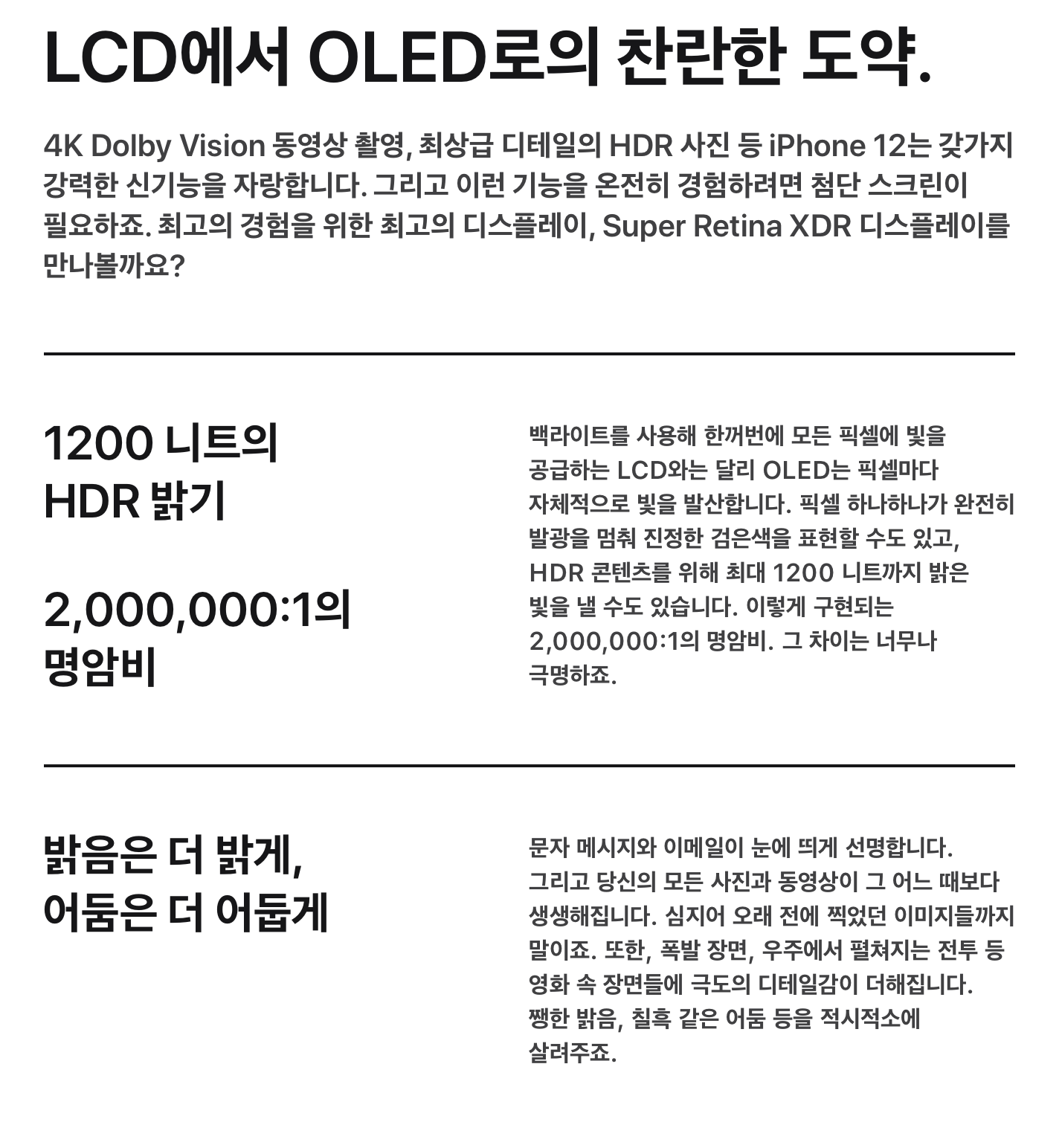 디스플레이의 성능은 일반 사용 시 800 니트의 밝기를 제외하면, 아이폰 12와 12 mini와 동일합니다. HDR 콘텐츠 이용 시 최대 1200니트 밝기로 아이폰 12 제품 모두 동일한 밝기를 보여준다고 합니다.