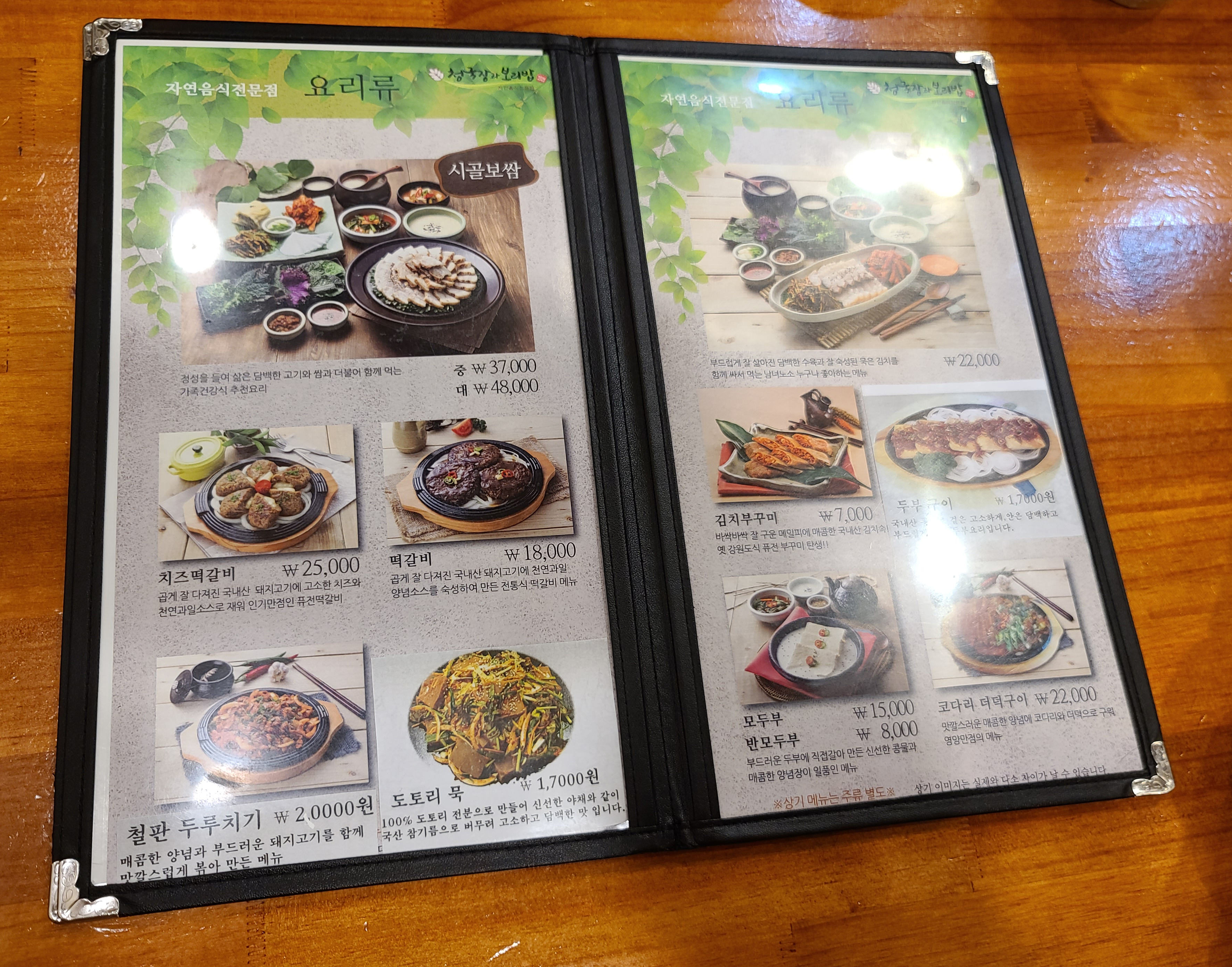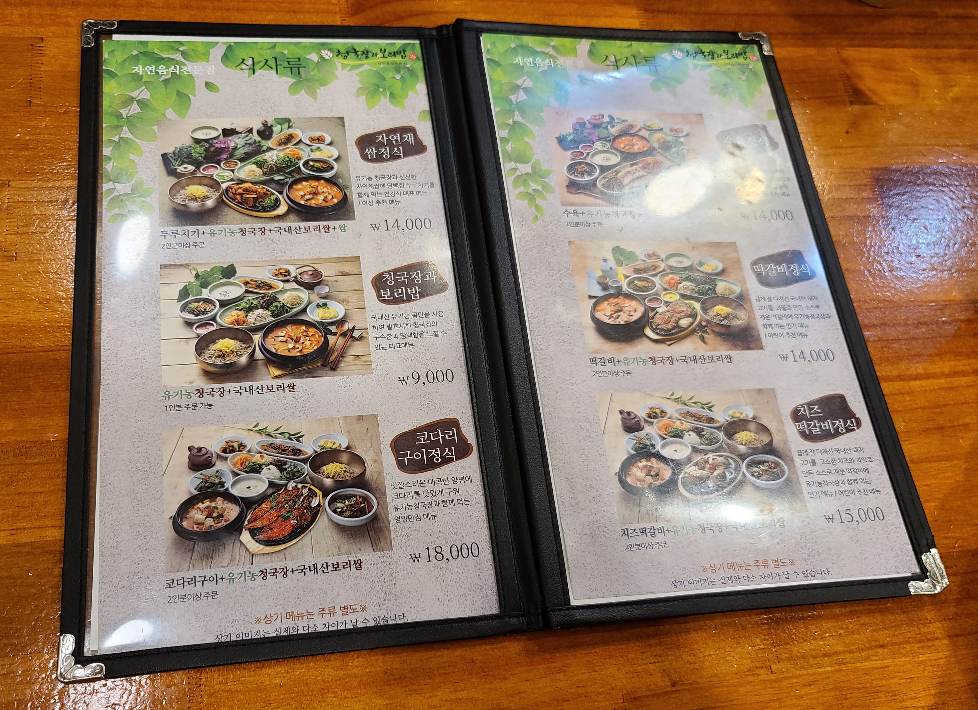 청국장과 보리밥 수서점의 메뉴는 위와 같습니다. 자연채쌈정식, 청국장과보리밥, 코다리구이정식, 수육정식, 떡갈비정식, 치즈떡갈비정식, 시골보쌈, 치즈떡갈비, 떡갈비, 철판두루치기, 도토리묵, 수육, 김치부꾸미, 두부구이, 모두부/반모두부, 코다리더덕구이, 감자전, 해물파전, 녹두전, 청양부추전 등 이 있었습니다. 저희는 청국장과 보리밥의 '자연채쌈정식'과 '떡갈비정식'을 주문했습니다.
