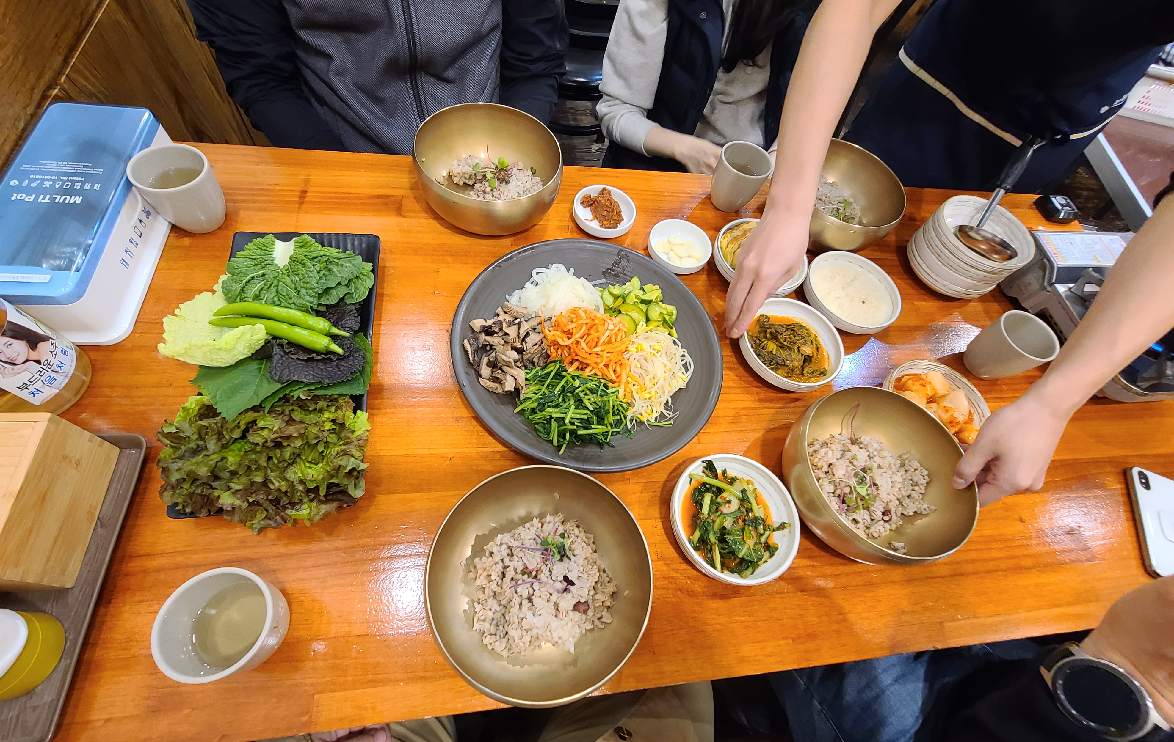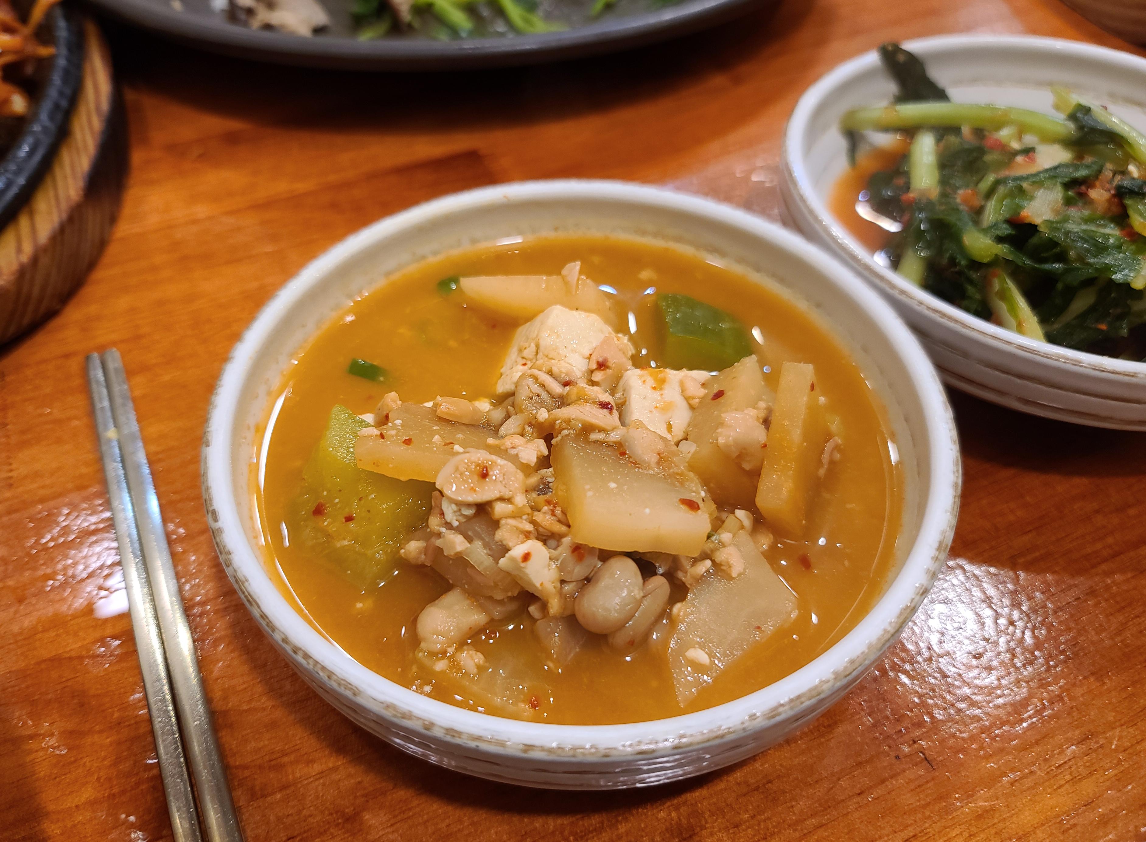 곧이어 청국장 정식 메뉴가 준비되었습니다. 갖가지 채소들과 반찬들이 나왔고, 쌈정식에 나오는 제육볶음과 떡갈비도 함께 나왔습니다. 그리고 메인 요리인 청국장이 큼지막한 뚝배기에 나왔습니다. 반찬들은 깔끔하게 잘 만들어졌고, 전체적으로 자극적이지 않아서 괜찮았습니다.
