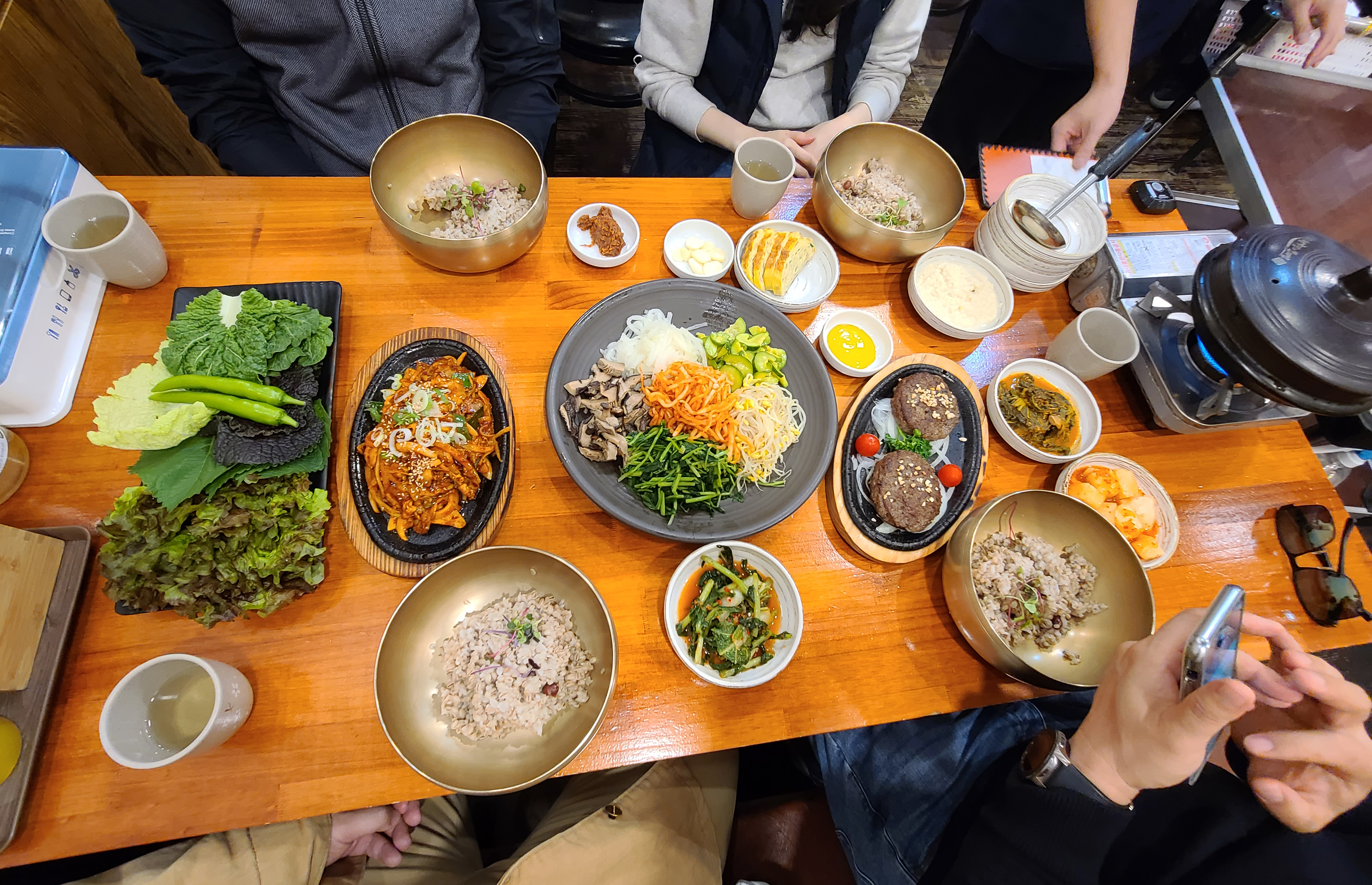 곧이어 청국장 정식 메뉴가 준비되었습니다. 갖가지 채소들과 반찬들이 나왔고, 쌈정식에 나오는 제육볶음과 떡갈비도 함께 나왔습니다. 그리고 메인 요리인 청국장이 큼지막한 뚝배기에 나왔습니다. 반찬들은 깔끔하게 잘 만들어졌고, 전체적으로 자극적이지 않아서 괜찮았습니다.