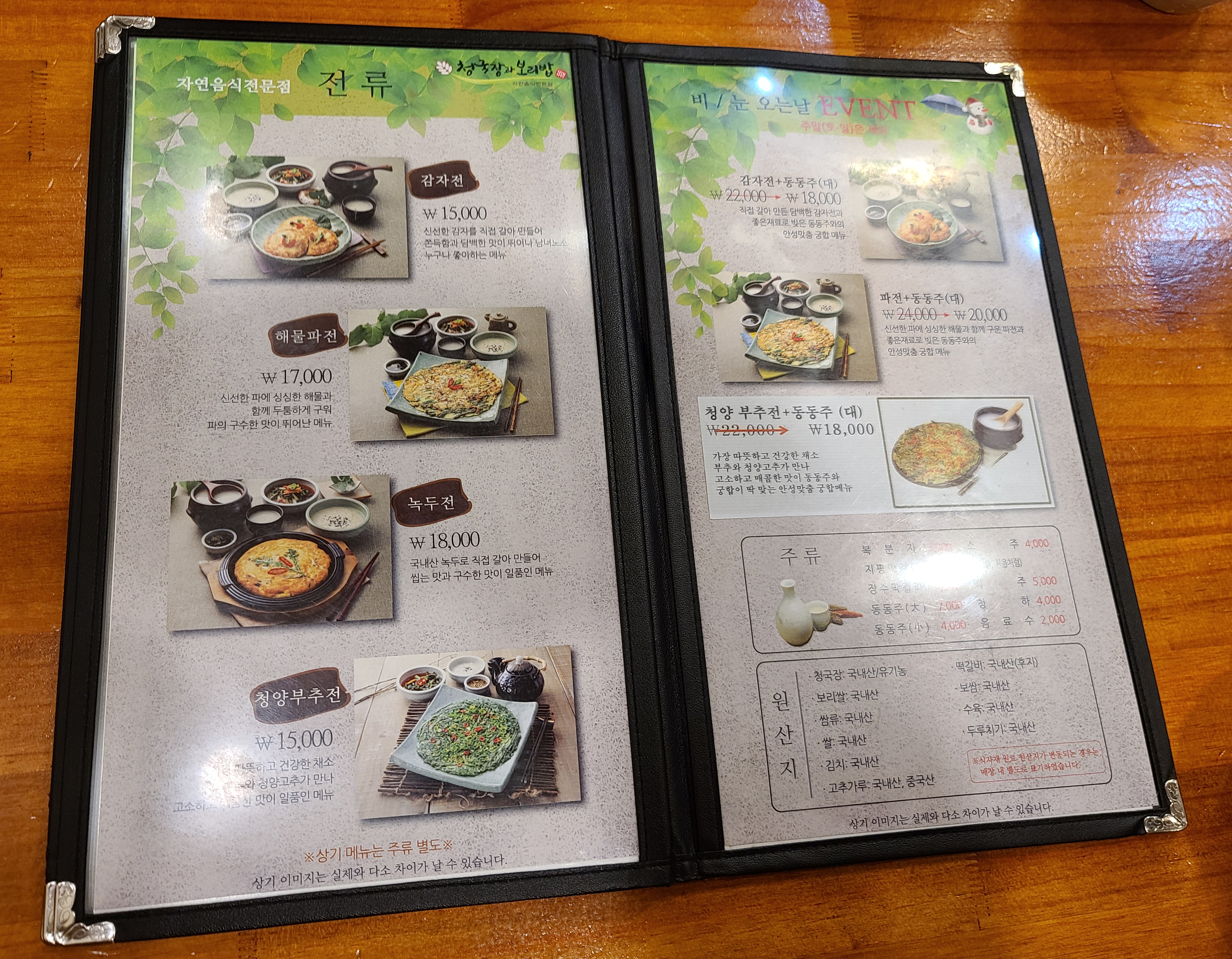 청국장과 보리밥 수서점의 메뉴는 위와 같습니다. 자연채쌈정식, 청국장과보리밥, 코다리구이정식, 수육정식, 떡갈비정식, 치즈떡갈비정식, 시골보쌈, 치즈떡갈비, 떡갈비, 철판두루치기, 도토리묵, 수육, 김치부꾸미, 두부구이, 모두부/반모두부, 코다리더덕구이, 감자전, 해물파전, 녹두전, 청양부추전 등 이 있었습니다. 저희는 청국장과 보리밥의 '자연채쌈정식'과 '떡갈비정식'을 주문했습니다.