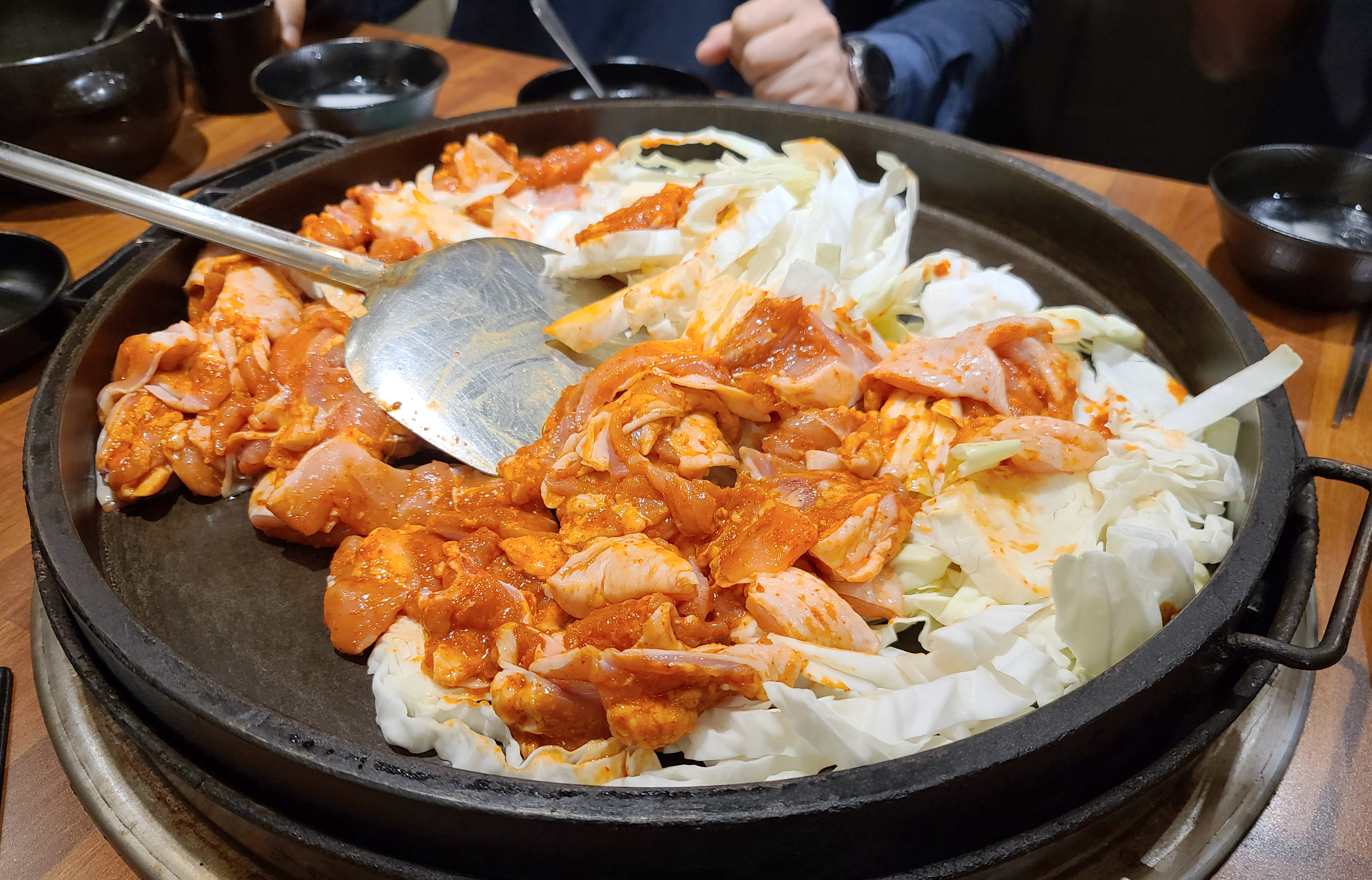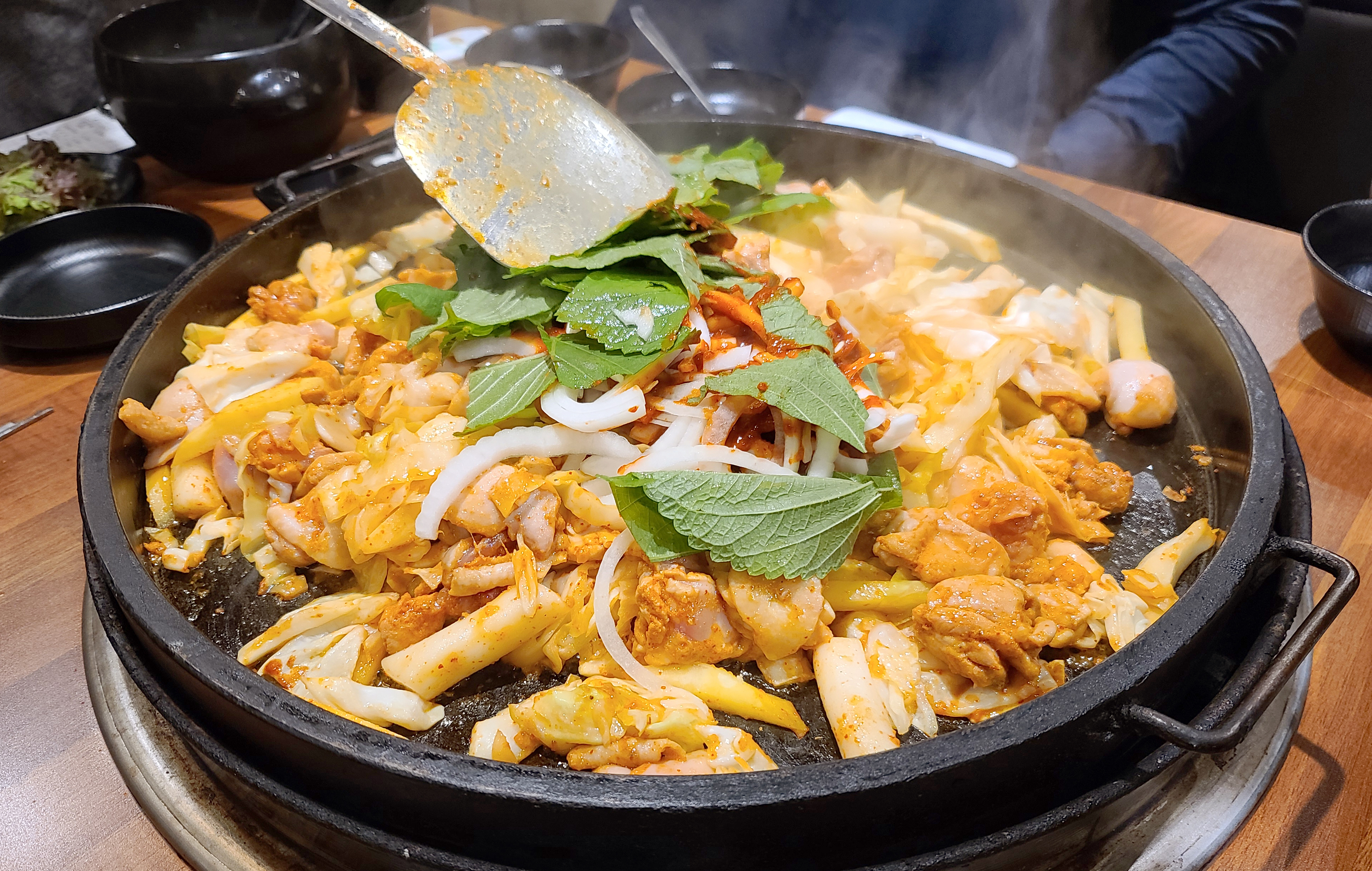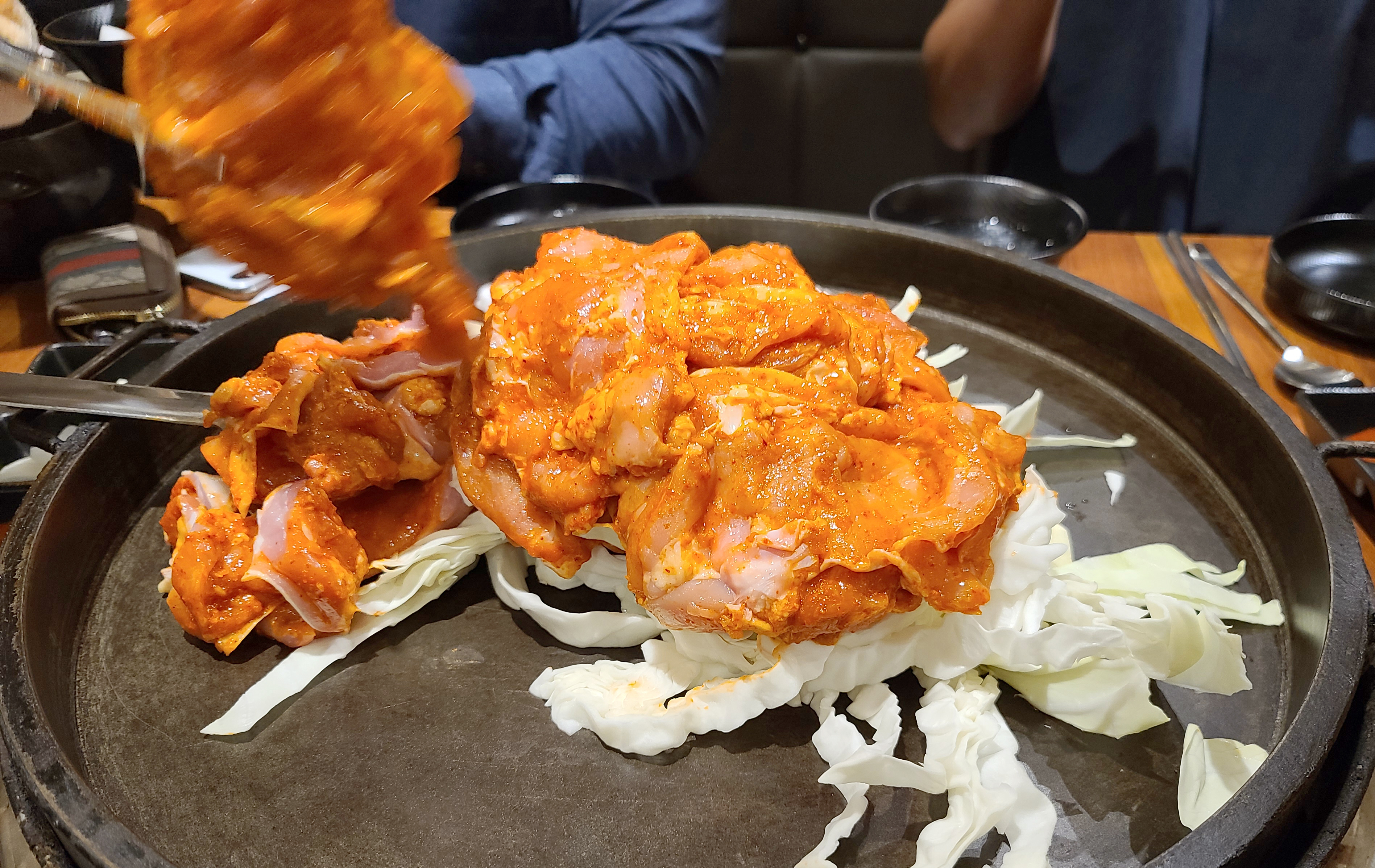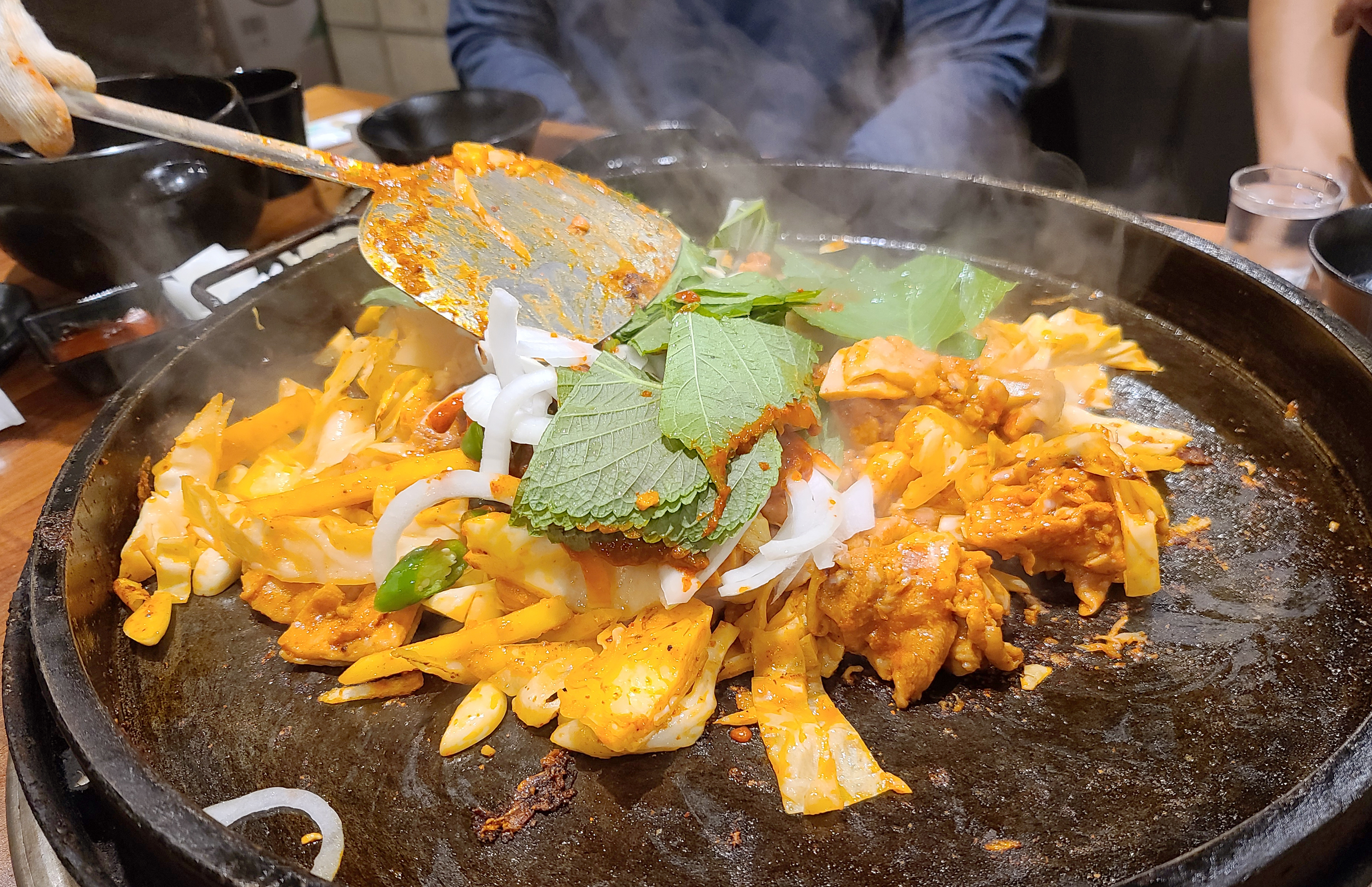 이 날 닭갈비를 넉넉하게 먹기 위해 추가로 주문했는데, 불판을 스크래퍼로 긁어낸 뒤 다시 시작된 닭갈비 조리과정. 두 번째 먹는데도 닭갈비는 역시나 맛있더라고요.
