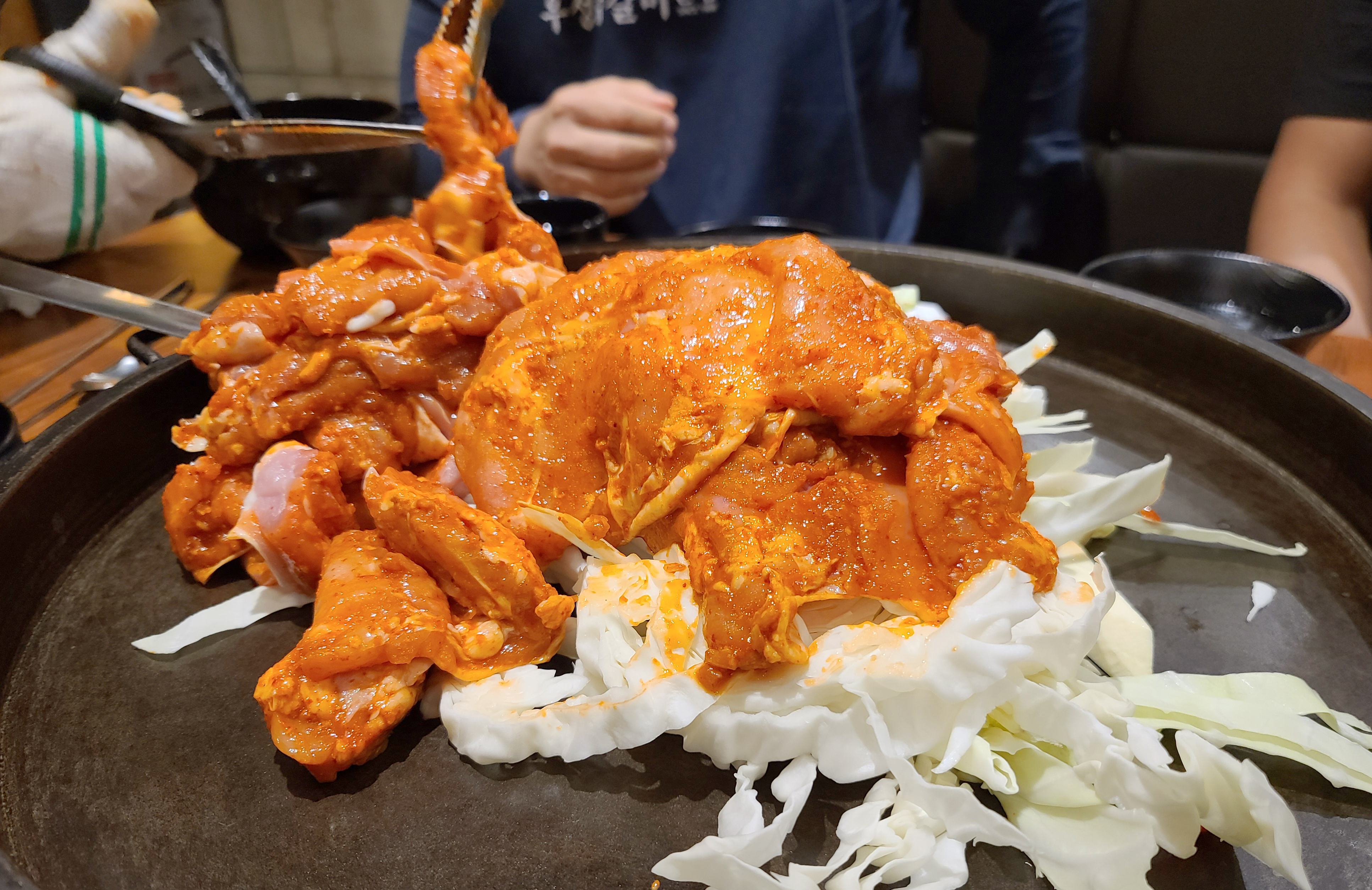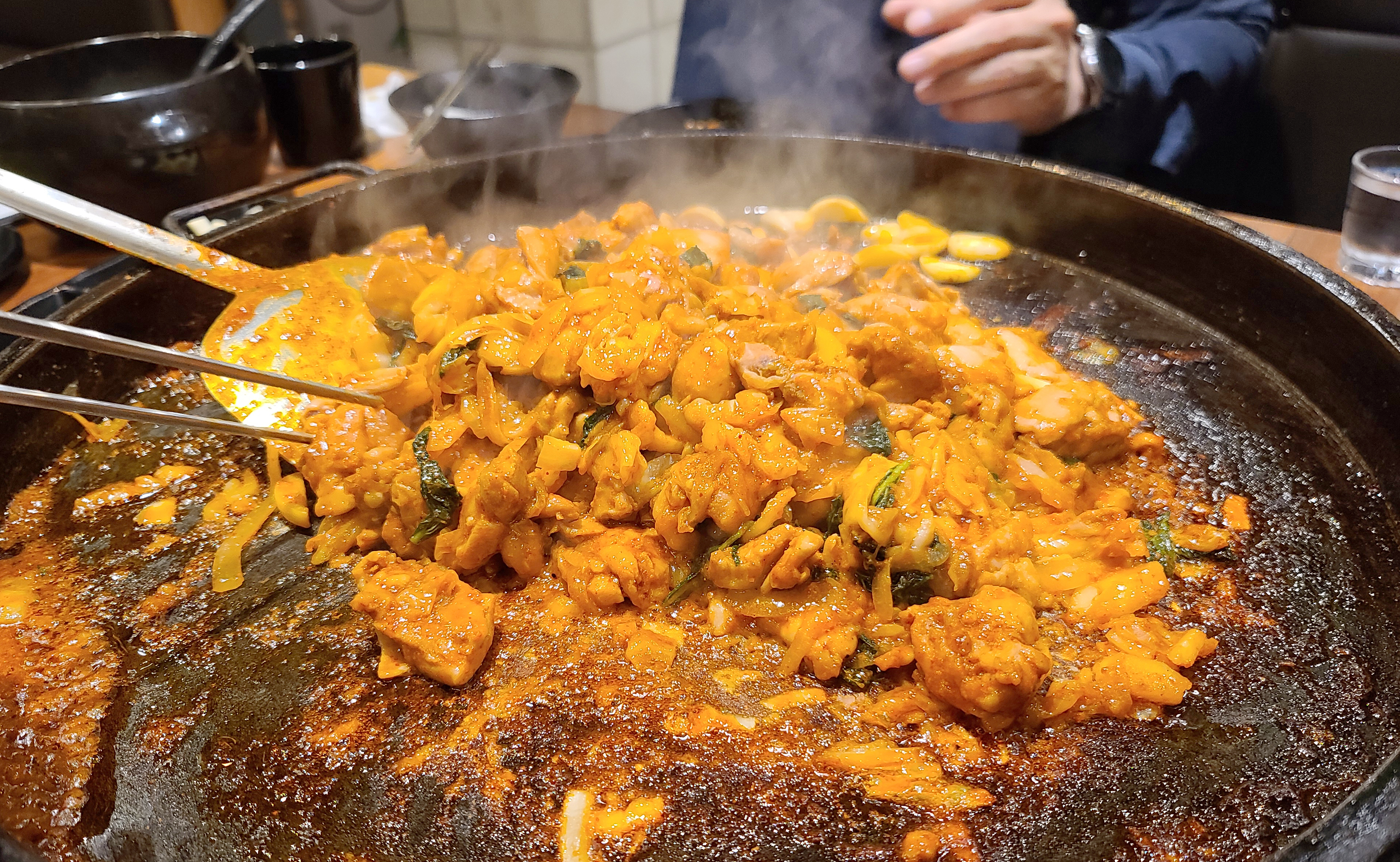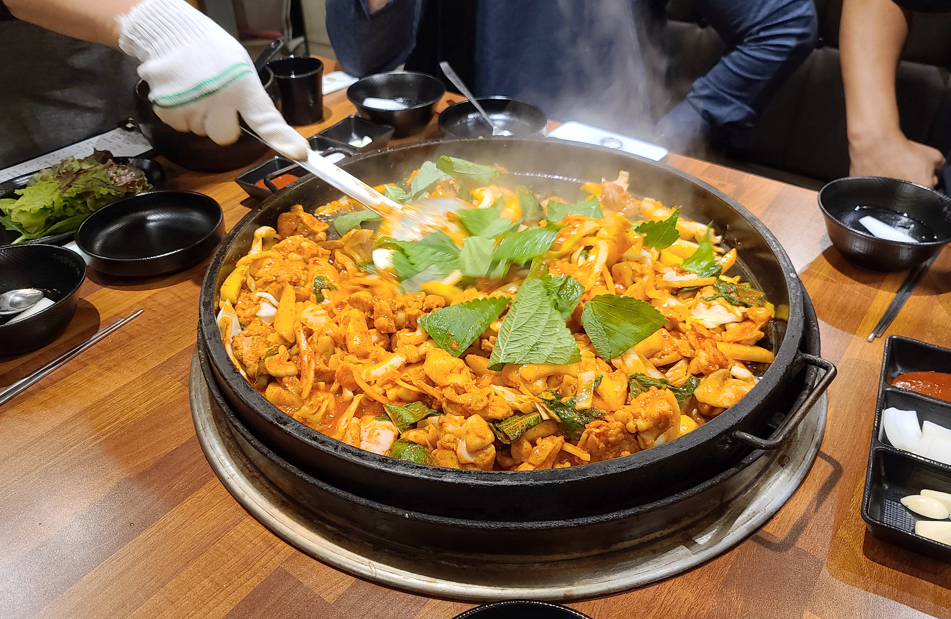 이 날 닭갈비를 넉넉하게 먹기 위해 추가로 주문했는데, 불판을 스크래퍼로 긁어낸 뒤 다시 시작된 닭갈비 조리과정. 두 번째 먹는데도 닭갈비는 역시나 맛있더라고요.