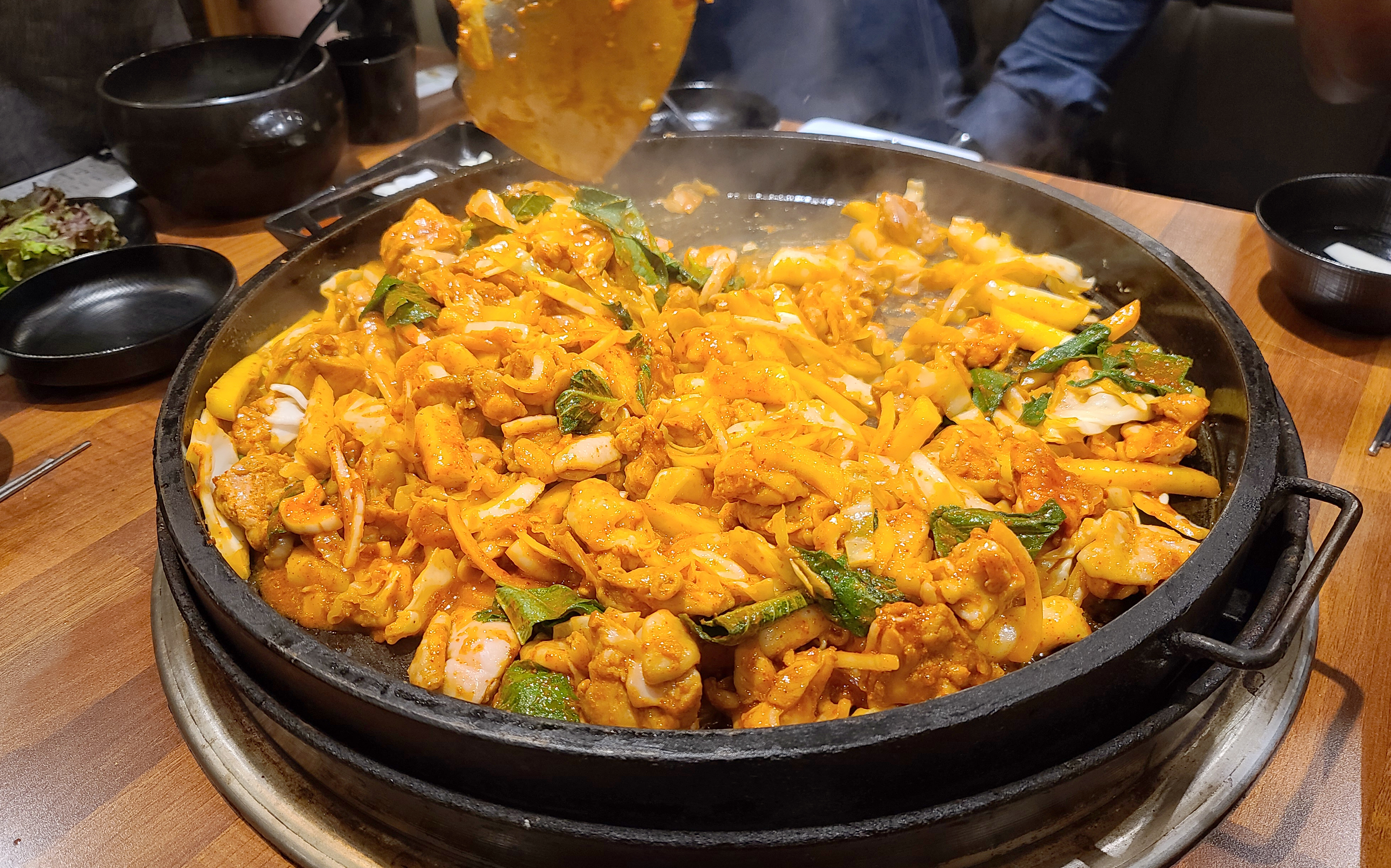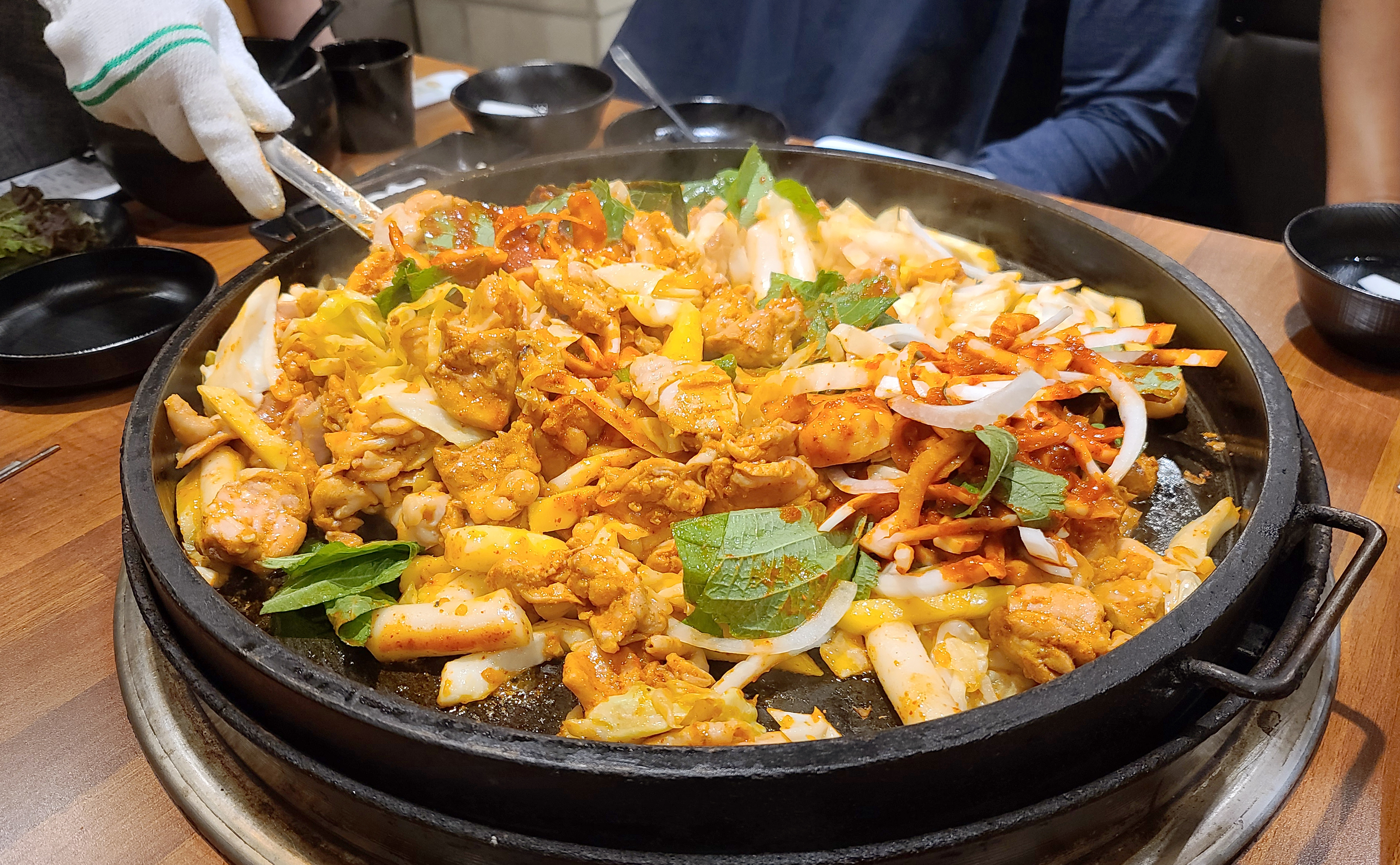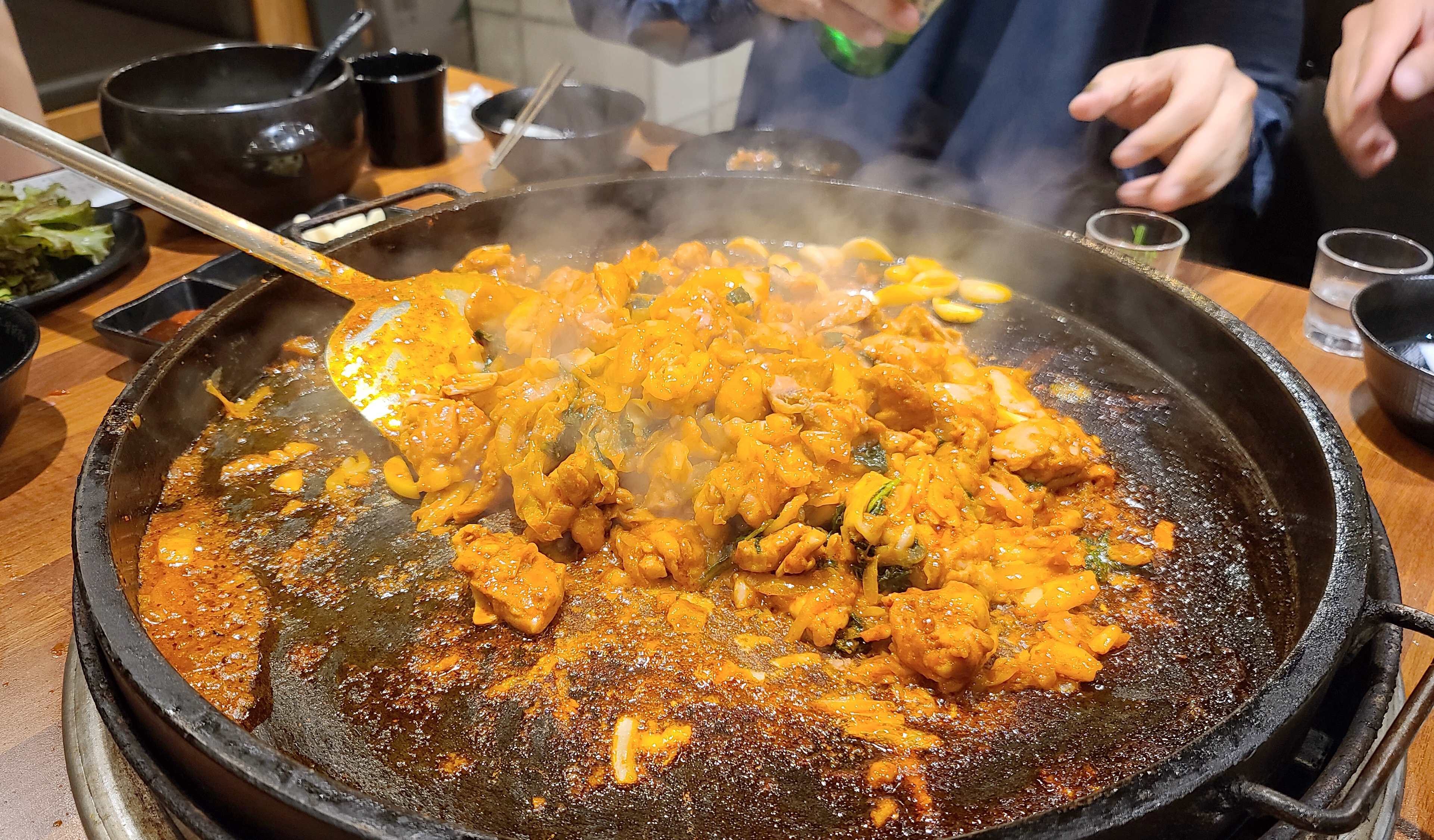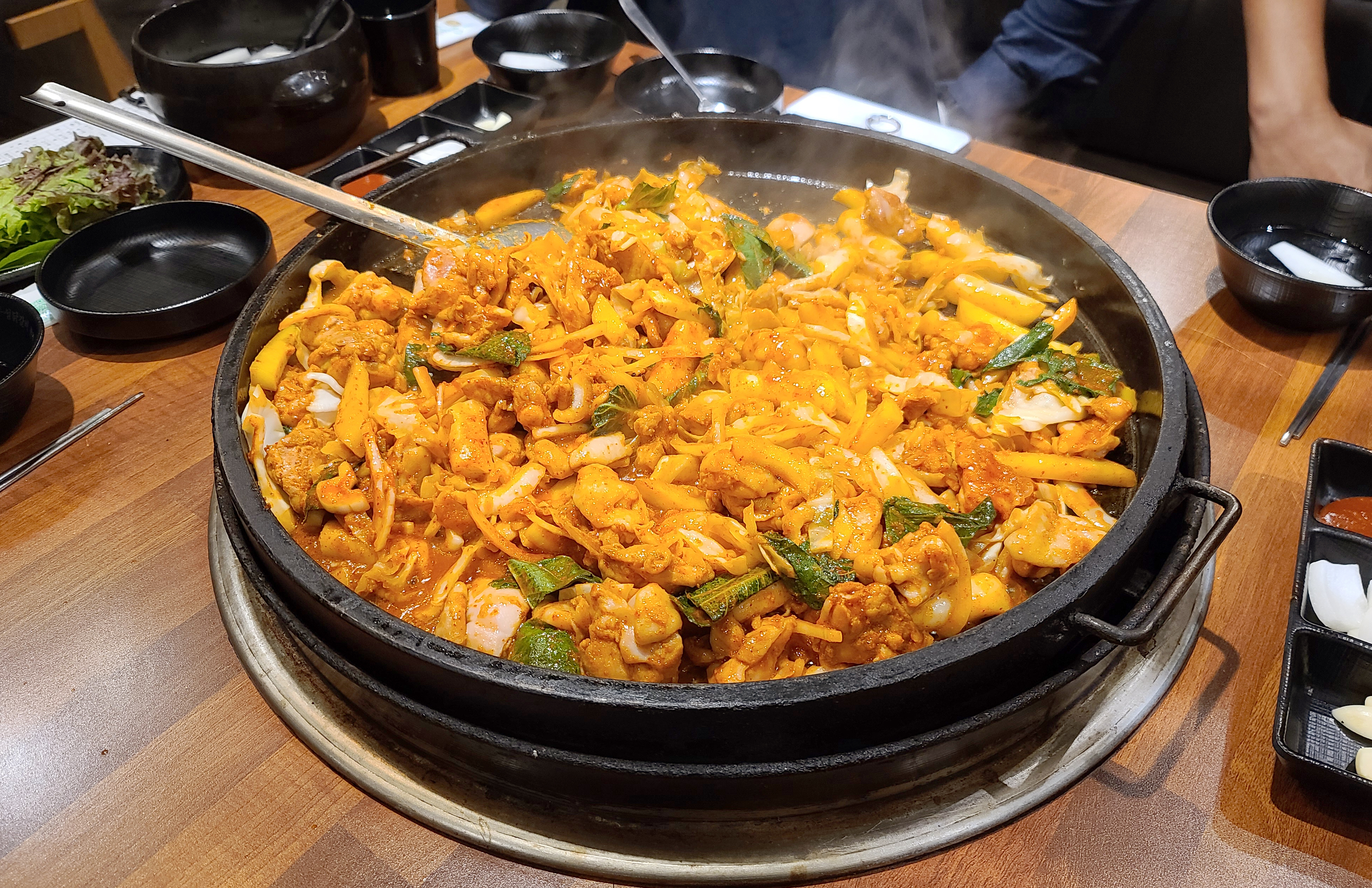 이 날 닭갈비를 넉넉하게 먹기 위해 추가로 주문했는데, 불판을 스크래퍼로 긁어낸 뒤 다시 시작된 닭갈비 조리과정. 두 번째 먹는데도 닭갈비는 역시나 맛있더라고요.
