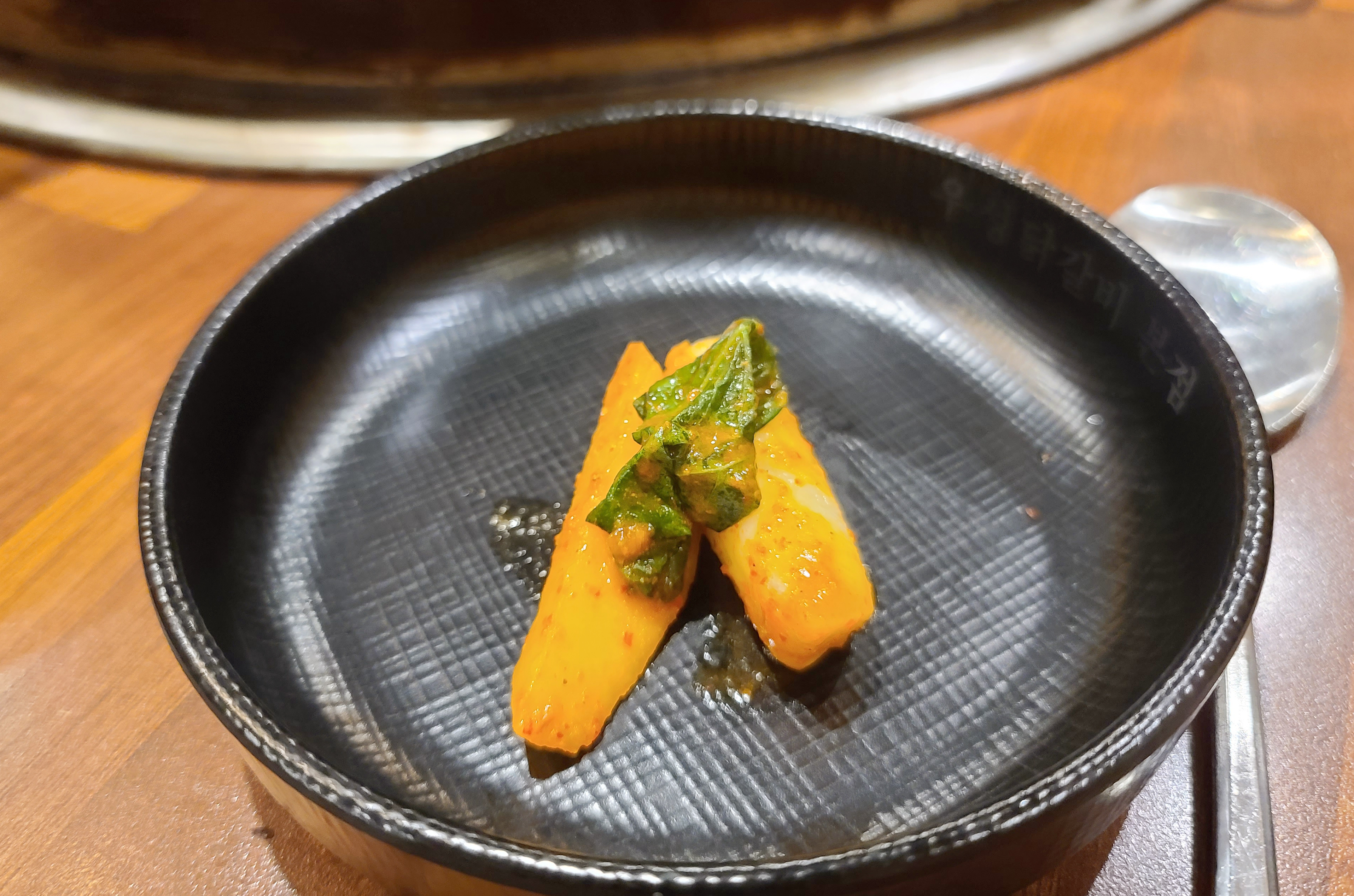 먼저 우성 닭갈비의 닭갈비는 양배추와 떡, 고구마 등을 닭과 함께 볶아주다가, 후에 양파와 깻잎 추가 양념 들을 넣어 볶아주는 형태였습니다. 닭갈비와 함께 동치미도 나오는데, 국물이 시원・깔끔하고 맛있더라고요.