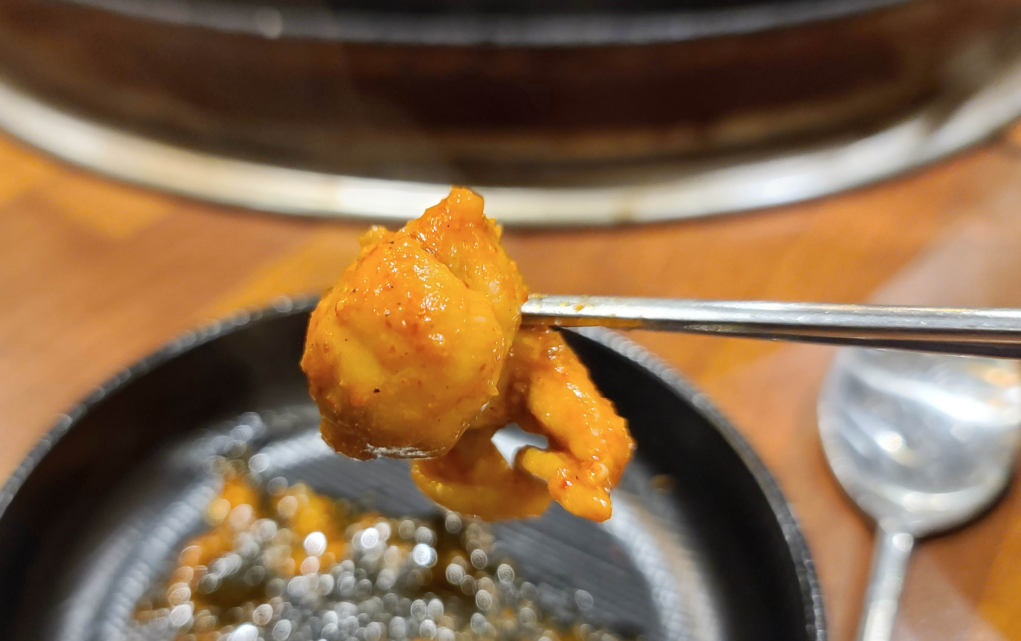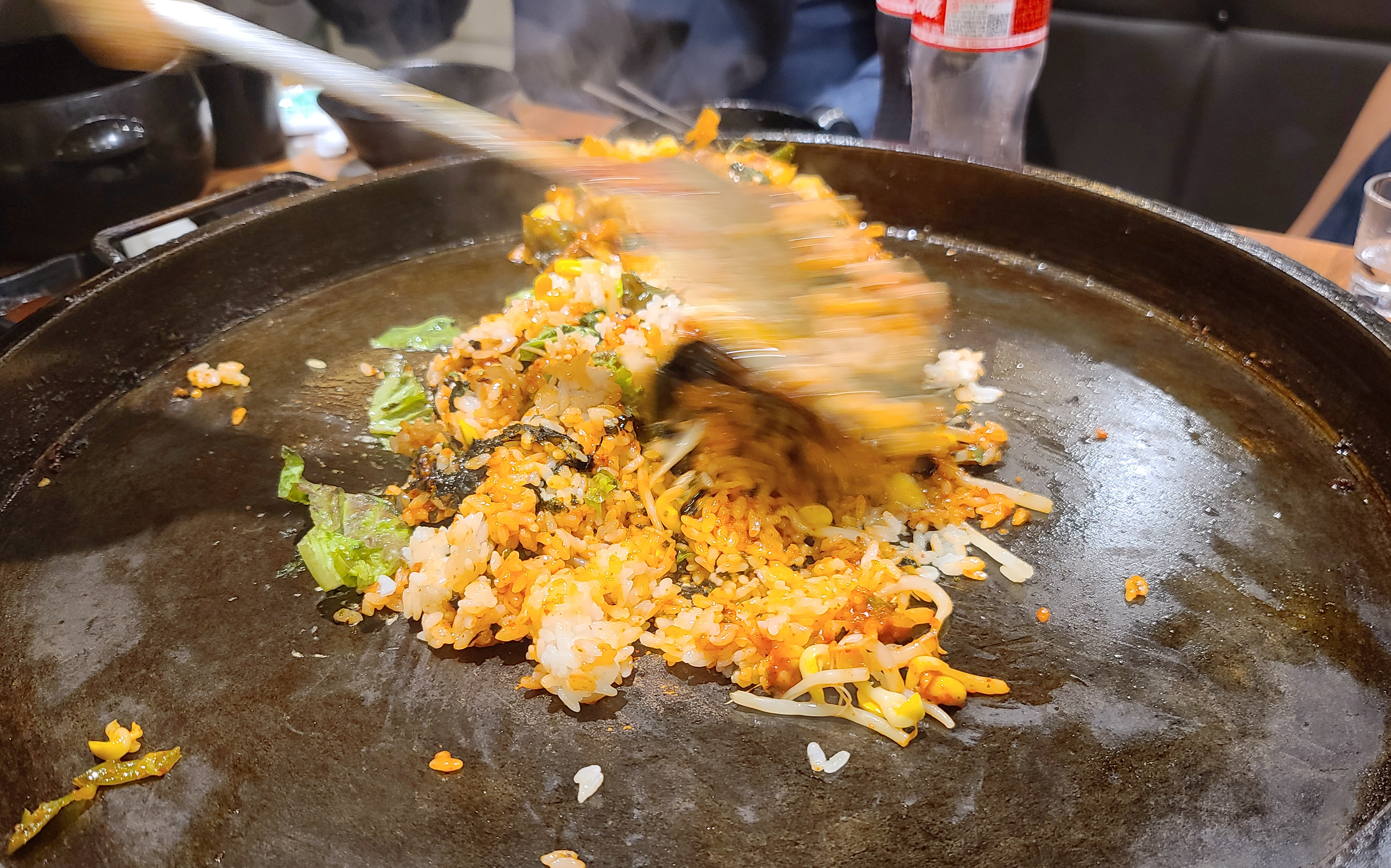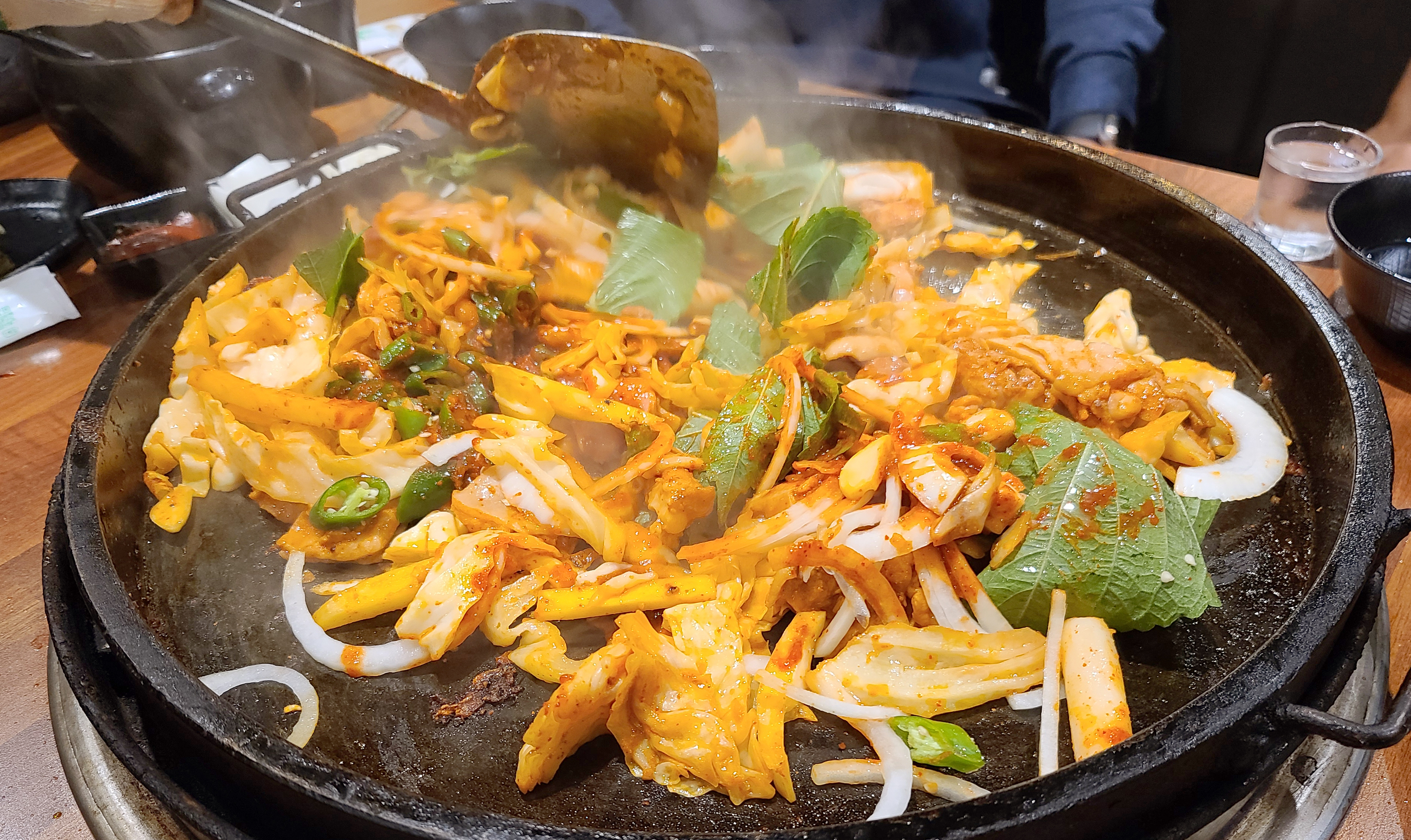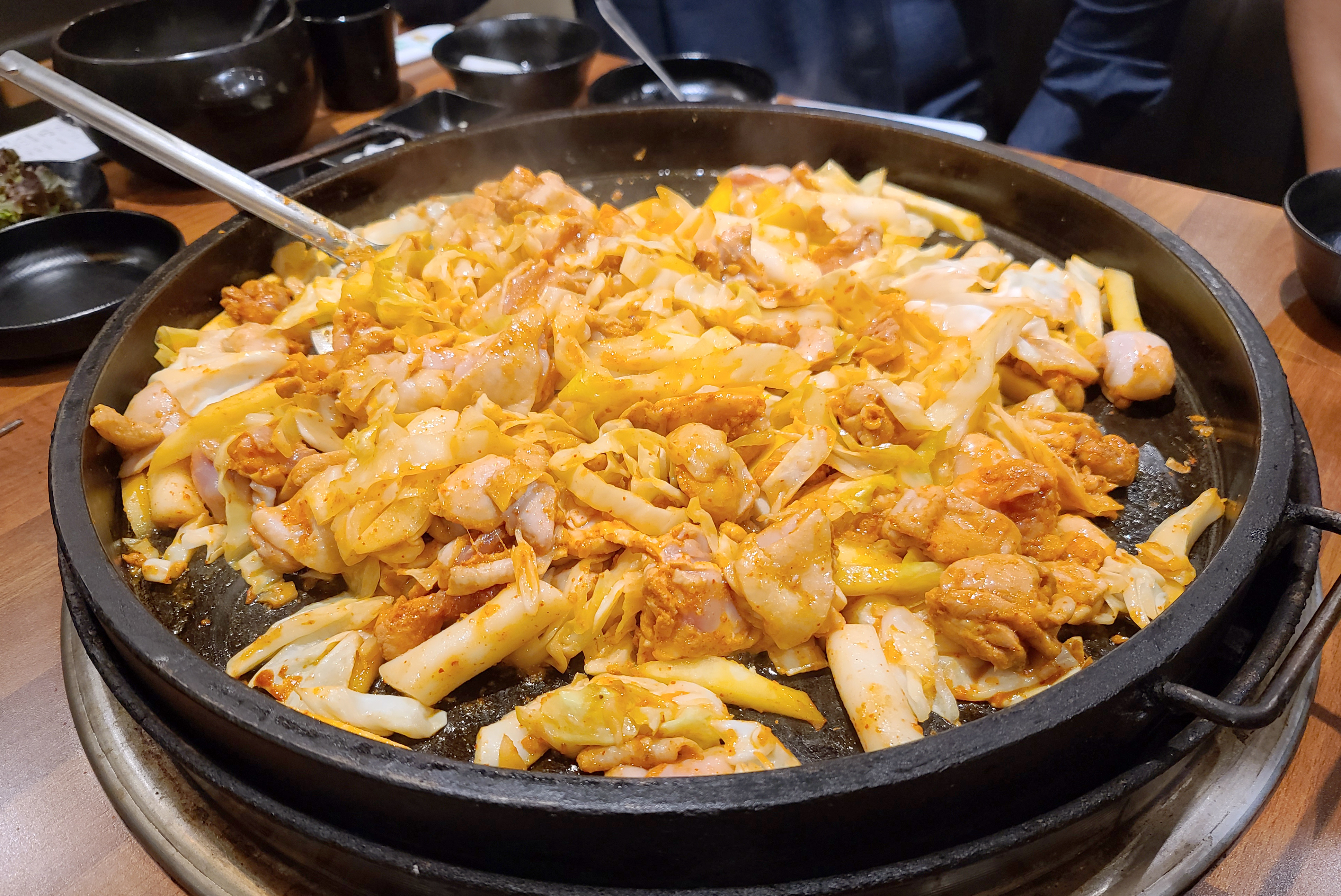 이 날 닭갈비를 넉넉하게 먹기 위해 추가로 주문했는데, 불판을 스크래퍼로 긁어낸 뒤 다시 시작된 닭갈비 조리과정. 두 번째 먹는데도 닭갈비는 역시나 맛있더라고요.