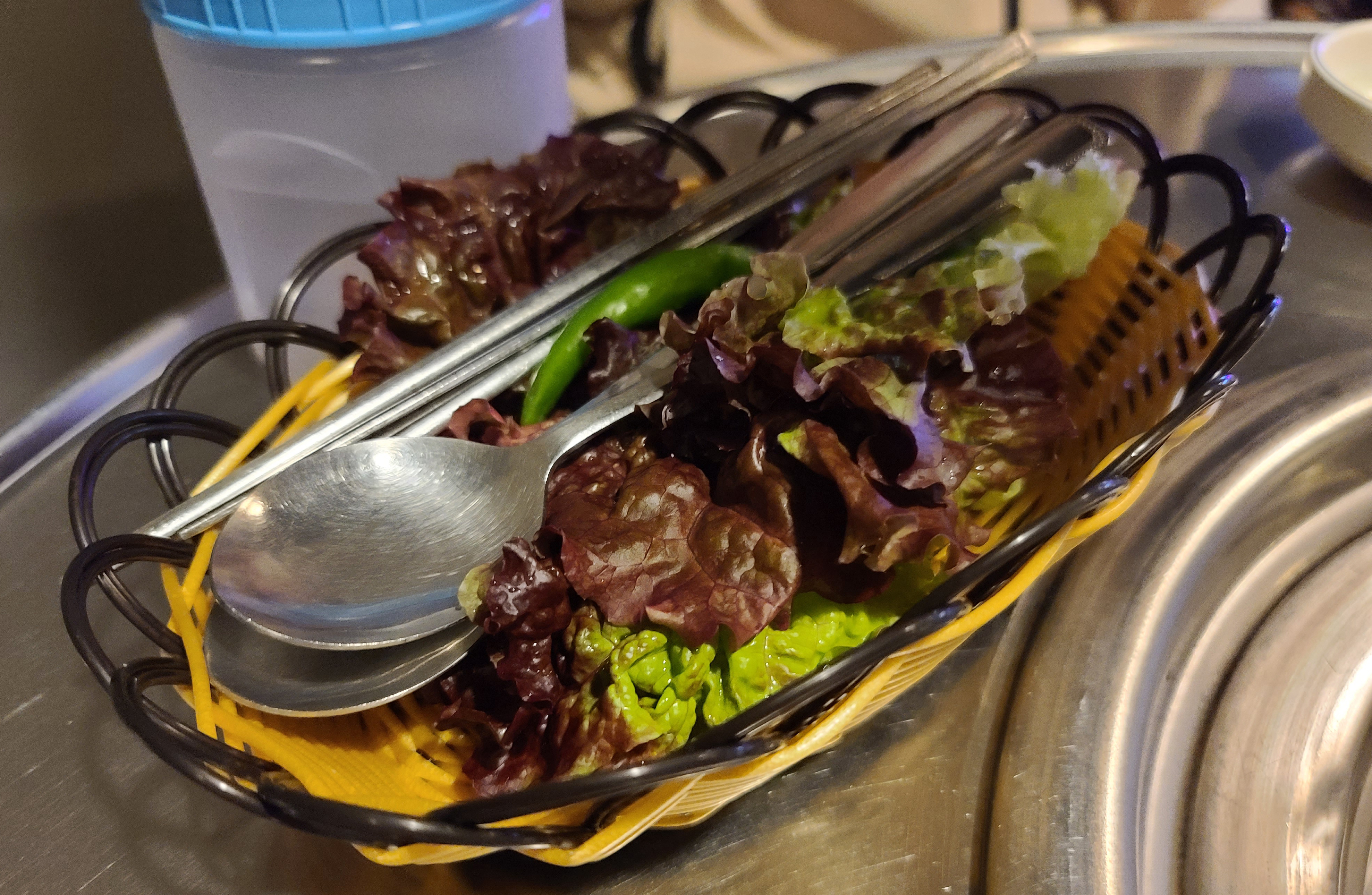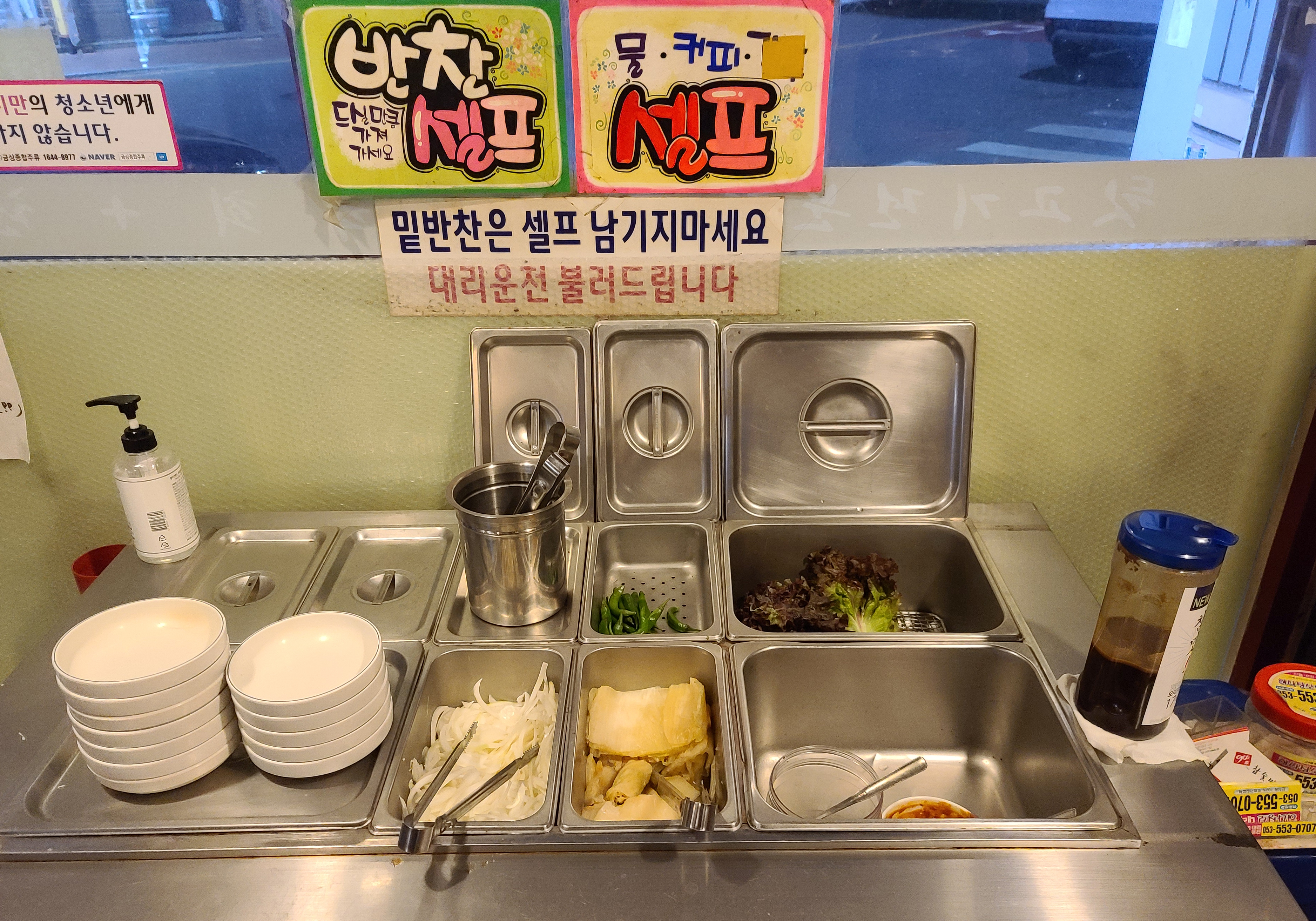 대구 친구의 급여 전날이라, 친구의 주머니 사정이 좋지 못한 관계로, 이 날 제가 메뉴를 샀습니다. 먼저 뒷고기와 함께 쌈채소, 양파, 백김치 등이 제공되었습니다. 첫 번째 반찬은 직접 가져다주시는데, 이후로는 셀프바에서 직접 가져다 먹을 수 있게 되어있었습니다.