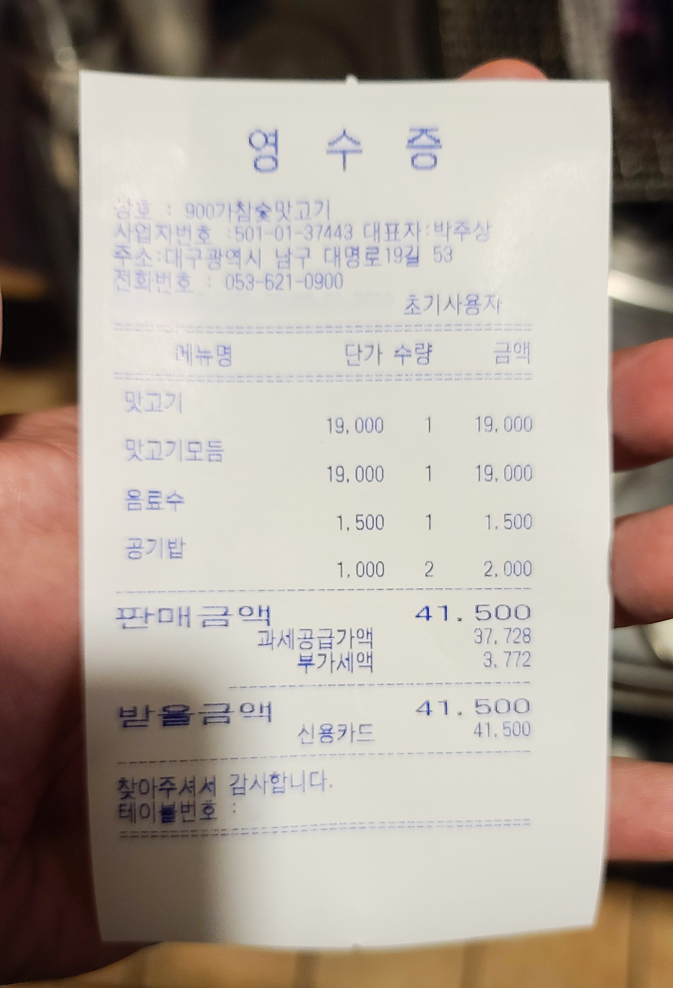 이 날 둘이서 충분히 식사하고도 총금액은 41,500원으로 가격도 부담스럽지 않았고, 특히 900가참숯맛고기의 뒷고기가 맛있어서 나중에 또 생각날 것 같더라고요. 차량 이용을 안 했으면 술도 주문했을 텐데, 이 날 운전을 해야 해서 술 대신 음료로(ㅋㅋ)