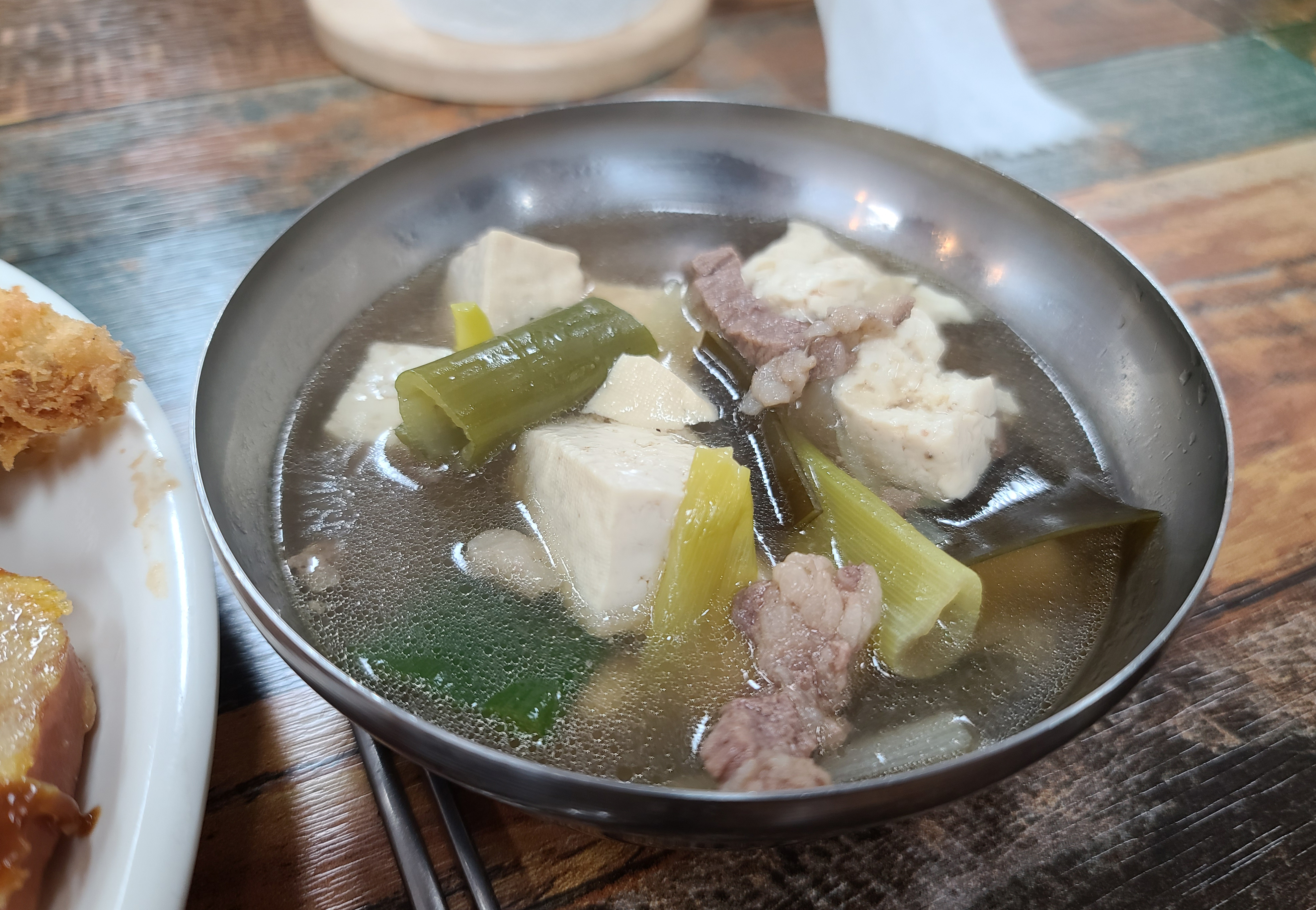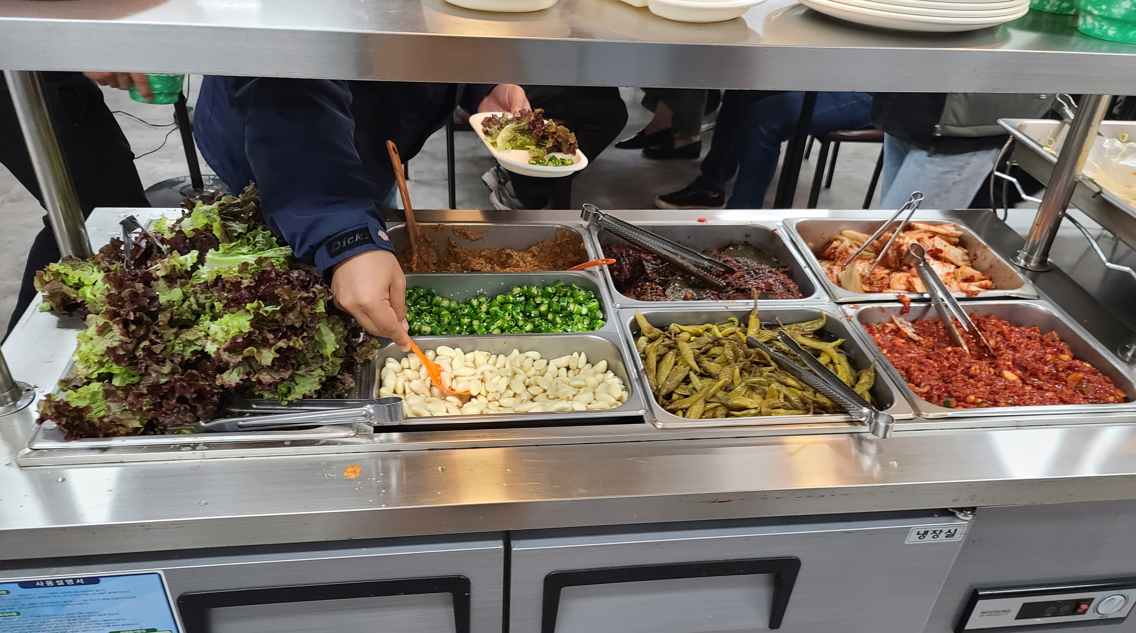 손님이 워낙 많은 관계로 메뉴의 사진을 자세하게 담지는 못했는데, 밥이랑 생선구이, 제육볶음을 비롯해 샐러드, 김치, 젓갈류, 햄, 마른반찬, 튀김류 등 다양한 메뉴들이 있었습니다. 기호에 따라 국과 기타 메뉴를 가져다 먹을 수도 있었는데, 종류도 다양하고 맛도 꽤 괜찮더라고요.
