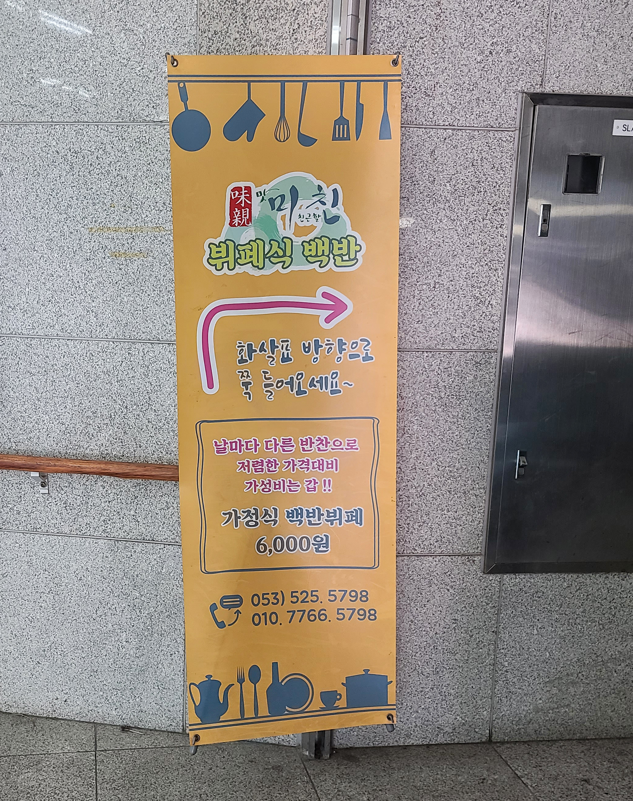 이 곳은 대구에 가성비 좋은 식당을 찾다가 우연히 발견한 곳으로, 6,000원이라는 가격에 맛깔난 다양한 메뉴를 즐길 수 있다는 점에서 입소문이 자자한 곳이었죠. 심지어 D사, N사 포털의 리뷰도 좋은 편이어서 기대감이 더 큰 가게였습니다. 건물 내 주차장은 이미 방문한 손님들의 차량으로 주차가 거의 불가능 상태였고, 인근에 위치한 주차장을 찾아 주차를 하신 뒤 방문하시는 것을 추천드립니다.