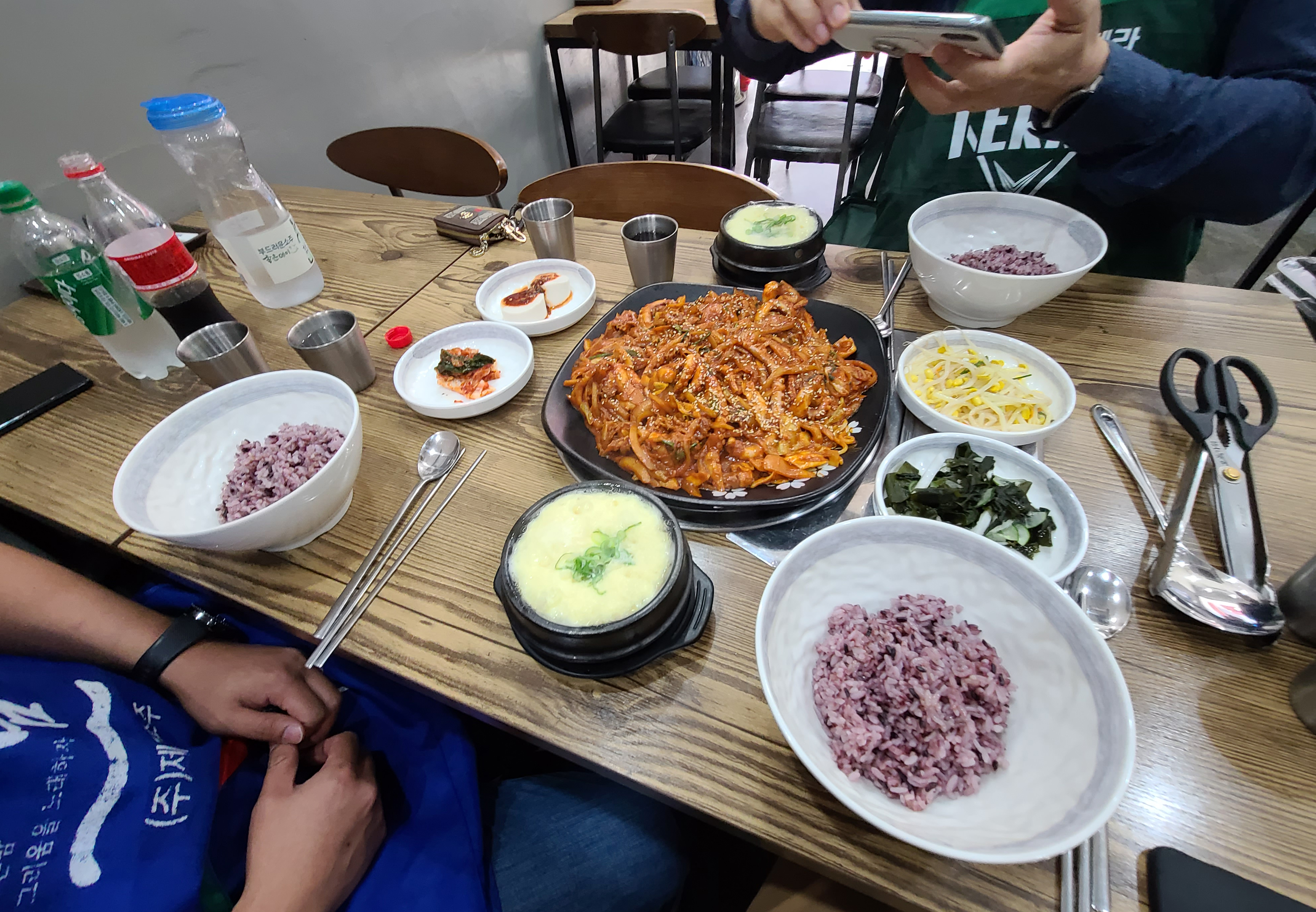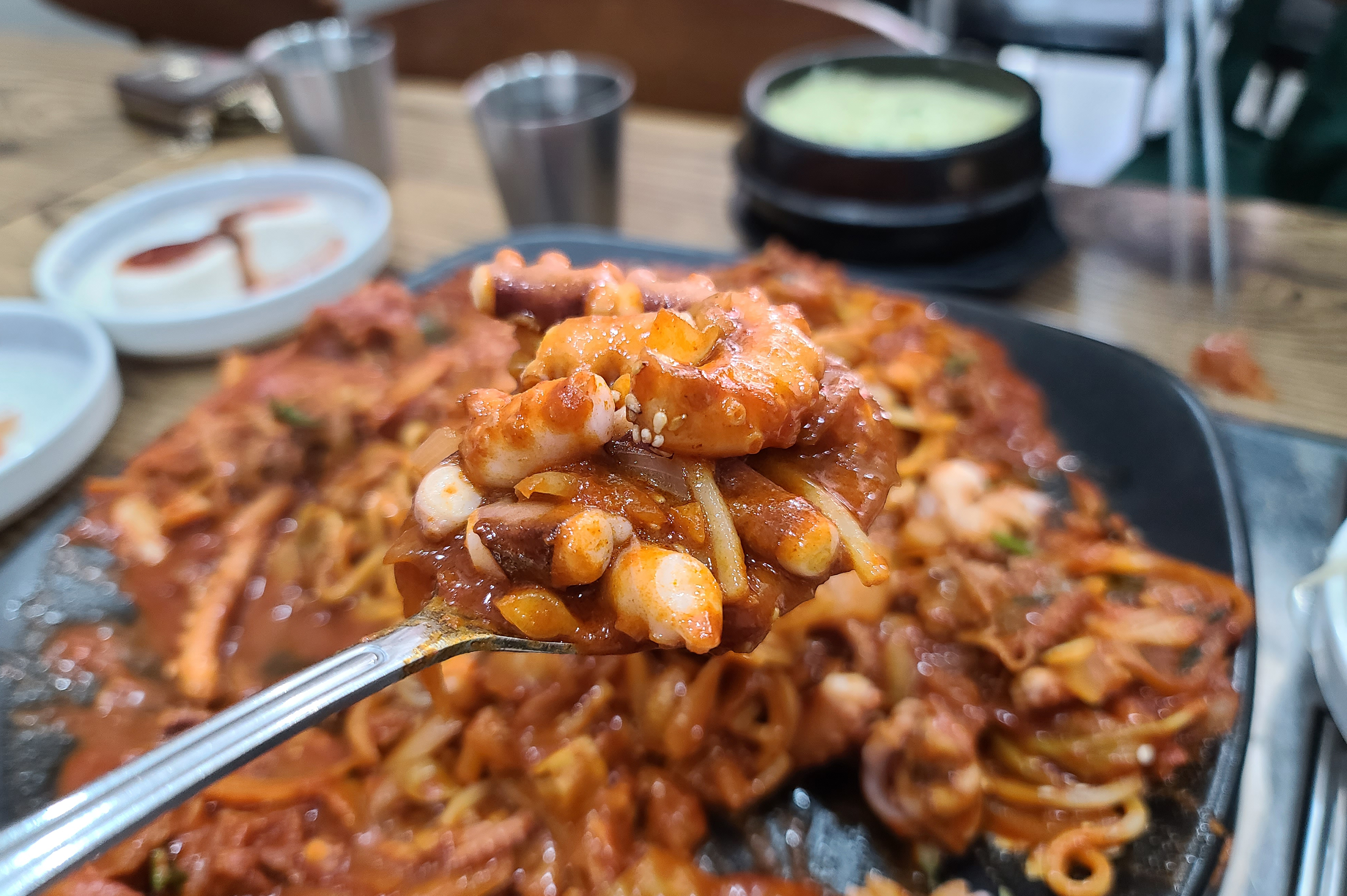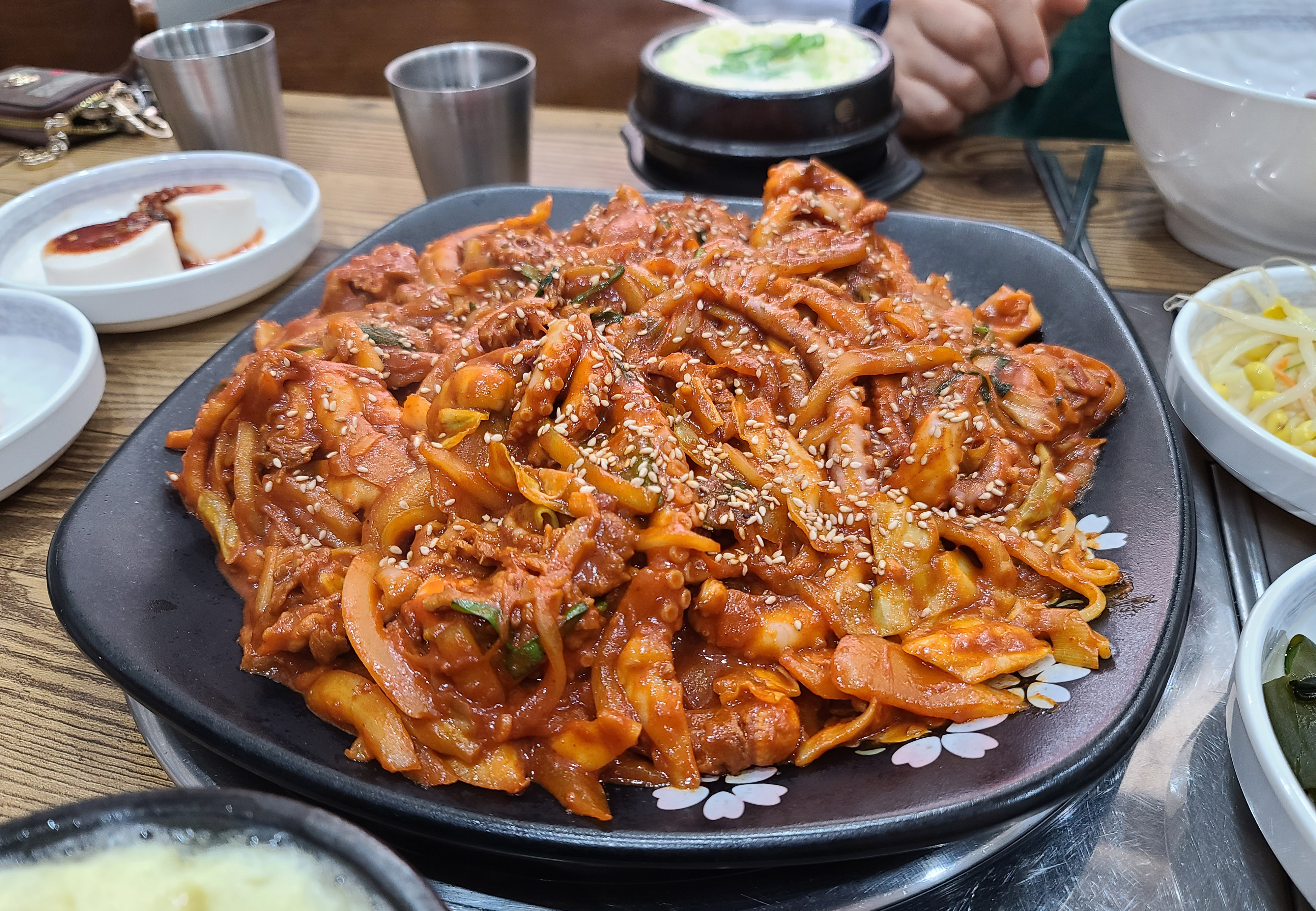 낙지볶음 매운맛을 주문했더니, 생각보다 많이 맵더라고요. 나중에는 입안이 얼얼해져서 밥 위에 순두부를 넣고 으깨서 매운맛을 조금 중화시켜서 먹었죠. 그래도 역시 재방문할 가치가 있었던 게, 같이 간 지인들도 낙지볶음을 매워하면서도 맛있게 먹었기 때문입니다.