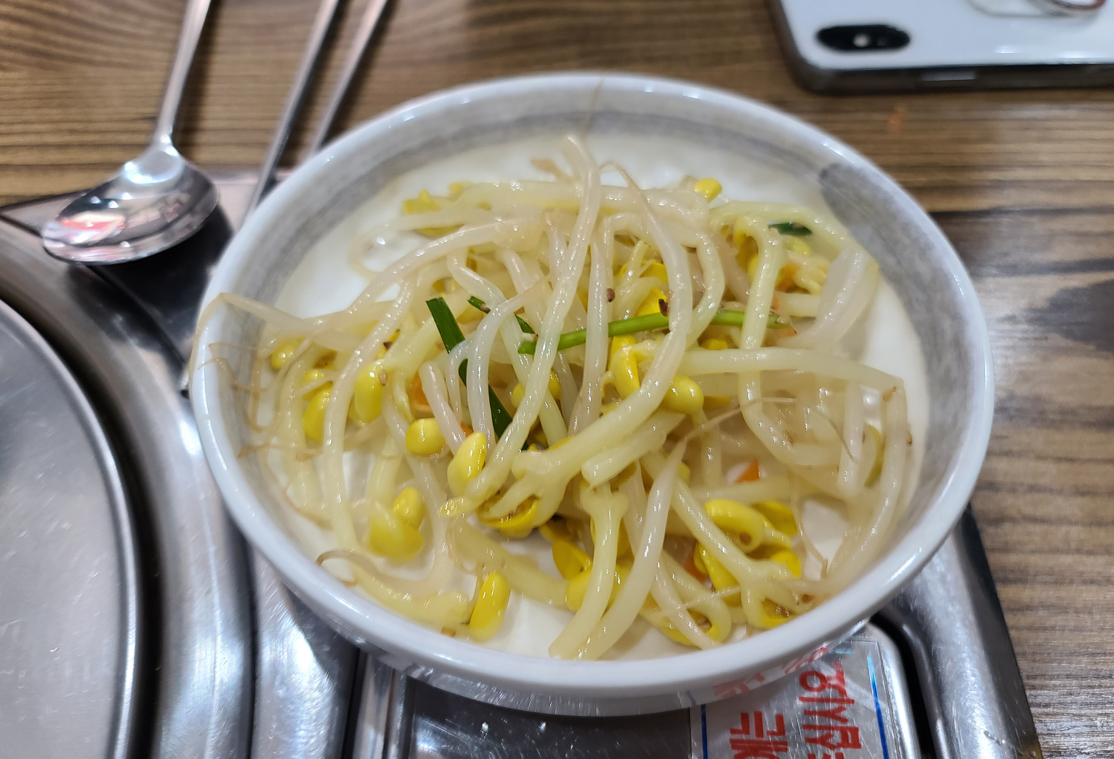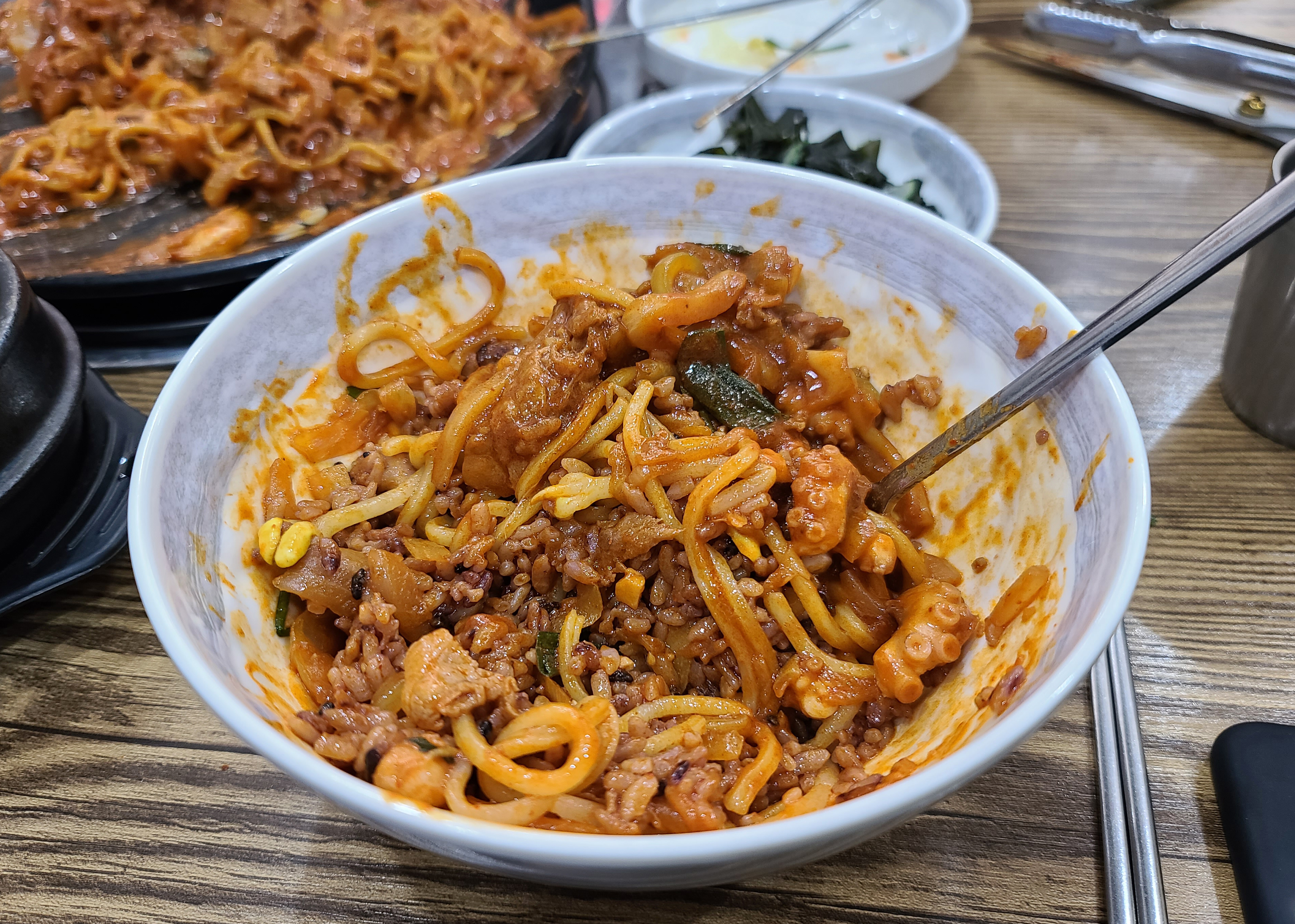 꽃낙지의 낙지볶음에는 중화면도 들어있어 더욱 배불리 먹을 수 있었습니다. 우선 밥 위에 콩나물을 얹고 불맛 나는 매콤한 낙지볶음을 얹어서 비벼주었습니다.