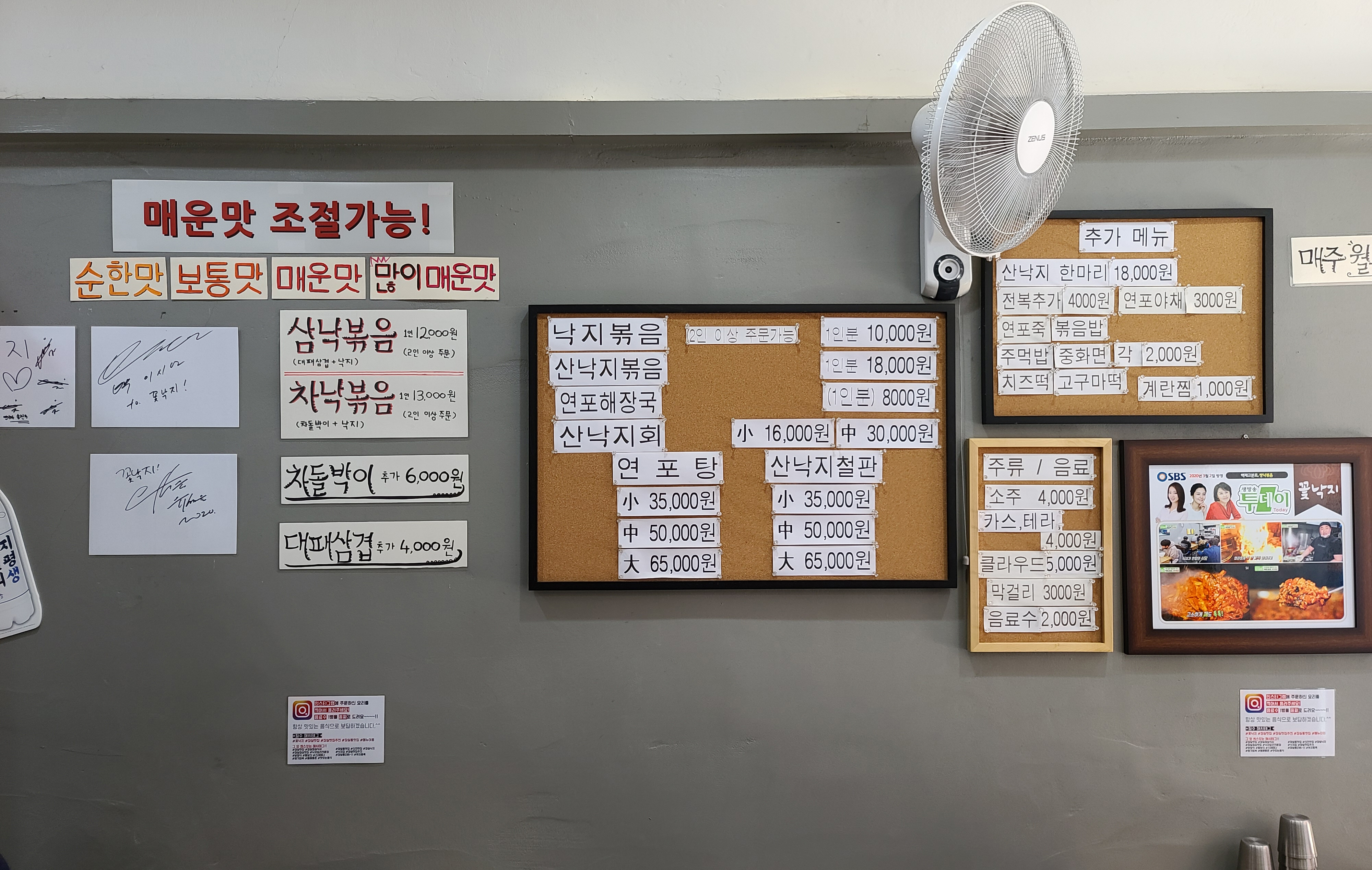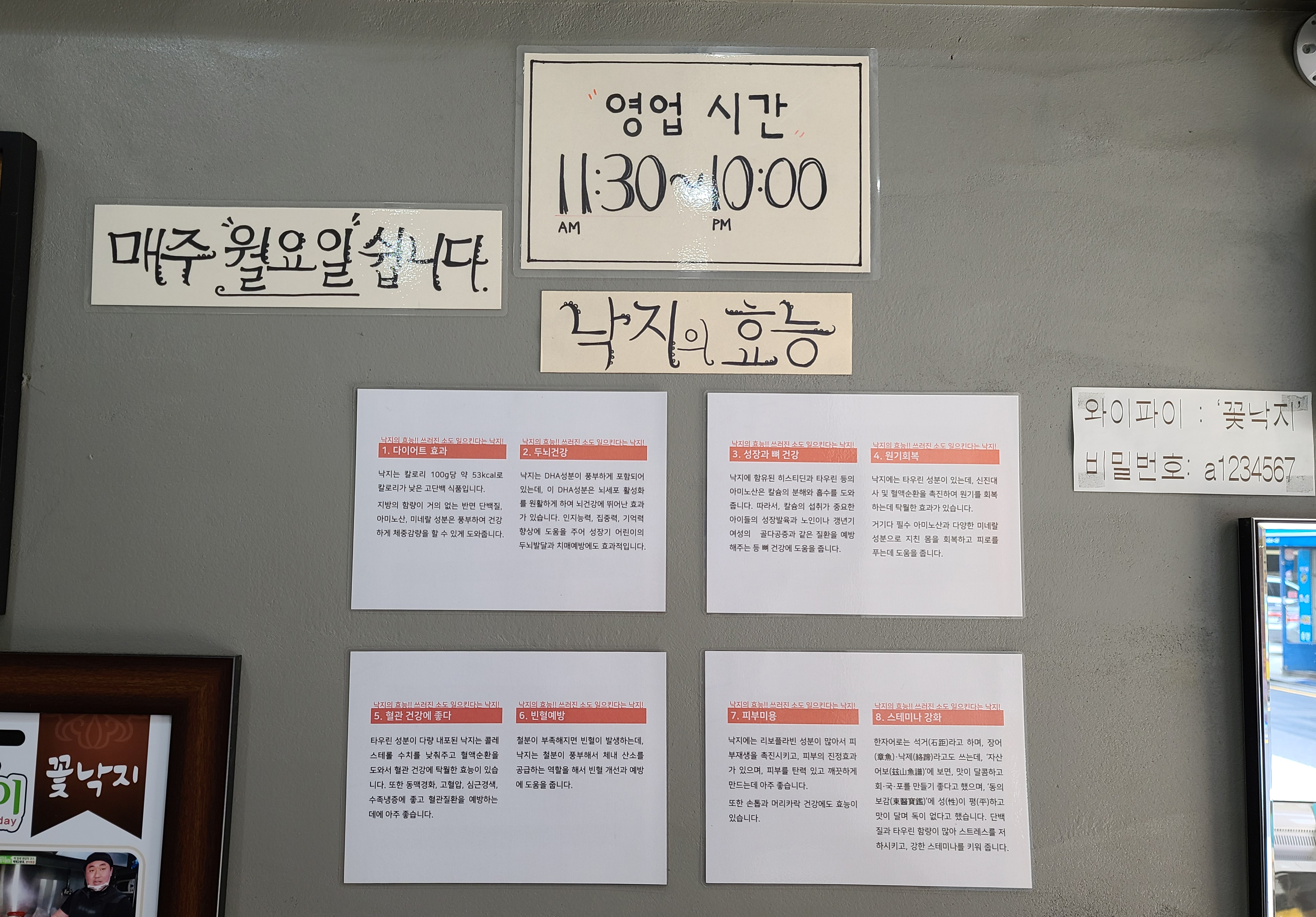 잠실 꽃낙지는 8월에도 방문한 적이 있는 가게인데, 이번에는 저의 친한 지인들과 셋이서 가게에 방문했습니다. 가게의 메뉴는 삼낙볶음, 차낙볶음, 대패삼겹, 낙지볶음, 산낙지볶음, 연포해장국, 산낙지회, 연포탕, 산낙지철판, 연포죽, 볶음밥 등 이 있었습니다. 가게의 영업시간은 11:30~ 22:00 까지이며, 매주 월요일은 휴무고 합니다.
