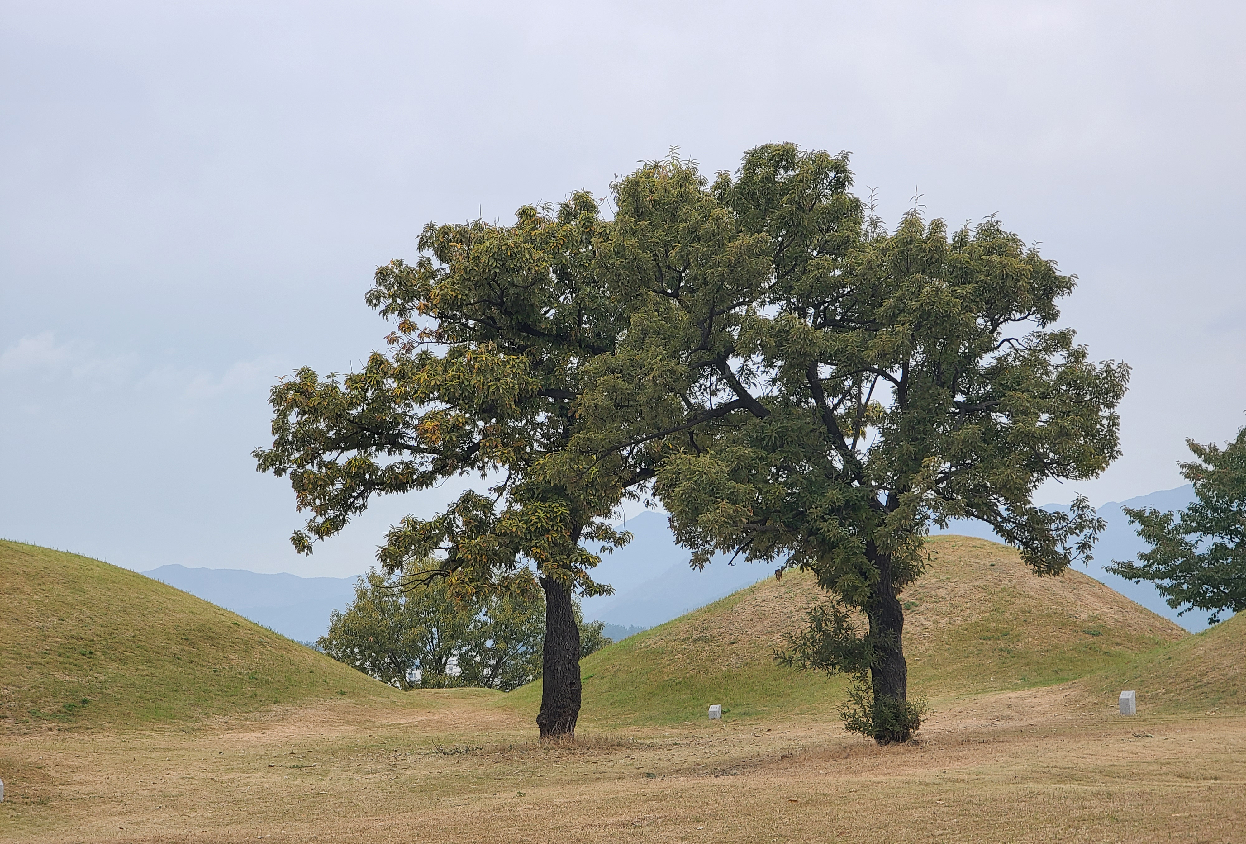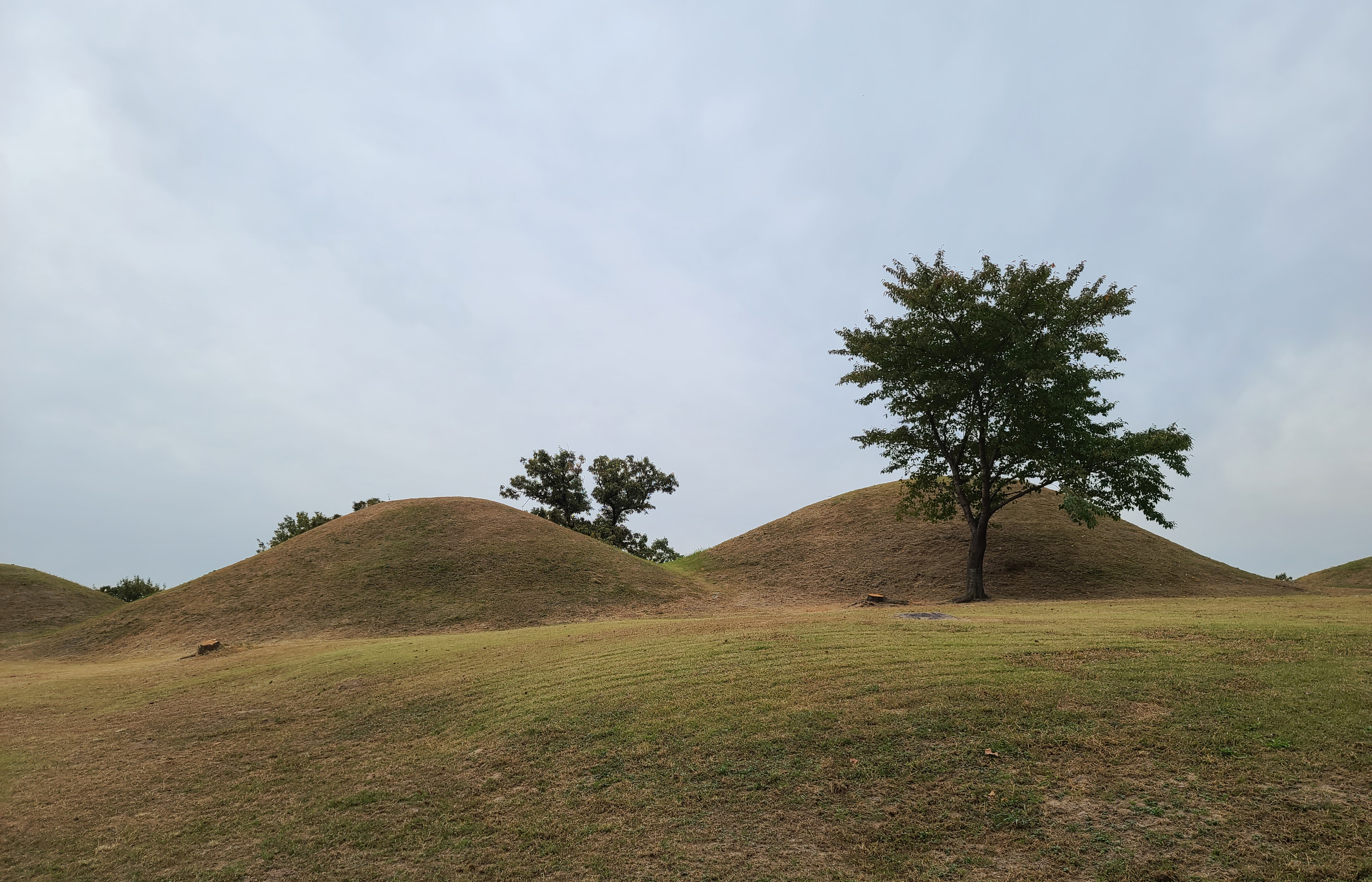 다른 곳으로도 발길을 옮겨보았는데, 불로동 고분군의 대표적으로 소개되는 나무와 고분의 모습이 보이더라고요. "와보길 잘했다" 싶을 정도로 멋진 모습의 고분은 사진을 안 찍을 수가 없겠더라고요.