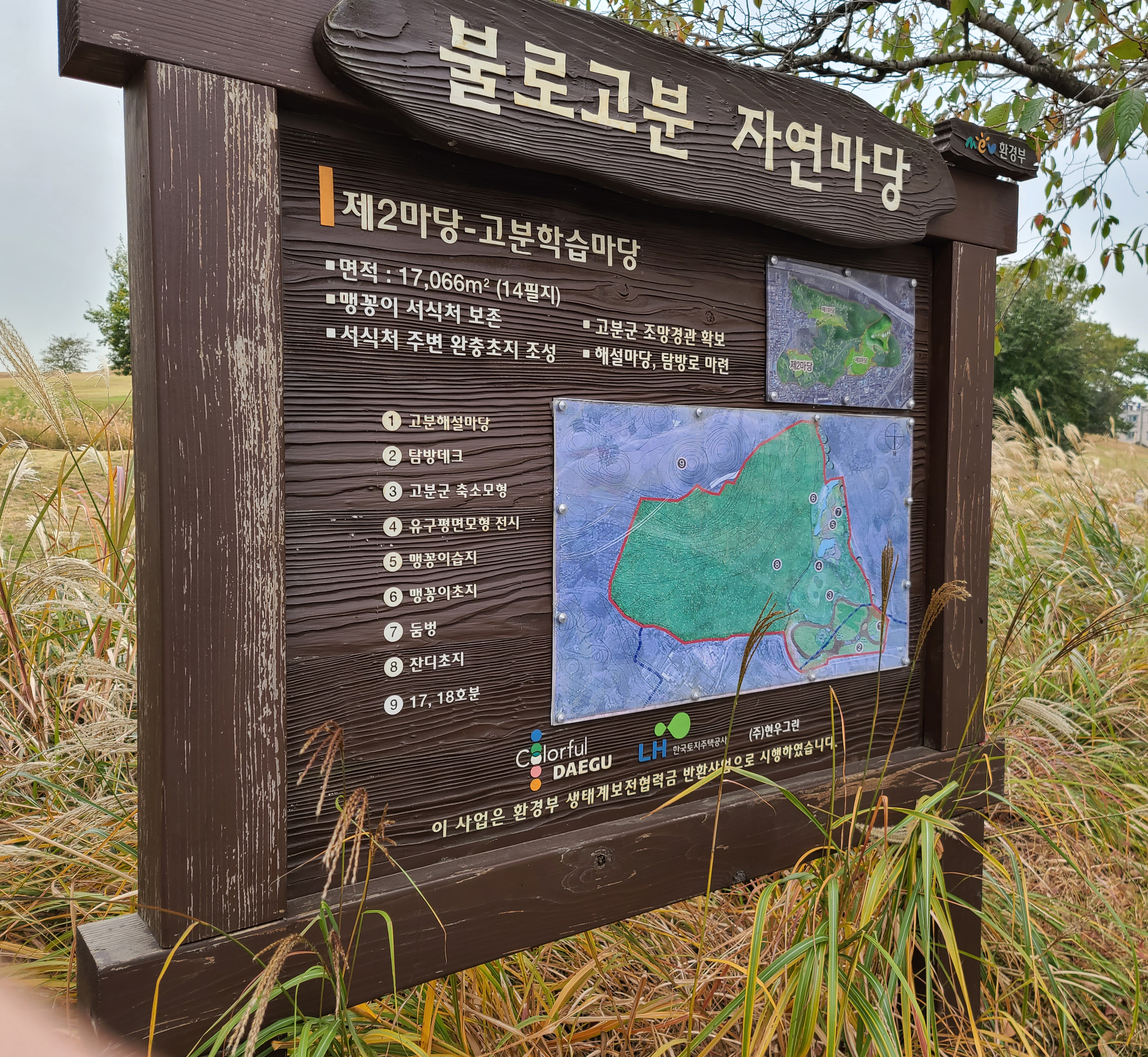 대구 불로동 고분군은 고분해설마당, 탐방데크, 고분군축소모형, 유구평면모형전시, 맹꽁이습지, 둠벙, 잔디초지, 17, 18호분으로 꽤 큰 규모의 고분이었습니다. 불로동 고분군에 대한 소개는 위에 안내문에 나와있습니다.