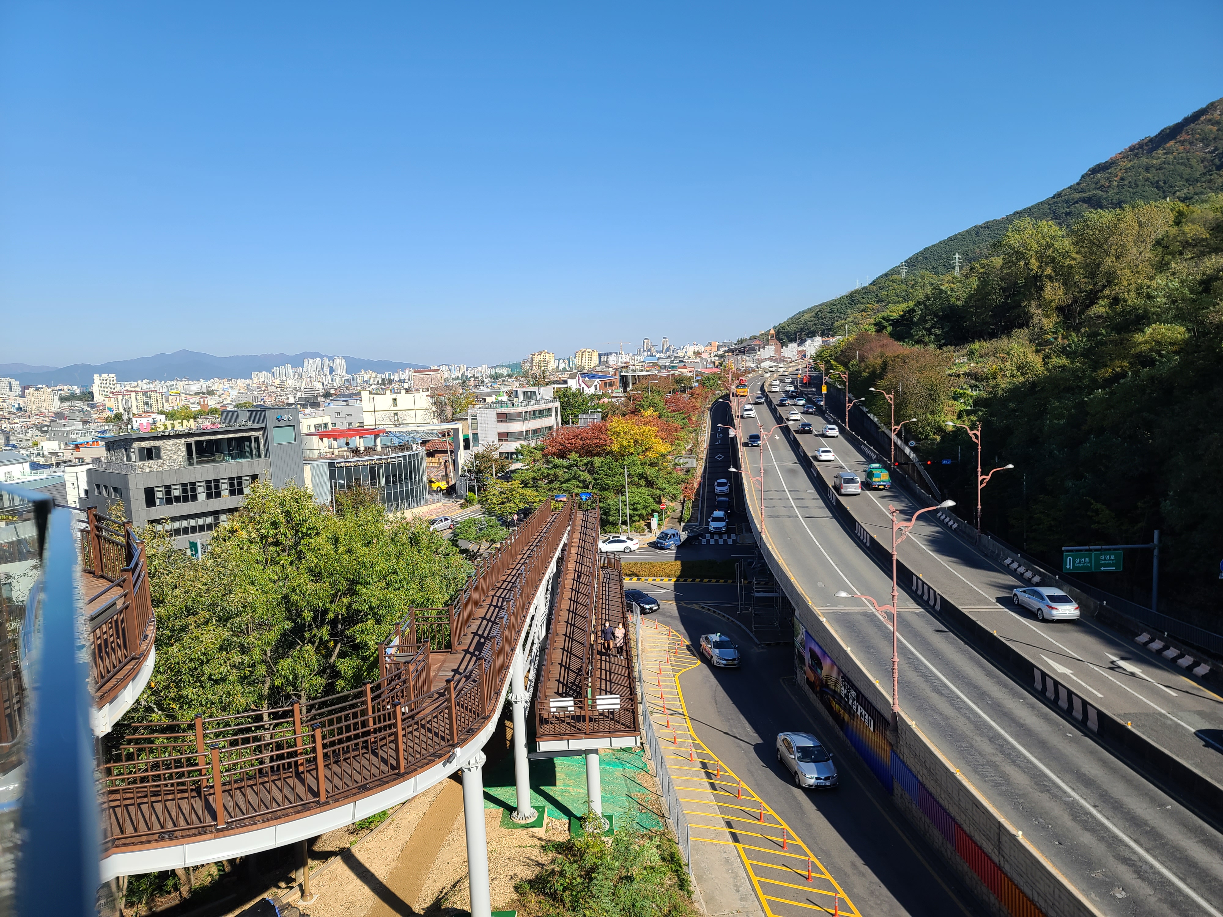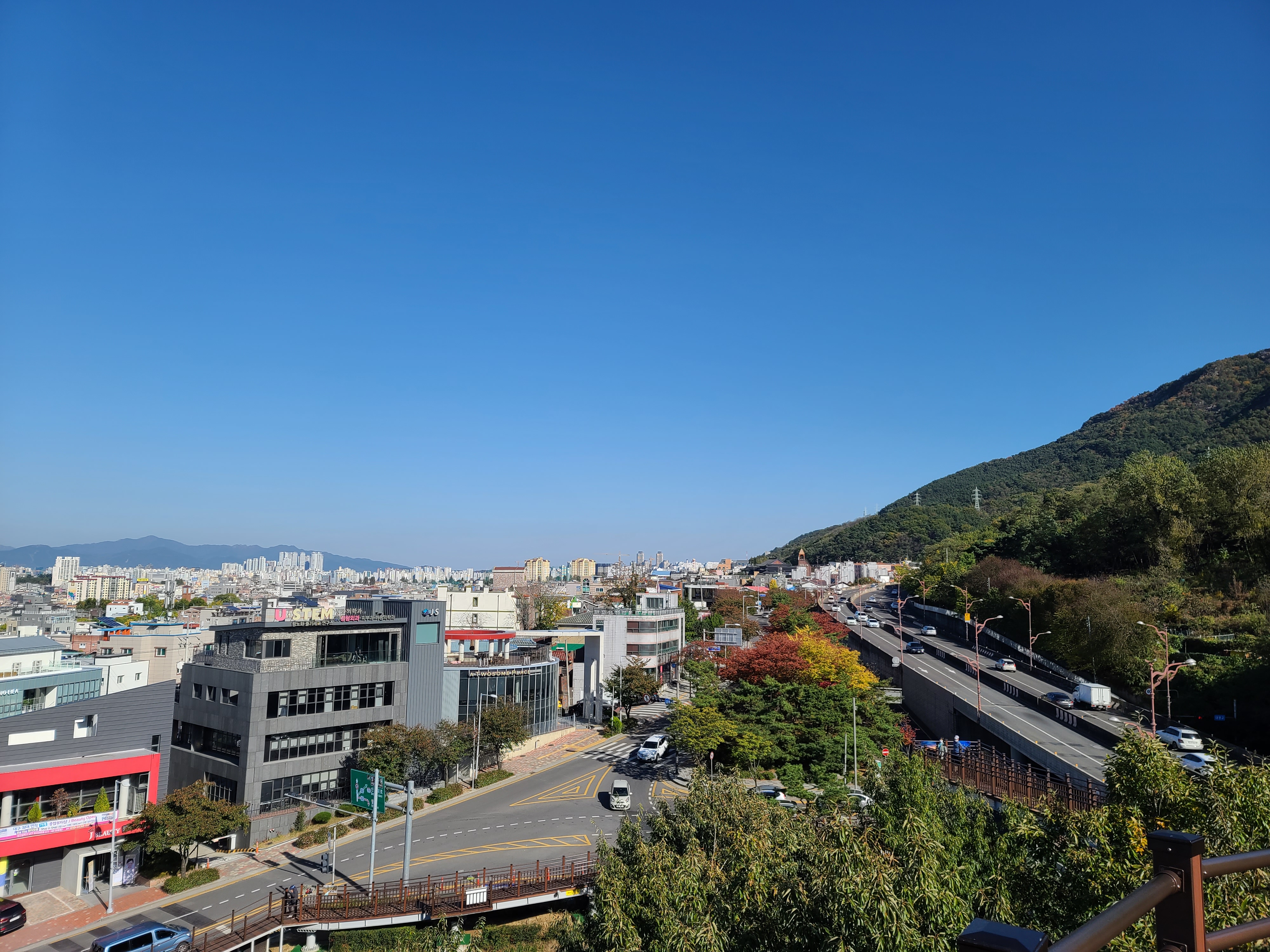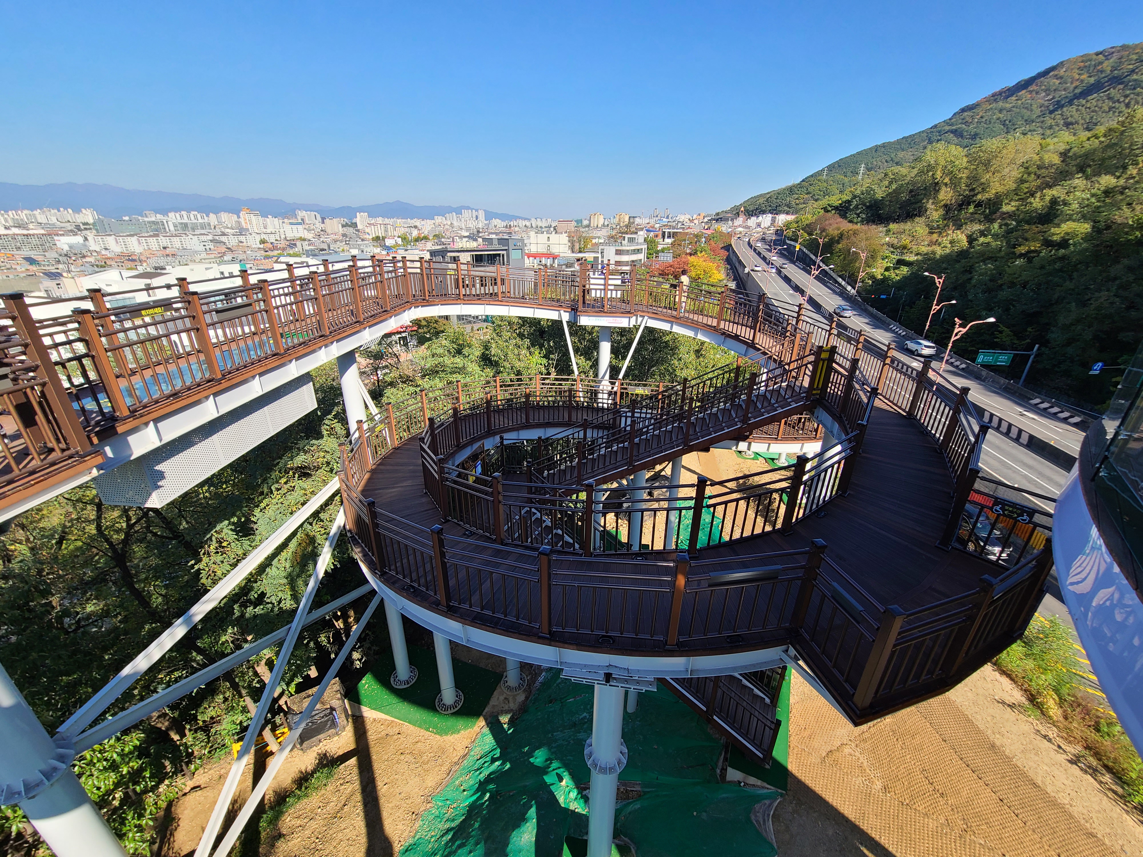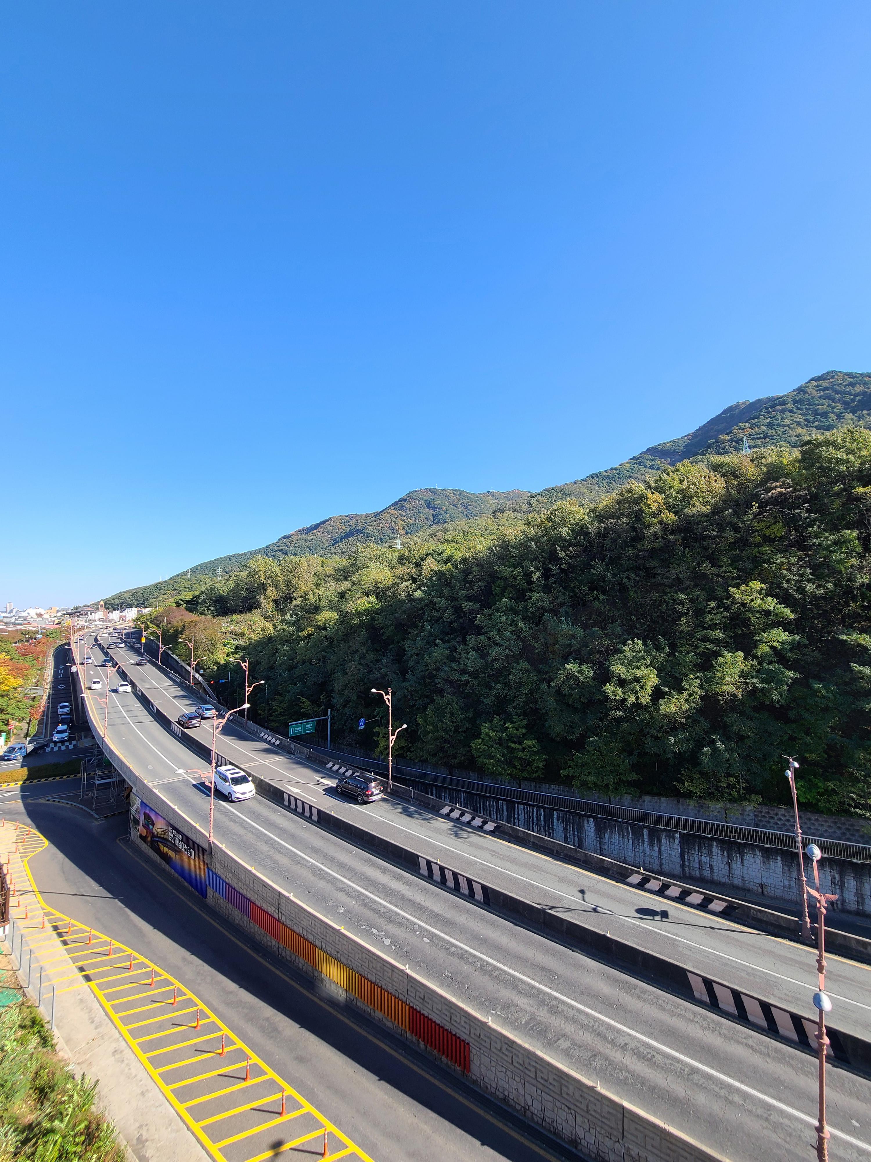 가을이라 맑은 하늘 아래 빨래터공원에서 전망을 보니 대구 시내가 잘 보이고, 멀리 두류공원 83타워도 보이더라고요. 앞산순환로를 끼고 있는 앞산 빨래터공원 해넘이전망대는 앞산순환로 도로의 모습도 사진으로 쉽게 담을 수 있었습니다.