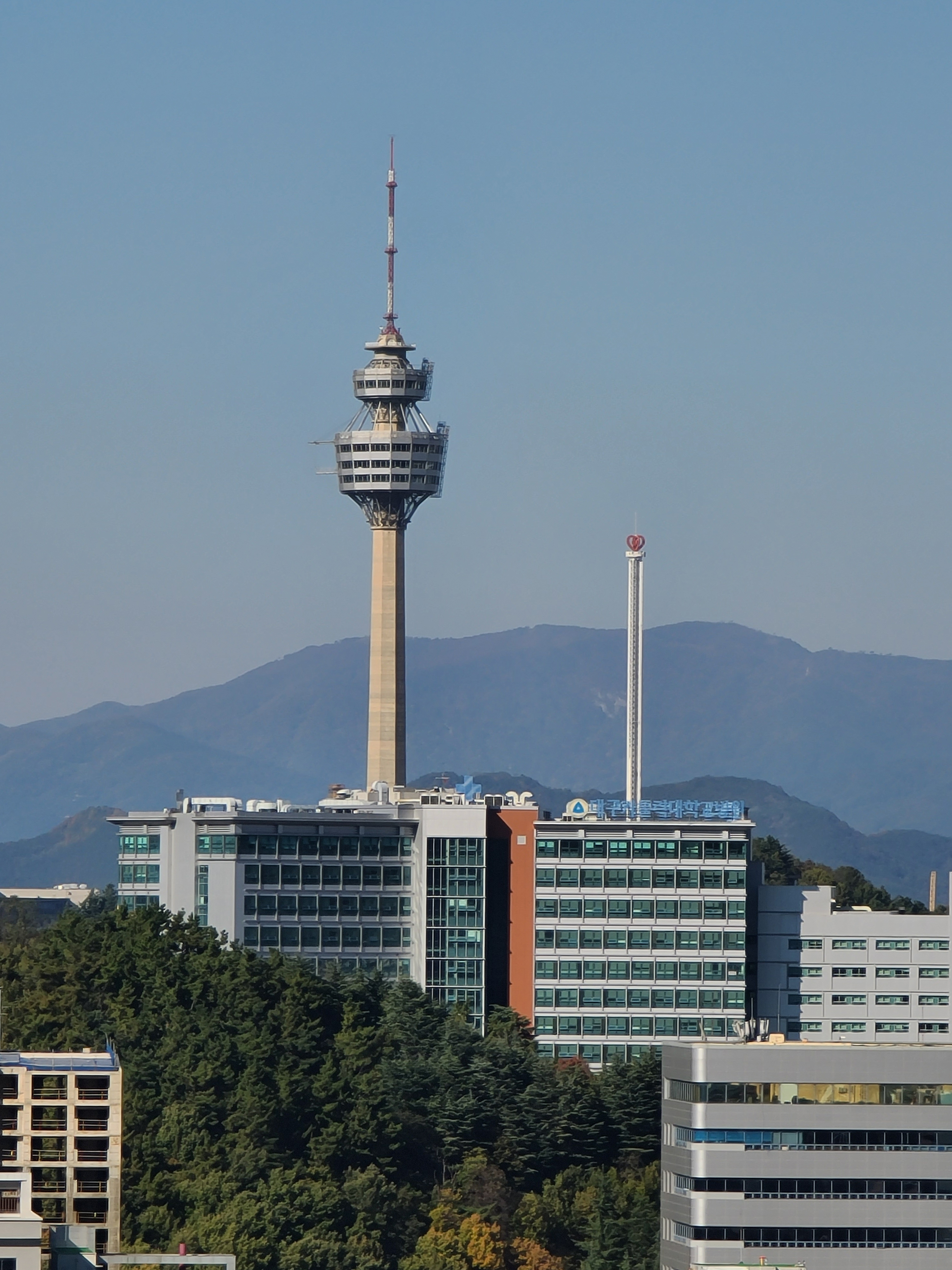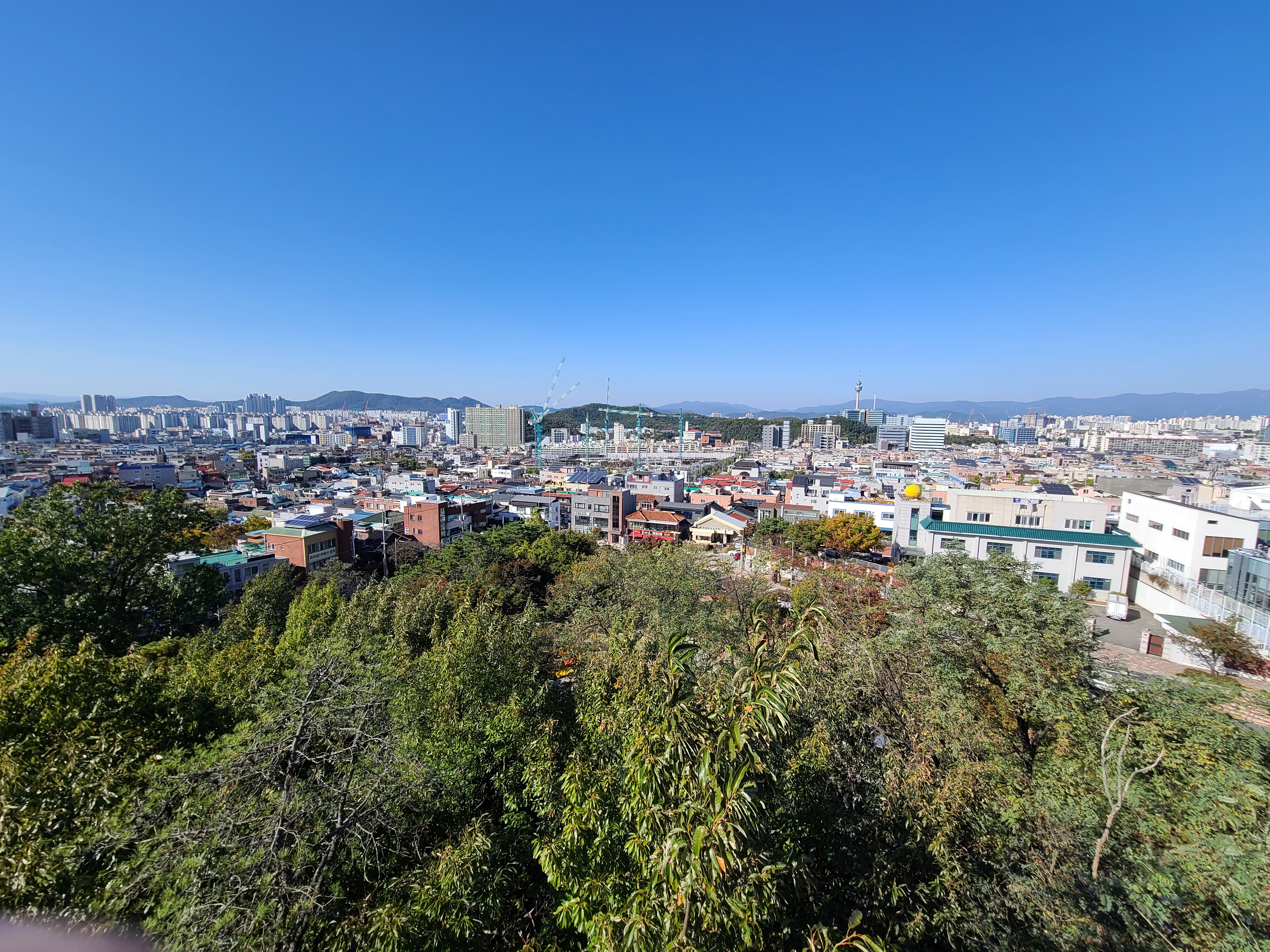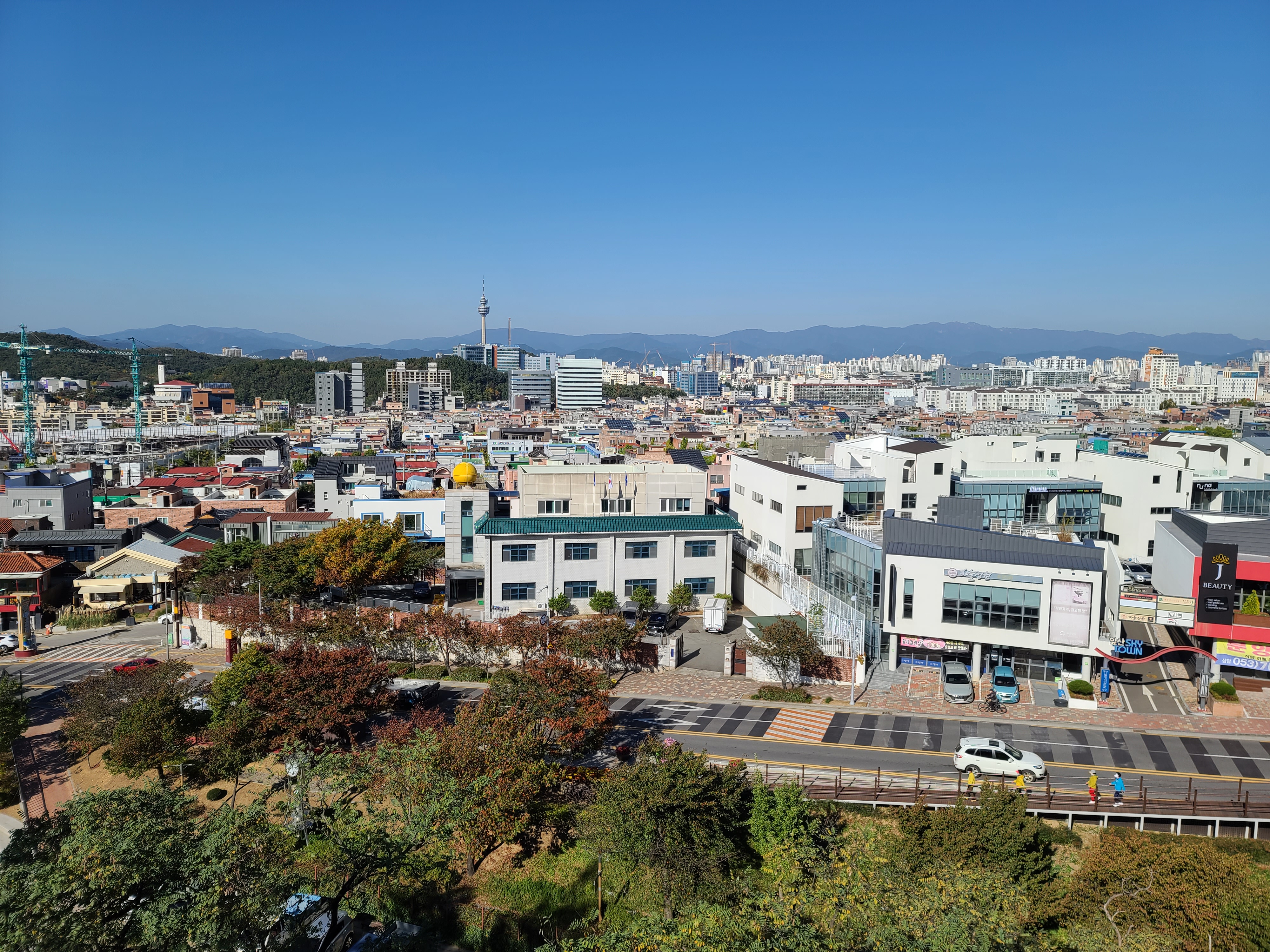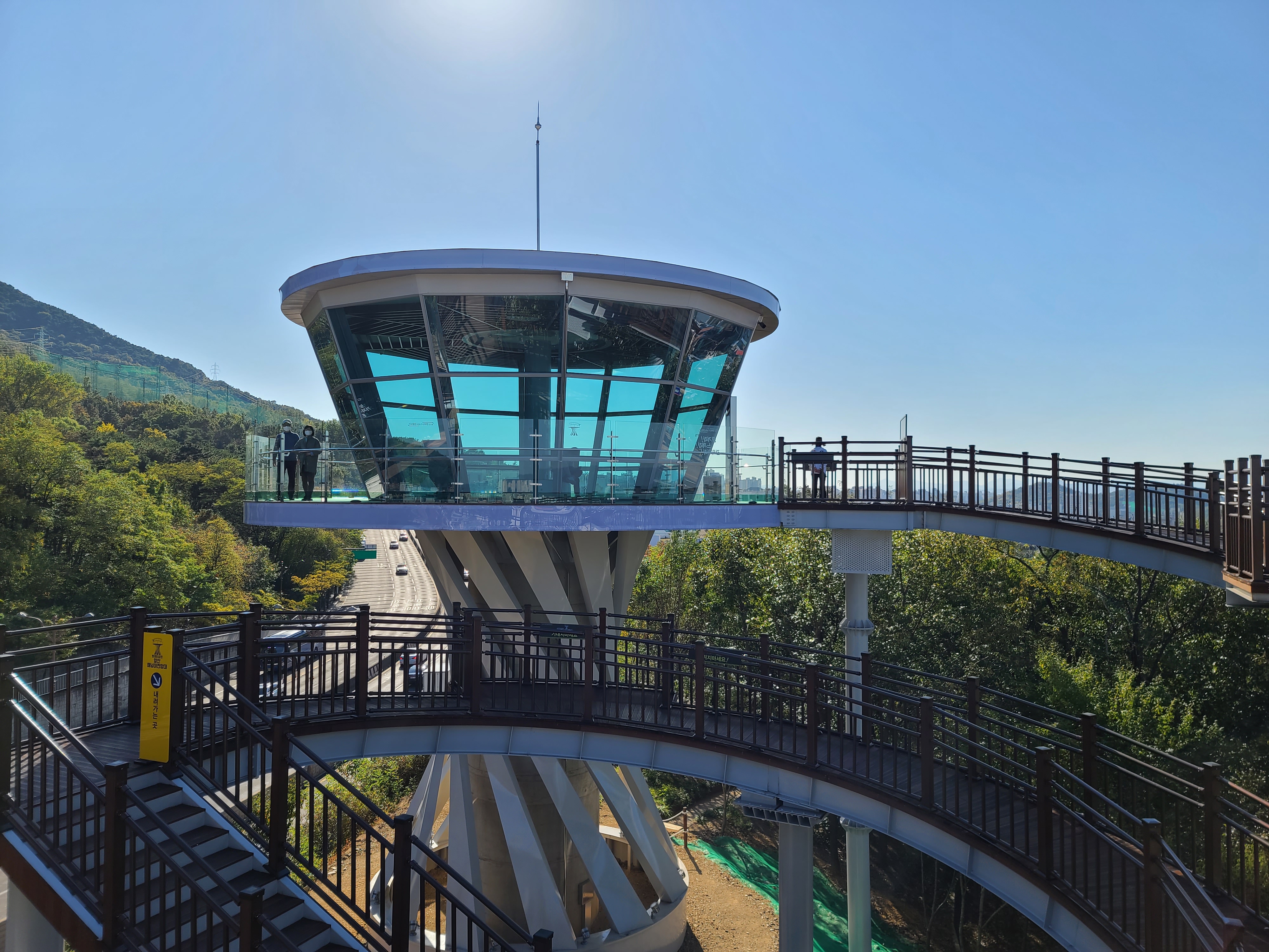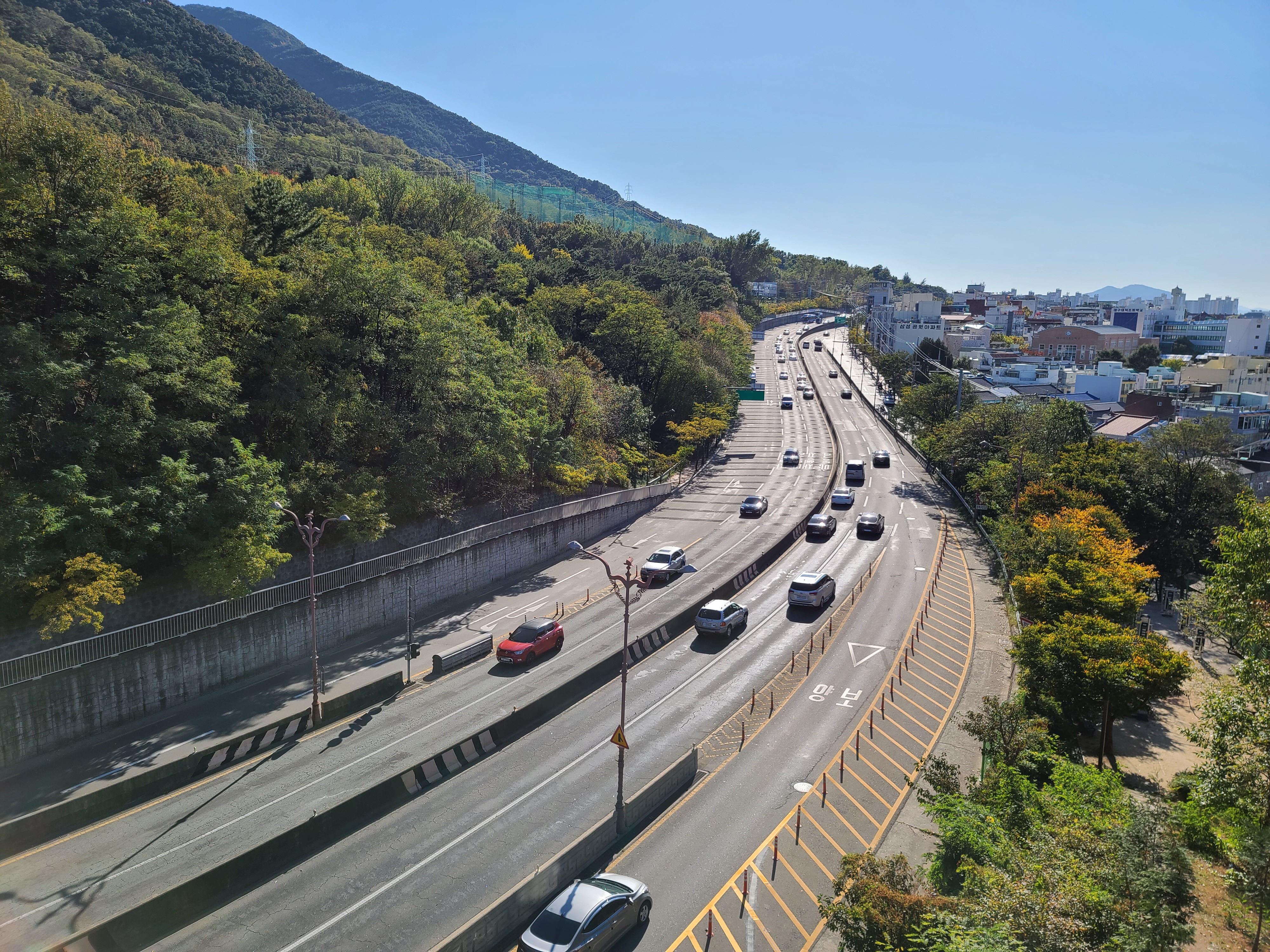 가을이라 맑은 하늘 아래 빨래터공원에서 전망을 보니 대구 시내가 잘 보이고, 멀리 두류공원 83타워도 보이더라고요. 앞산순환로를 끼고 있는 앞산 빨래터공원 해넘이전망대는 앞산순환로 도로의 모습도 사진으로 쉽게 담을 수 있었습니다.